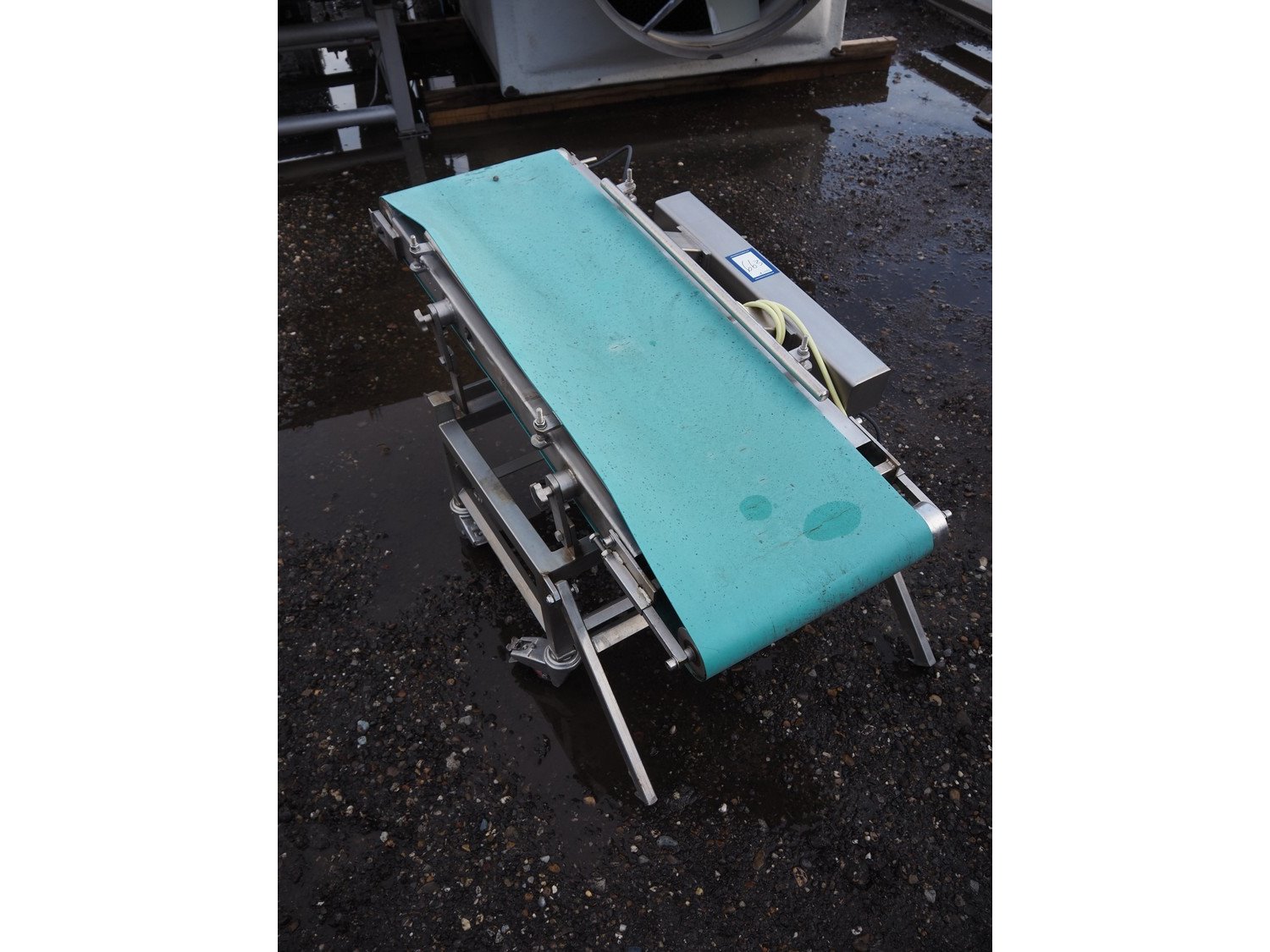 Mobile transport belt, s/s frame, plastic belt, belt width: 430 mm, total dimensions: 770 mm x 1320 mm x 800 mm.