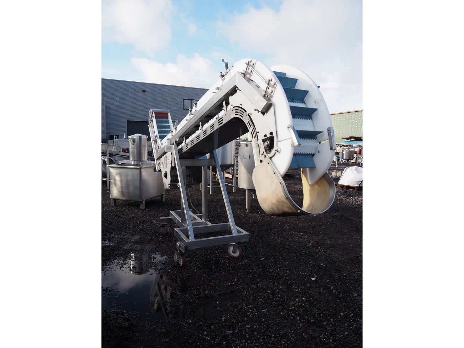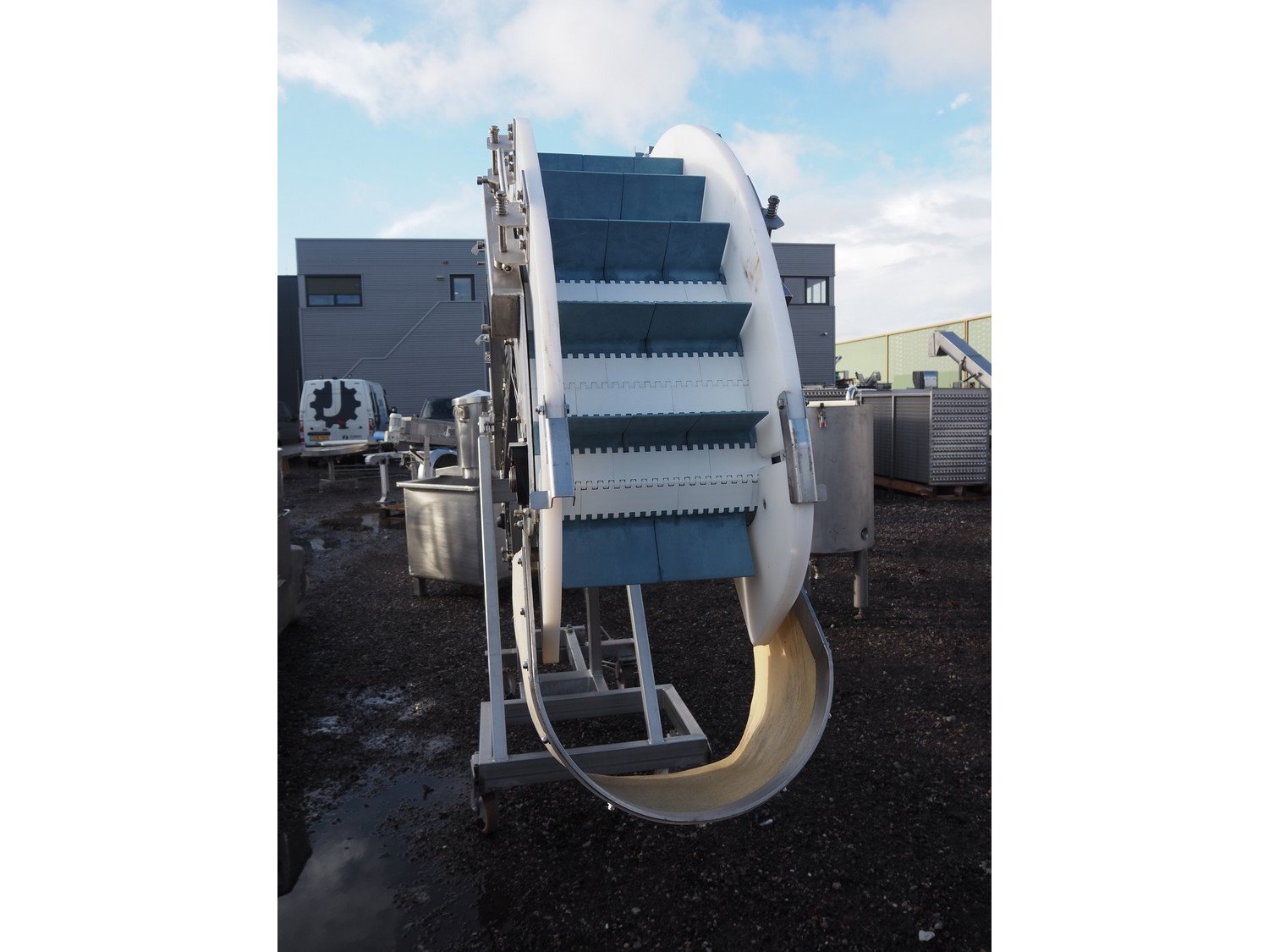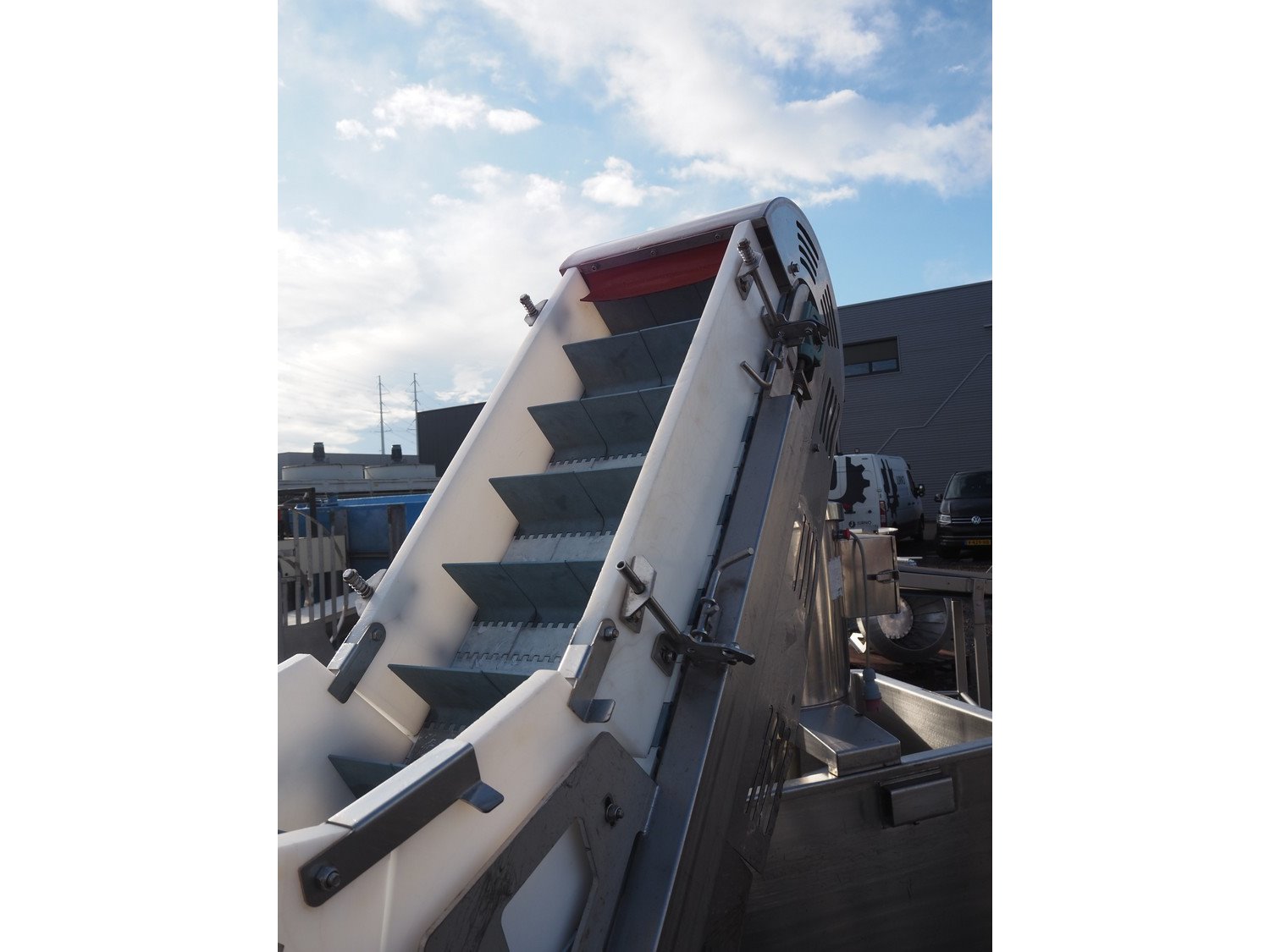 Mobile goose neck elevating belt, s/s frame, plastic belt with dividers, belt width: 370 mm, distance between dividers: 160 mm, divider height: 100 mm, total dimensions: 5200 mm x 900 mm x 2300 mm.