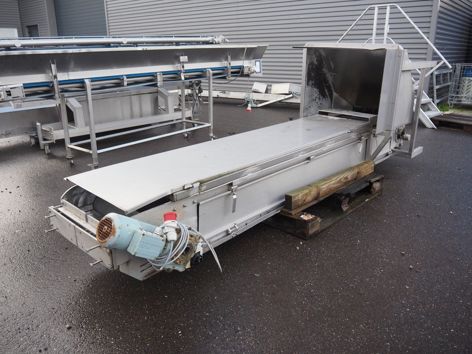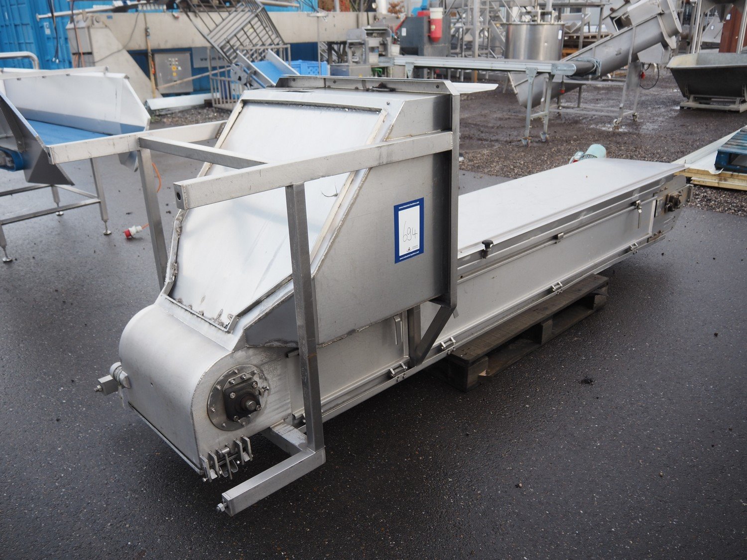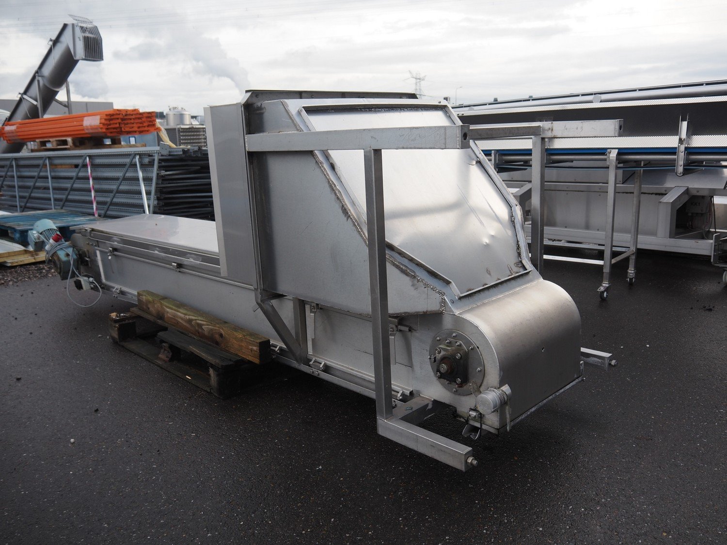 Elevating belt, s/s frame, plastic belt with dividers, belt width: 530 mm, divider height: 70 mm, distance between dividers: 260 mm, total dimensions: 3800 mm x 950 mm x 1300 mm.