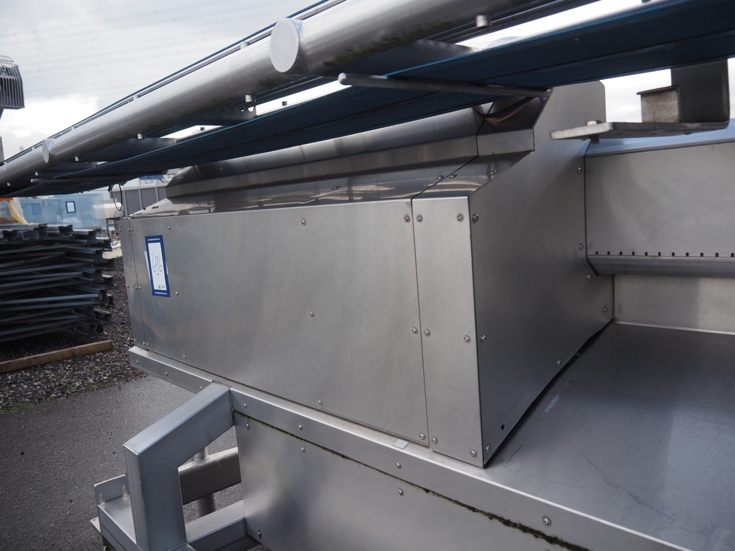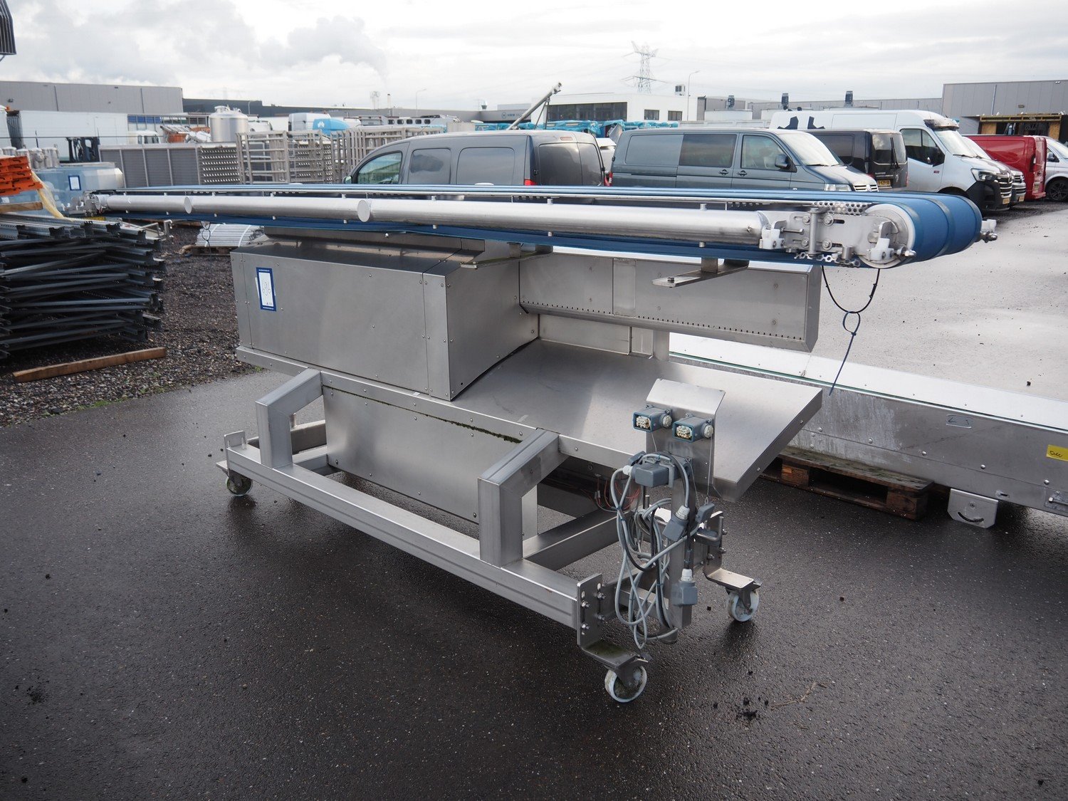 Mobile transport belt, s/s frame, plastic belt, belt width: 380 mm, total dimensions: 4700 mm x 980 mm x 1500 mm.