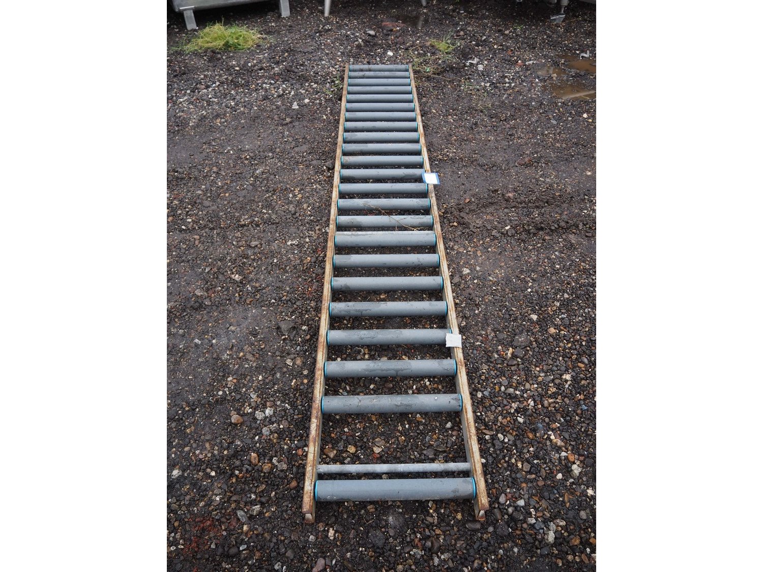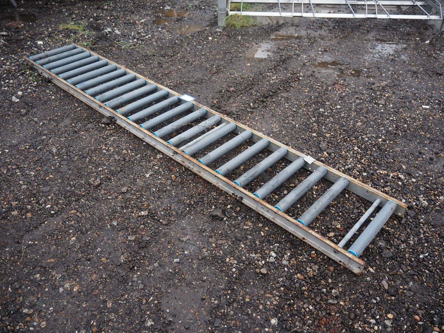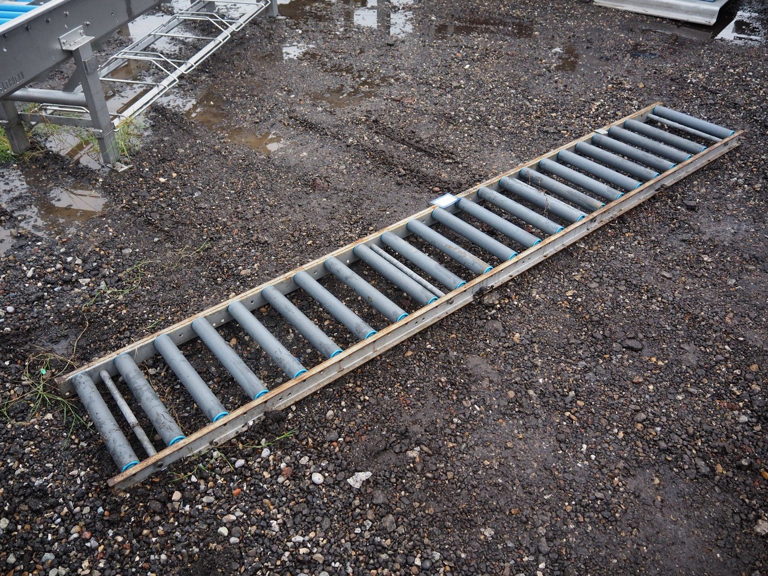 Roller conveyor, steel frame, plastic rollers, roller width: 400 mm, total dimensions: 3000 mm x 450 mm x 80 mm.