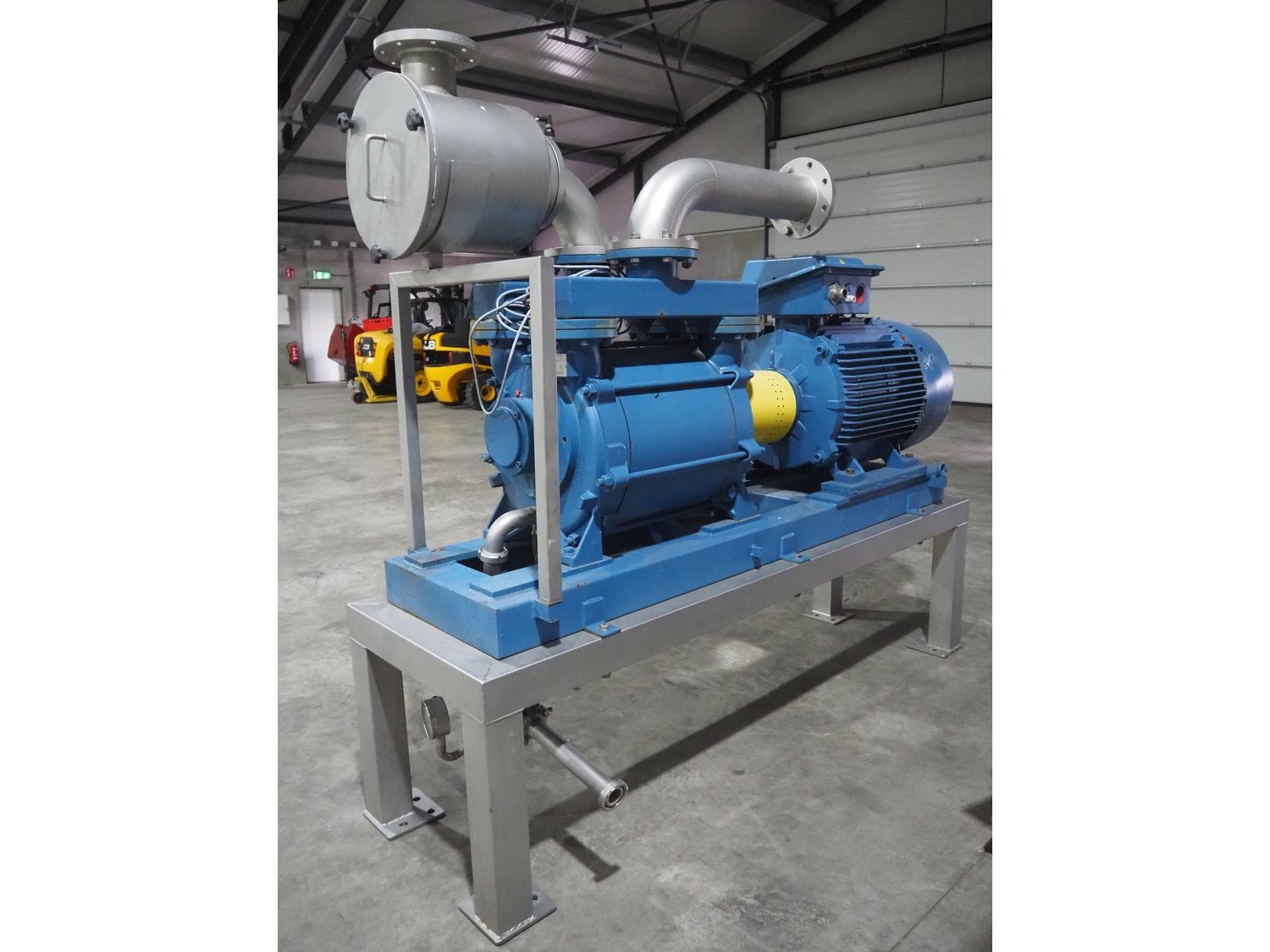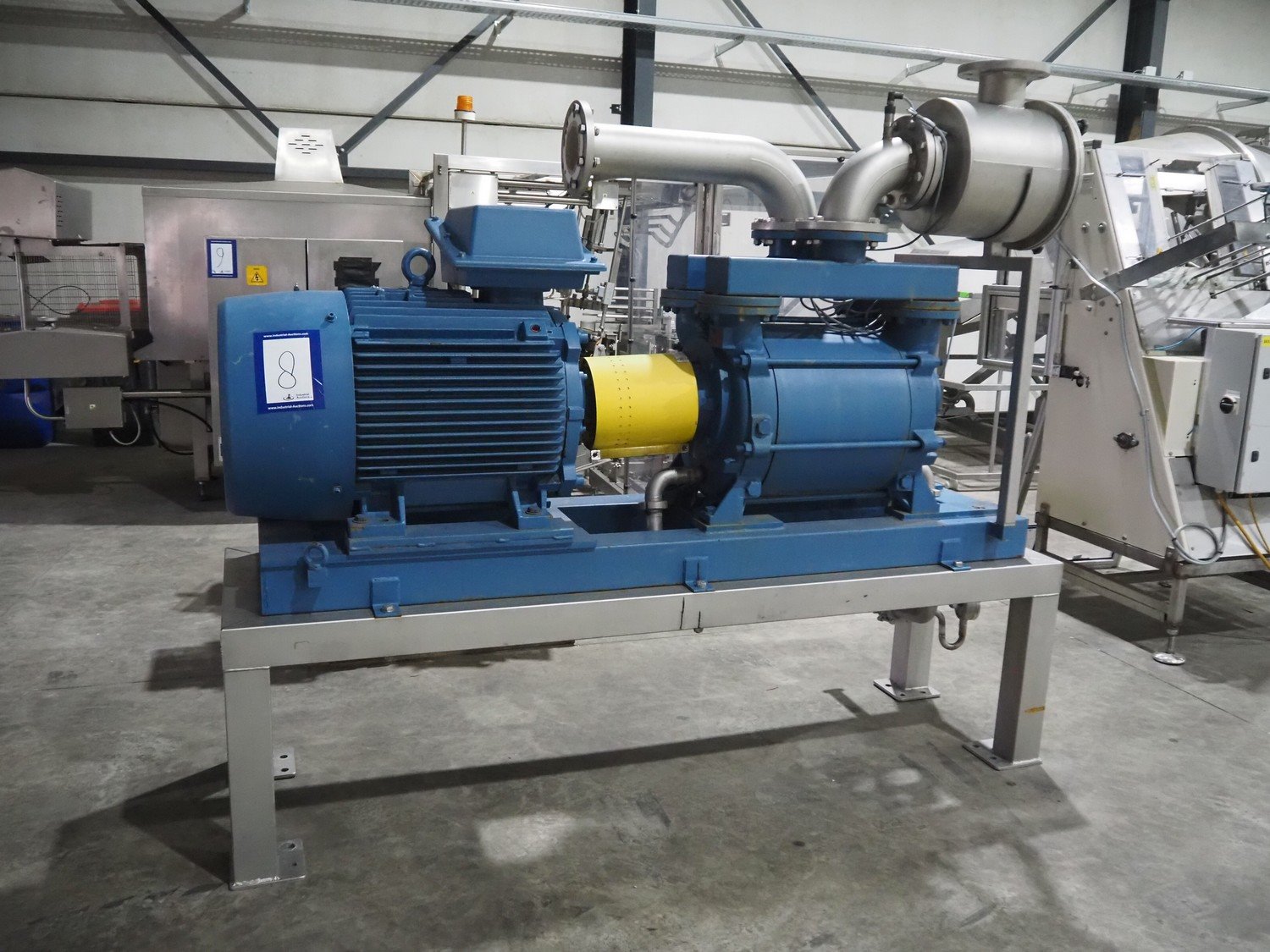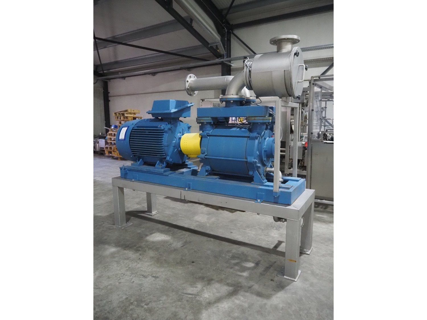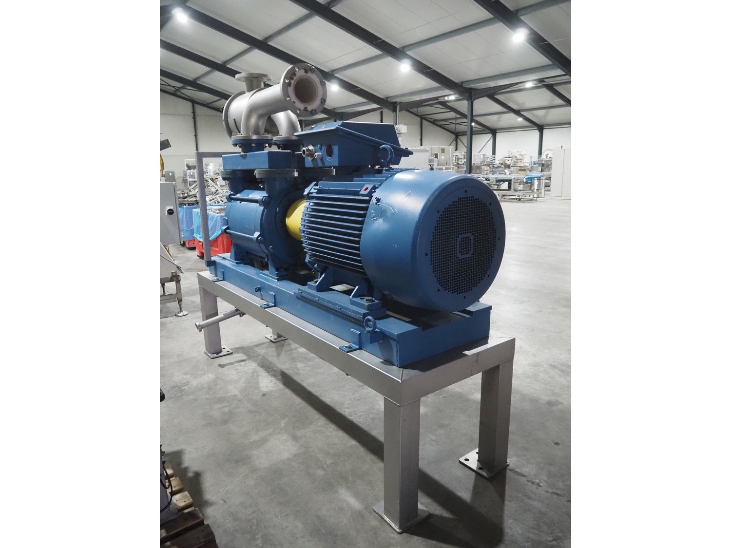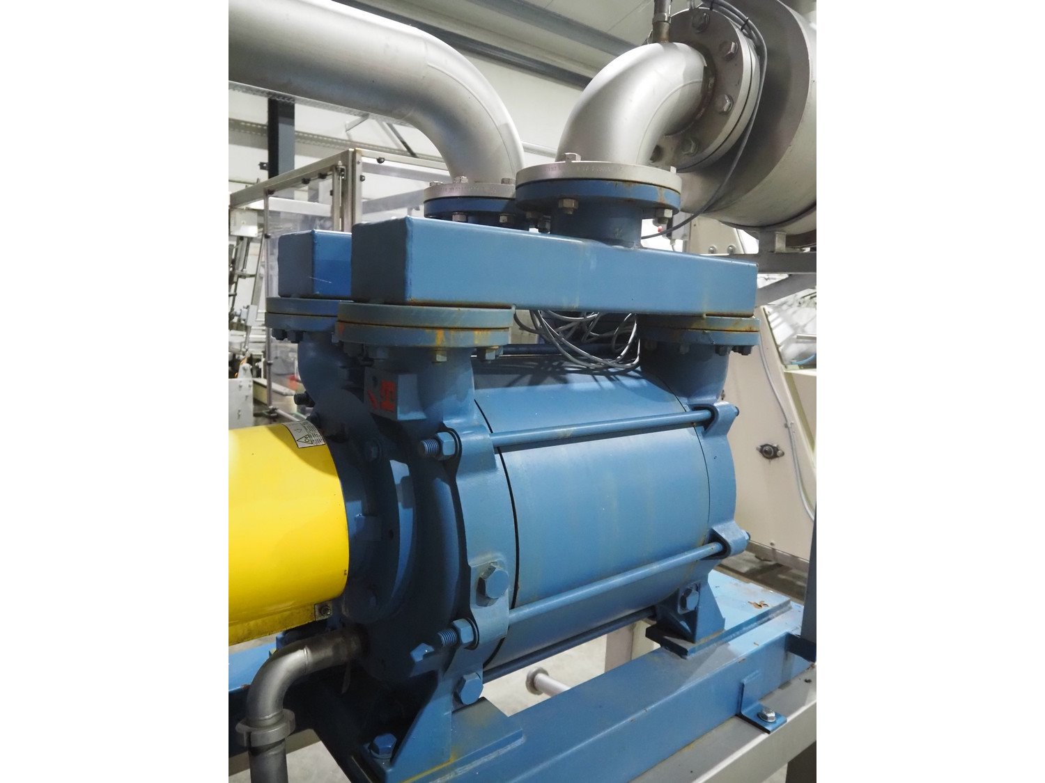 Travaini vacuum pump on s/s frame, type: TRSE 125-1550/XC/RZ, serial number: GG307, year of construction: 2018, weight: 1334 kg, pipe diameter: 120 mm, total dimensions: 2350 mm x 770 mm x 2050 mm.
