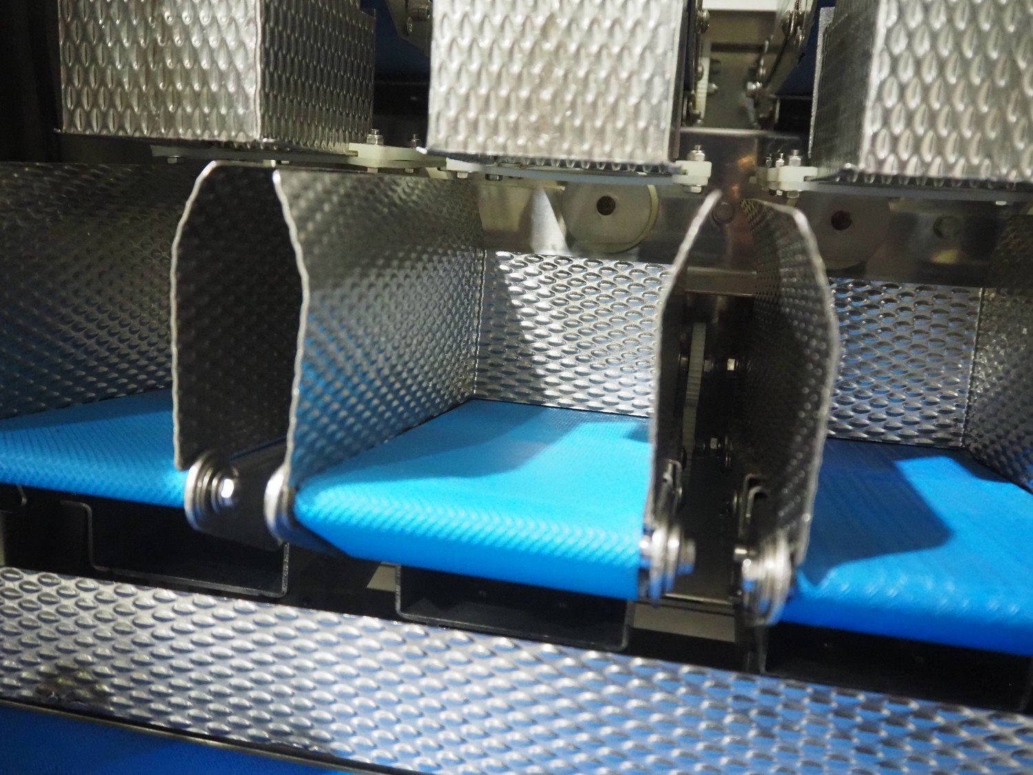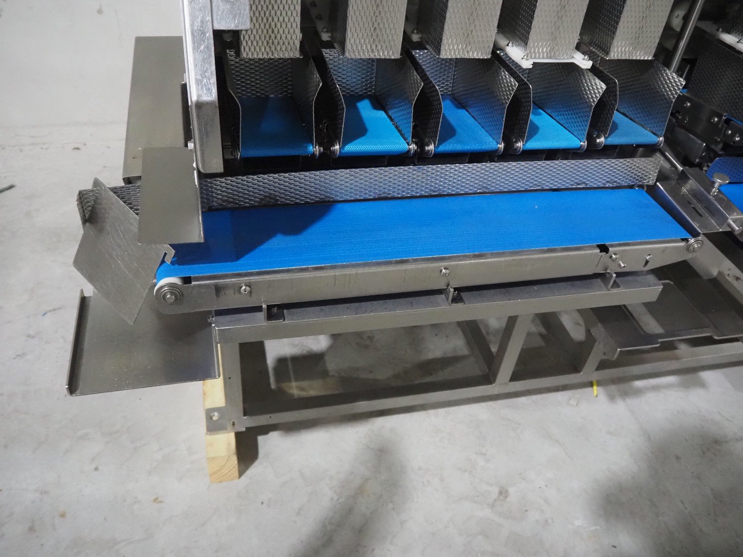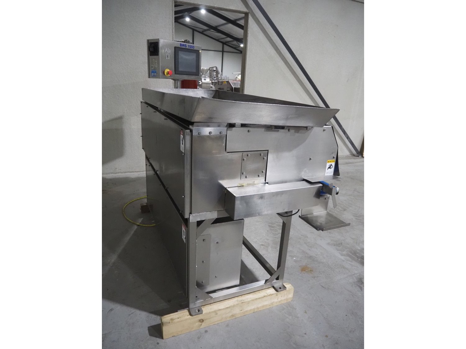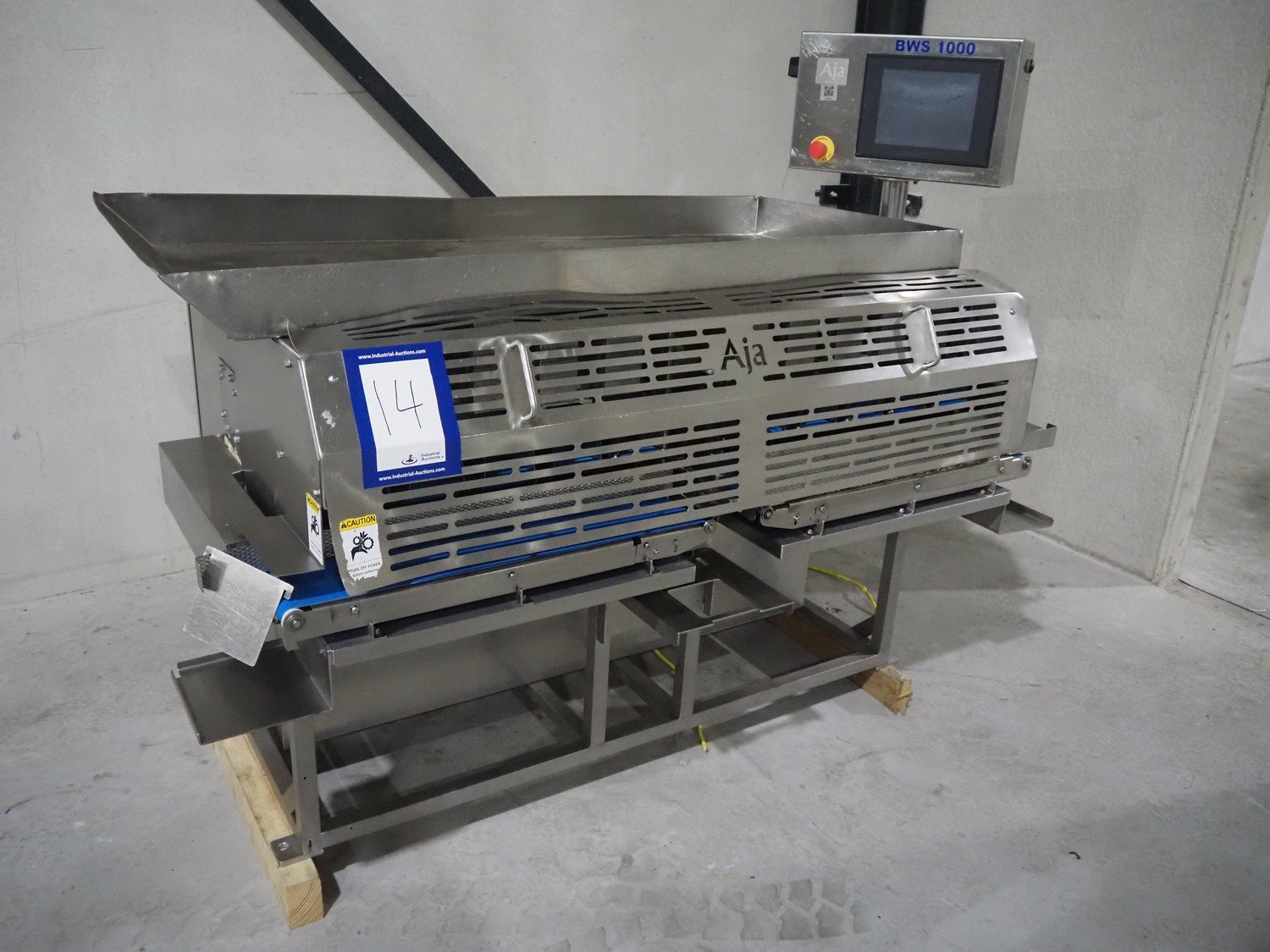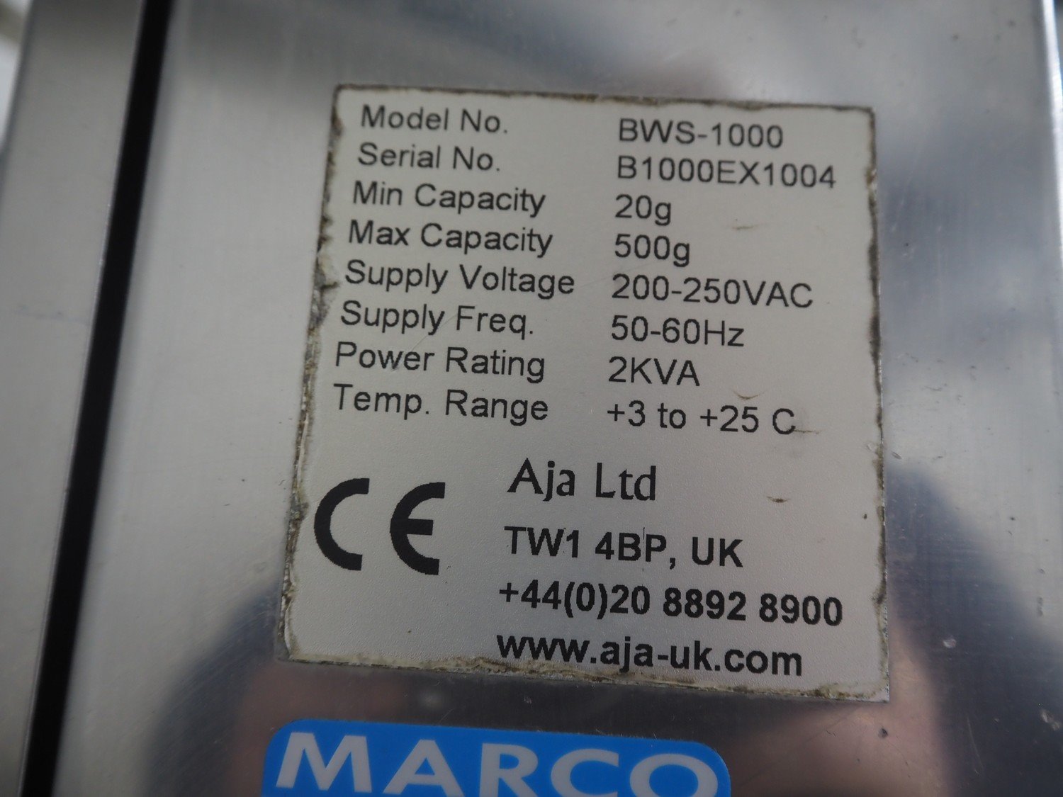 Aja Ltd double 5-heads linear batch weigher, model number: BWS-1000, serial number: B1000EX1004, 200-250 VAC, 50-60 Hz, 2 KVA, minimum capacity: 20 gram, maximum capacity: 500 gram, dimensions: 1800 mm x 1080 mm x 1480 mm. Cover damaged.