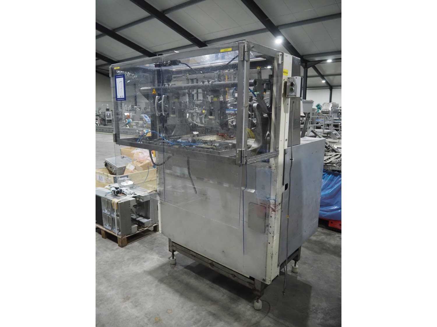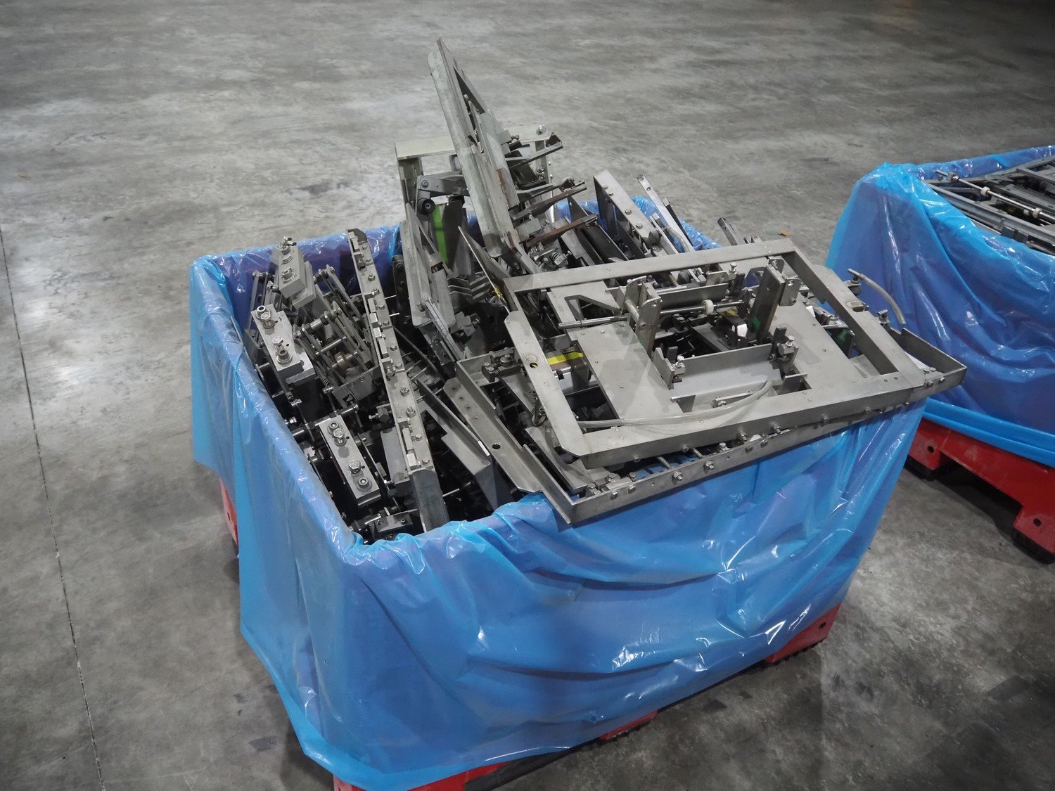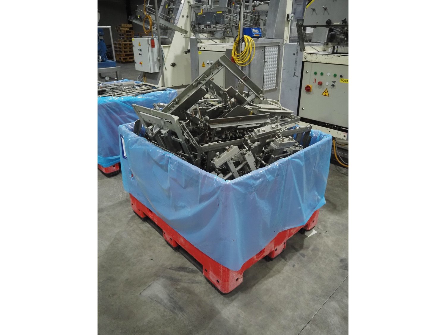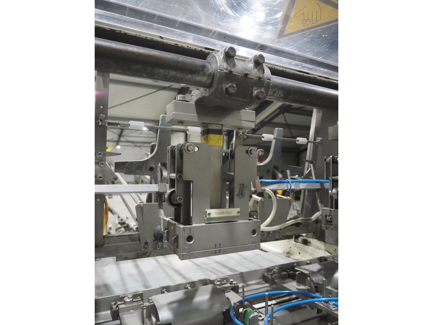LPF Verpakkingen B.V. carton erector, 2 lanes, dimensions cartons: 150 mm x 98 mm x 30 mm, with Becker vacuum pump, type: BOL/4X, total dimensions: 1500 mm x 1350 mm x 2140 mm. With pallet box with large amount of parts for carton erector, dimensions: 1200 mm x 1000 mm x 1050 mm.