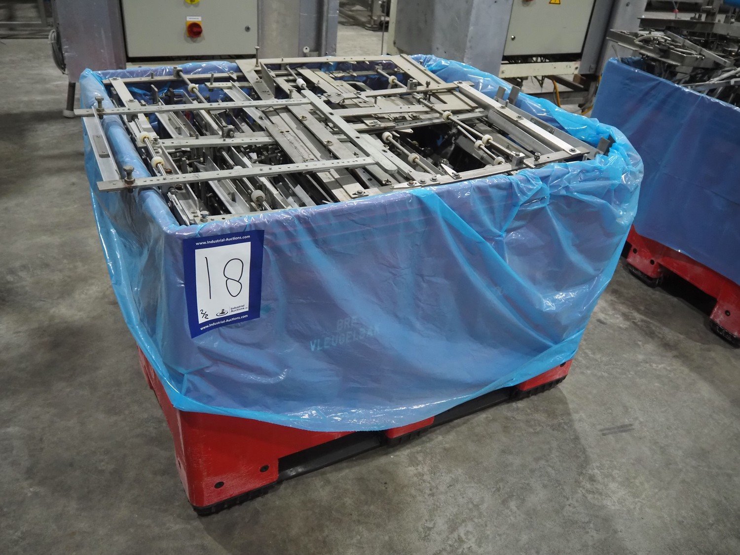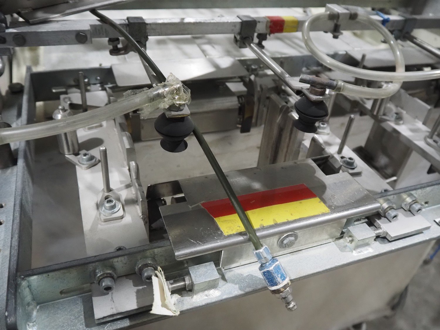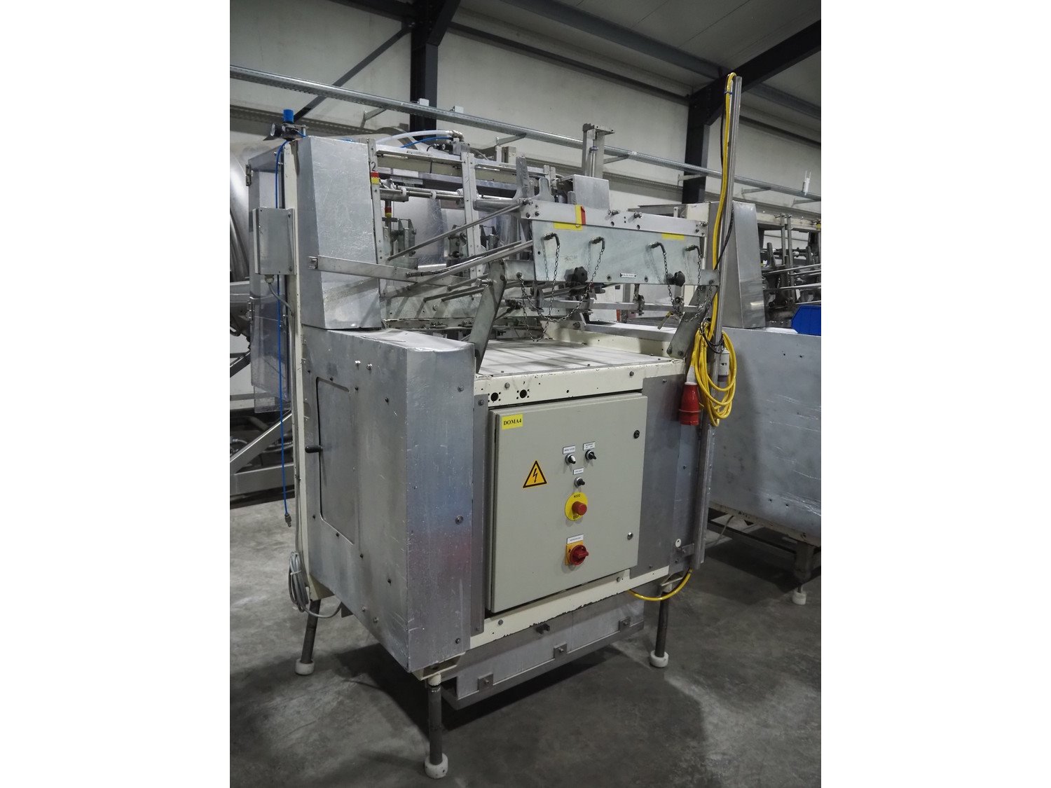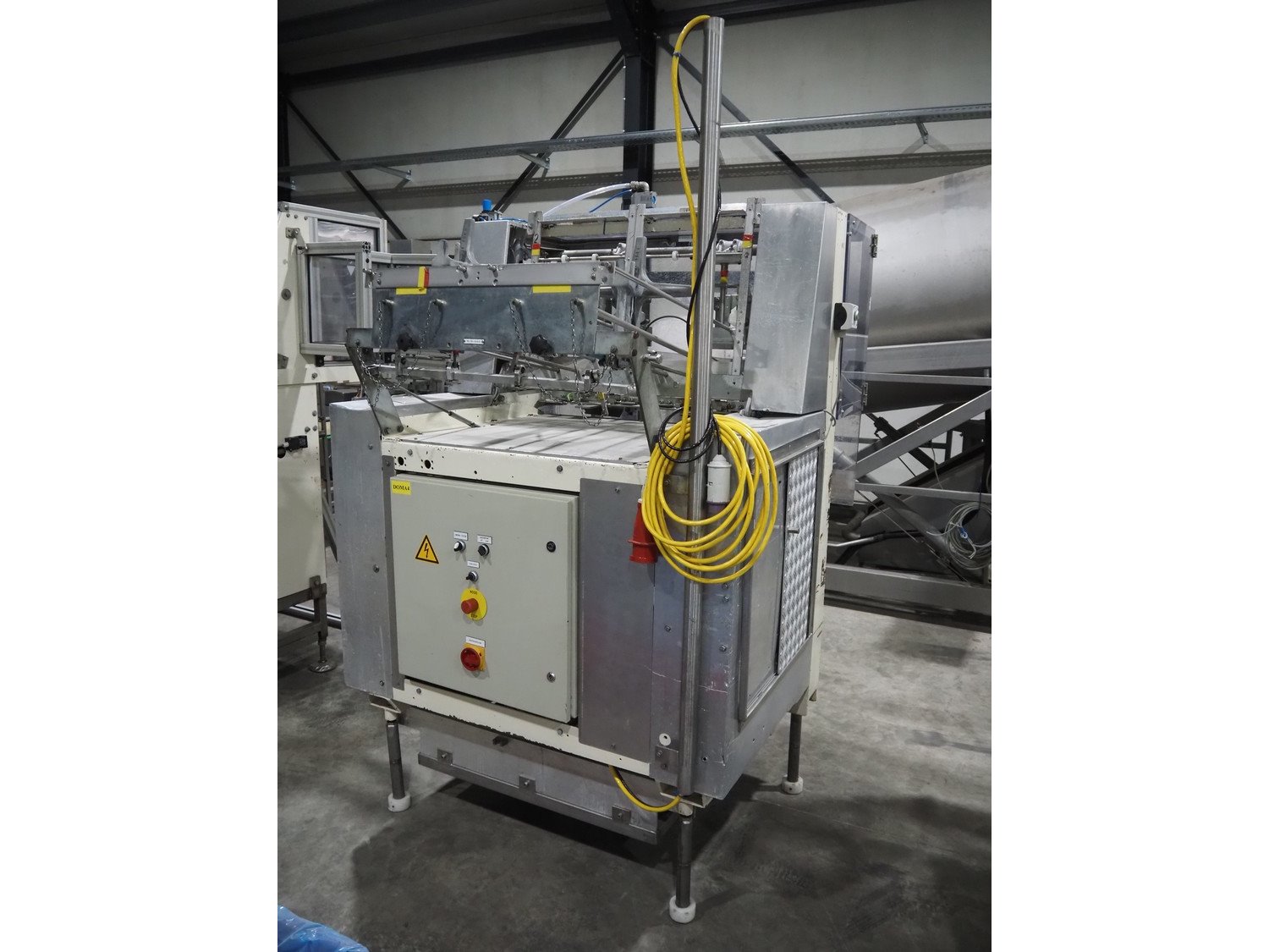 LPF Verpakkingen B.V. carton erector, 2 lanes, dimensions cartons: 150 mm x 98 mm x 30 mm, with Becker vacuum pump, type: BOL/4X, total dimensions: 1500 mm x 1350 mm x 2140 mm. With pallet box with large amount of parts for carton erector, dimensions: 1200 mm x 1000 mm x 1050 mm.