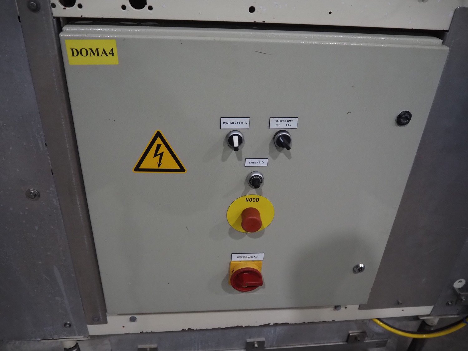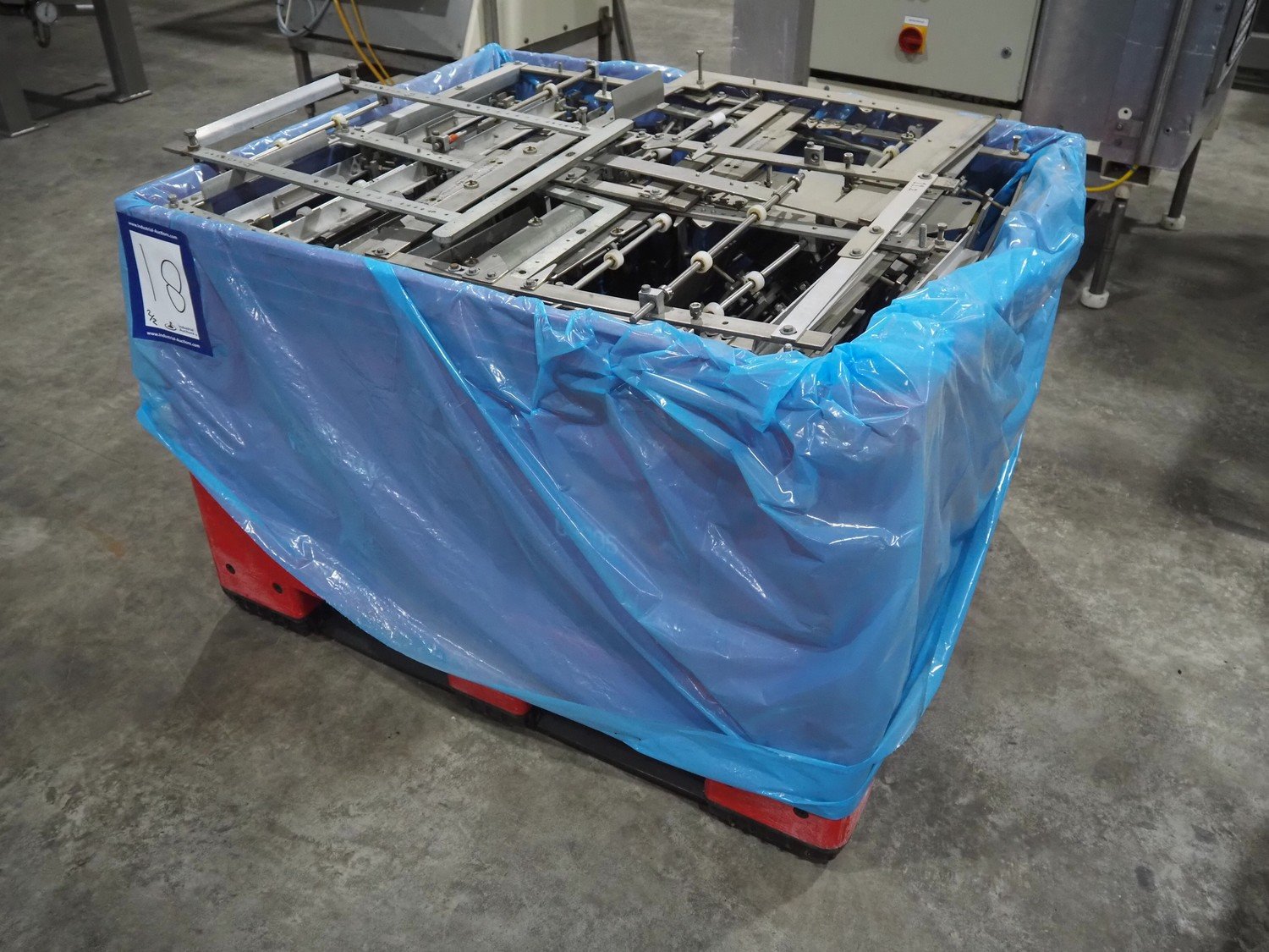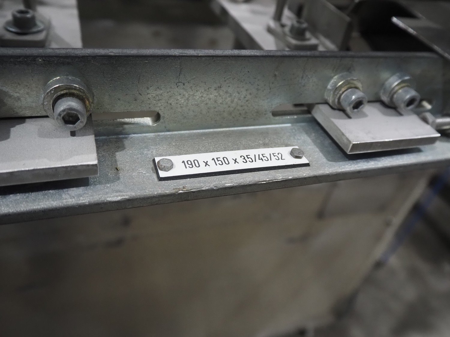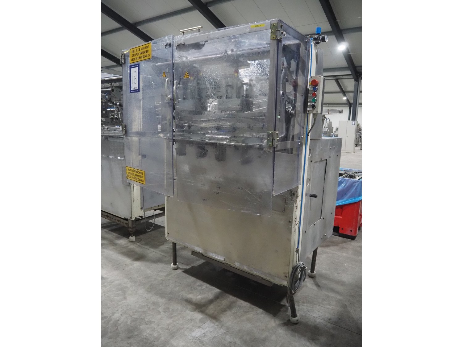 LPF Verpakkingen B.V. carton erector, 2 lanes, dimensions cartons: 150 mm x 98 mm x 30 mm, with Becker vacuum pump, type: BOL/4X, total dimensions: 1500 mm x 1350 mm x 2140 mm. With pallet box with large amount of parts for carton erector, dimensions: 1200 mm x 1000 mm x 1050 mm.