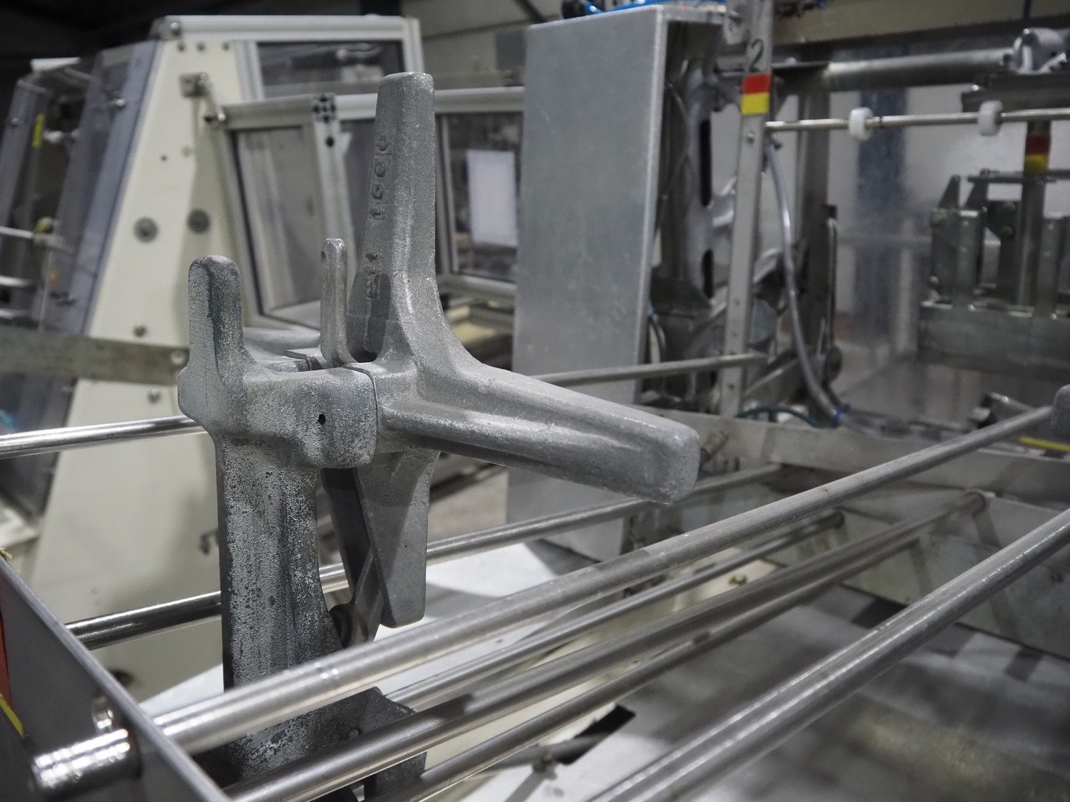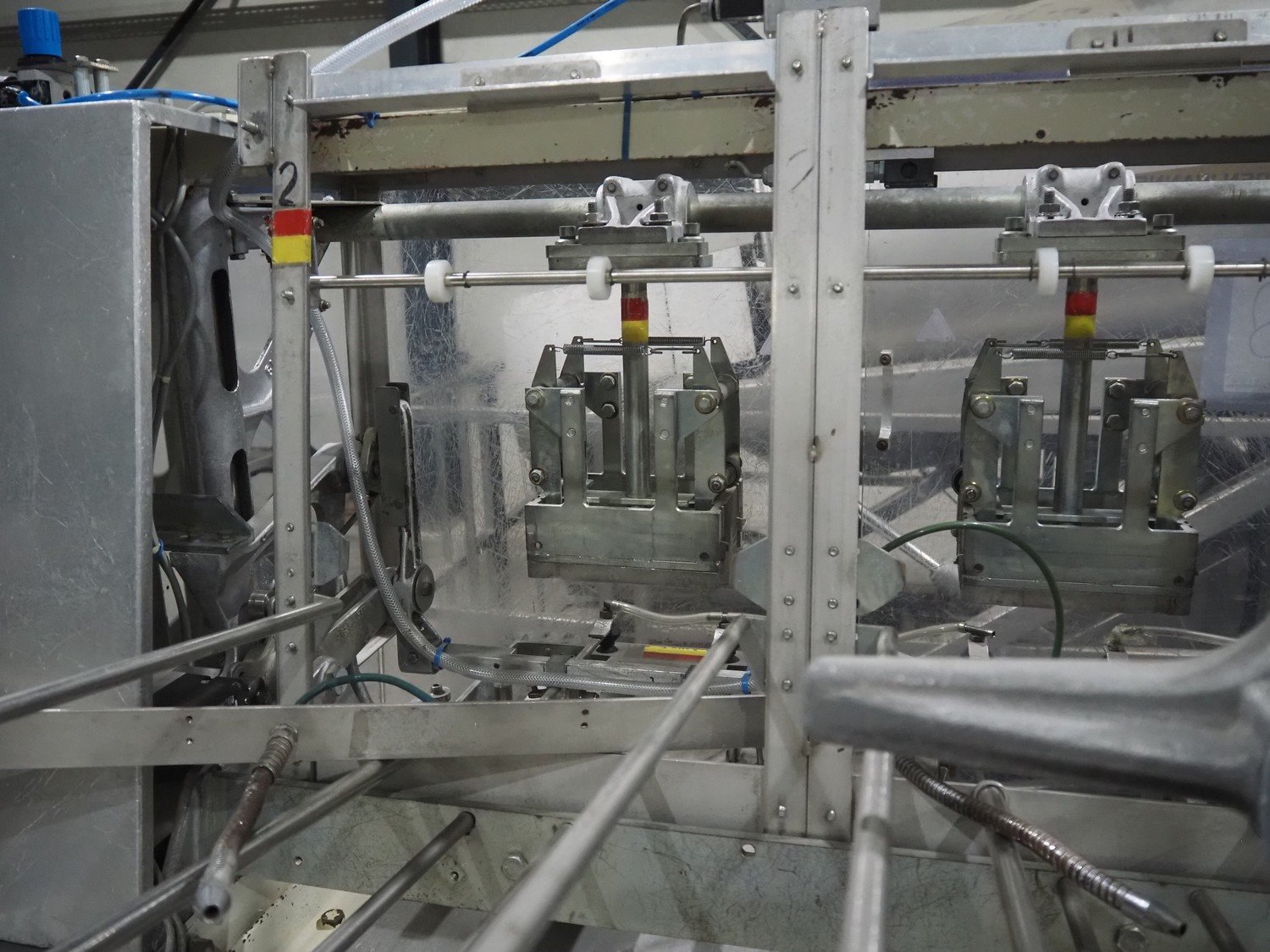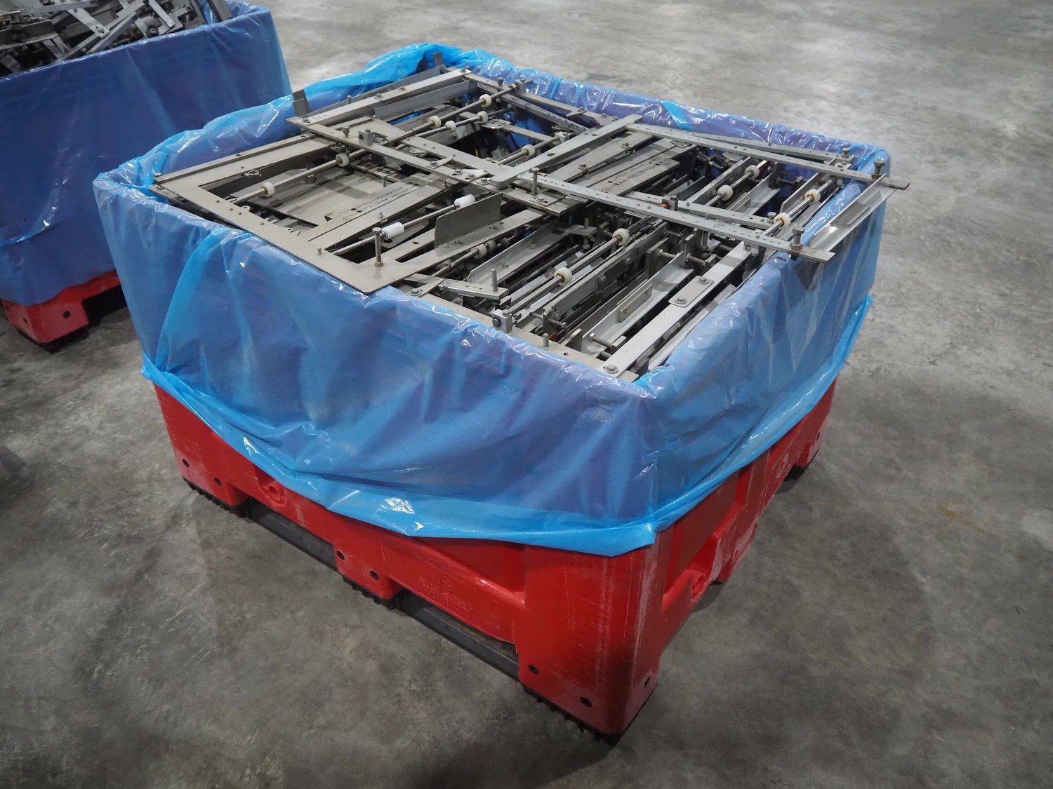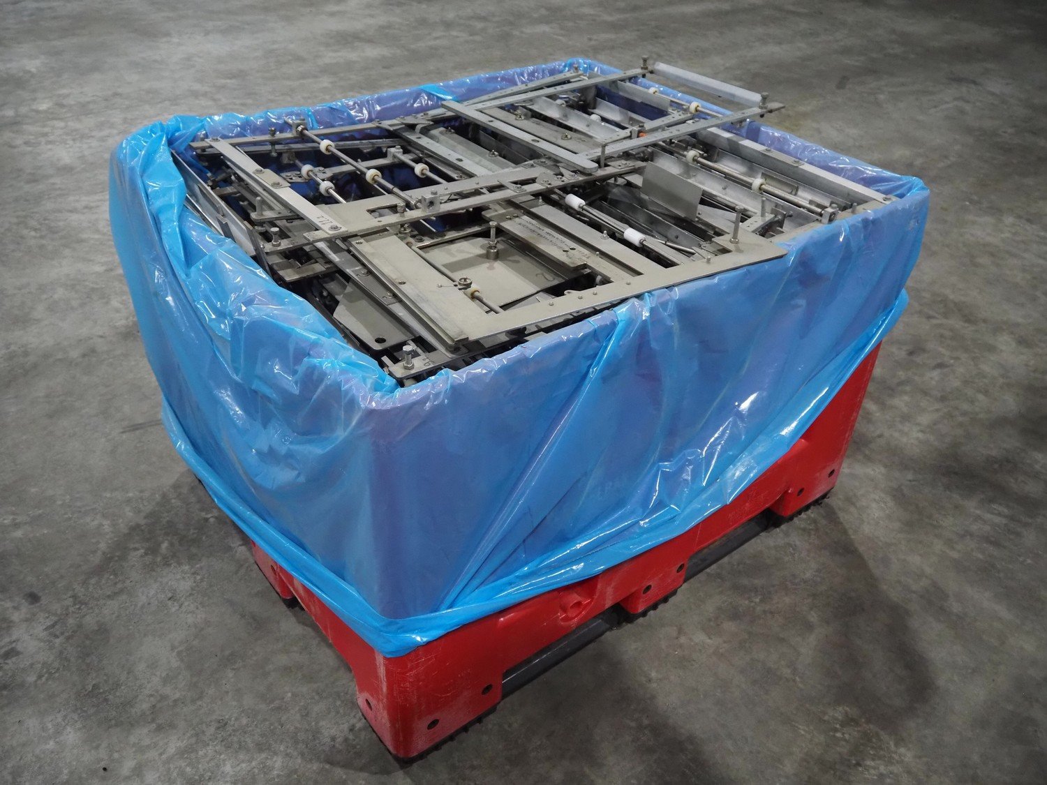 LPF Verpakkingen B.V. carton erector, 2 lanes, dimensions cartons: 150 mm x 98 mm x 30 mm, with Becker vacuum pump, type: BOL/4X, total dimensions: 1500 mm x 1350 mm x 2140 mm. With pallet box with large amount of parts for carton erector, dimensions: 1200 mm x 1000 mm x 1050 mm.