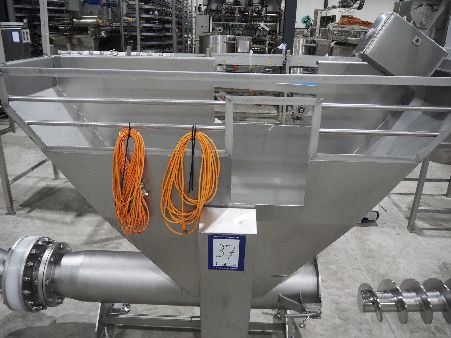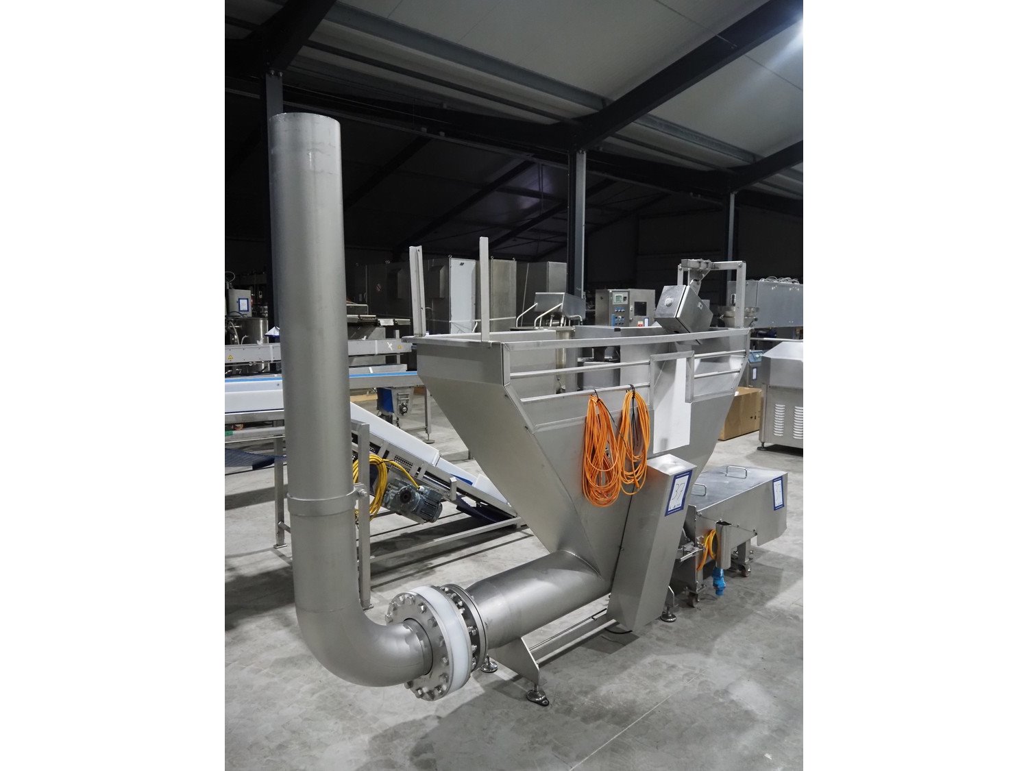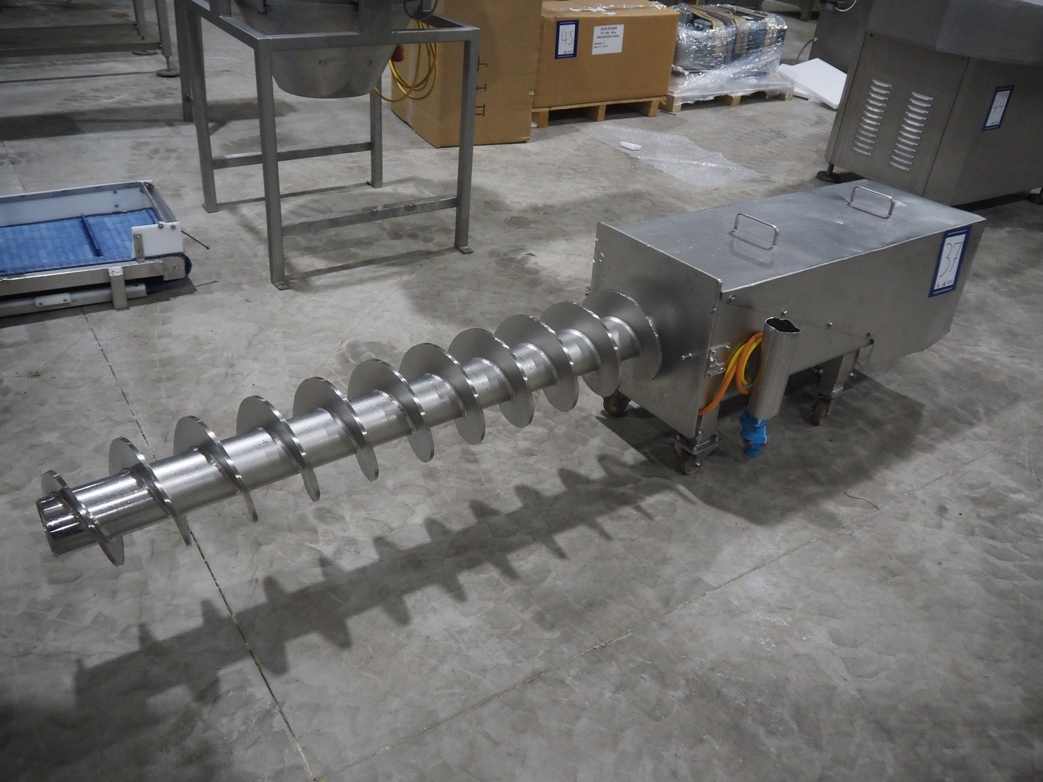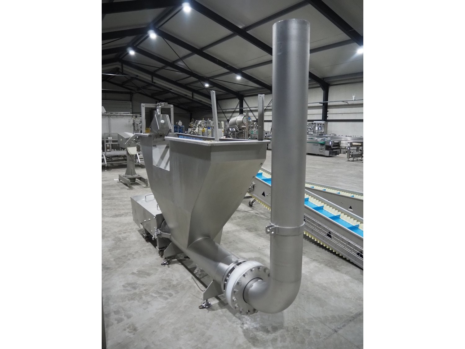 Infeed funnel with mobile screw and product pump., screw diameter: 260 mm, tier: 110 mm, clearance: 1790 mm x 455 mm, dimensions screw trolley: 2500 mm x 550 mm x 630 mm, dimensions funnel: 2500 mm x 700 mm x 2150 mm.