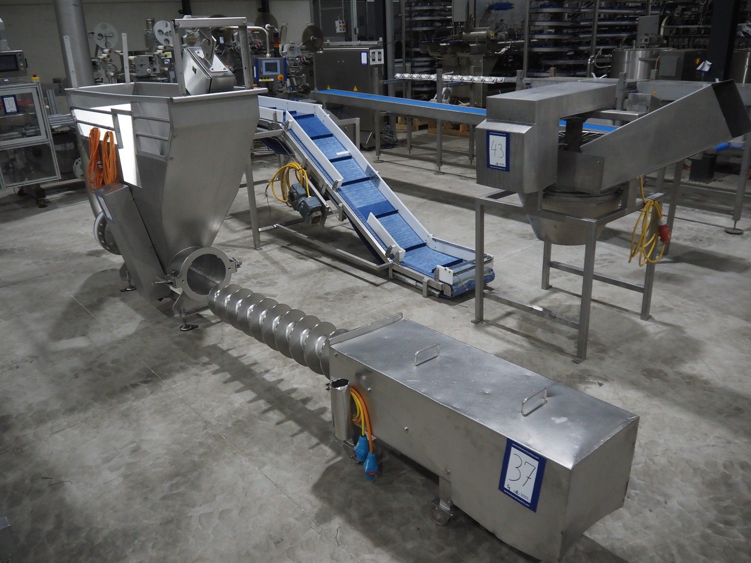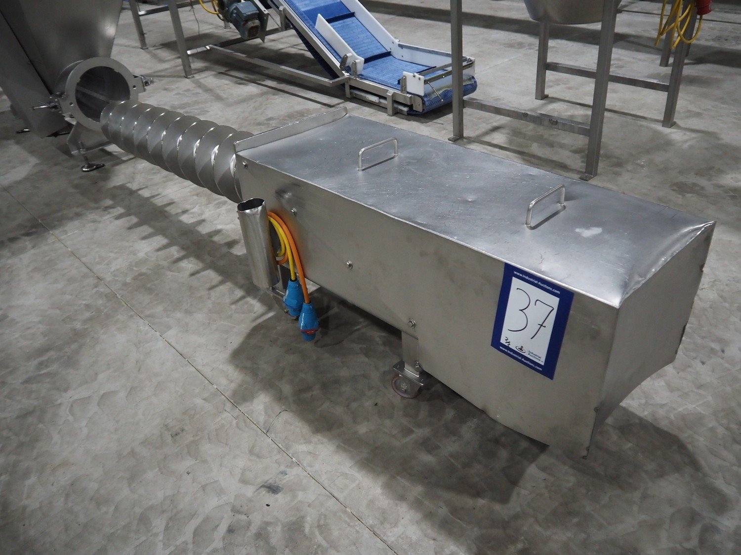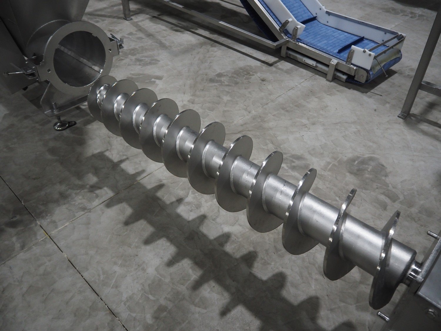 Infeed funnel with mobile screw and product pump., screw diameter: 260 mm, tier: 110 mm, clearance: 1790 mm x 455 mm, dimensions screw trolley: 2500 mm x 550 mm x 630 mm, dimensions funnel: 2500 mm x 700 mm x 2150 mm.