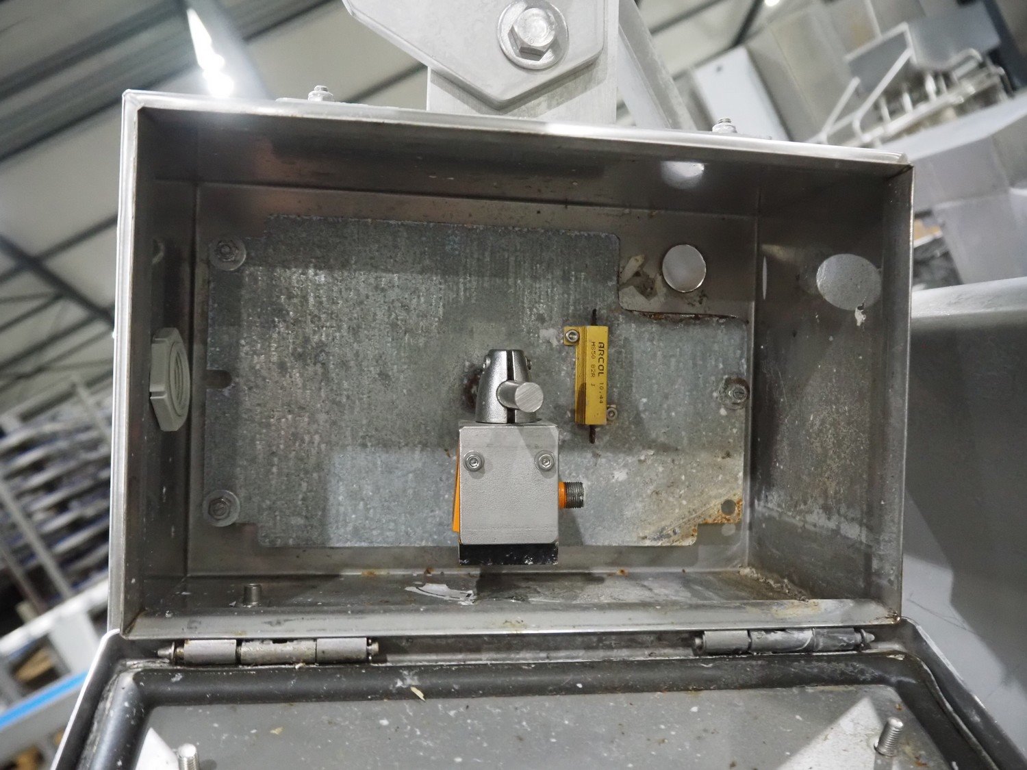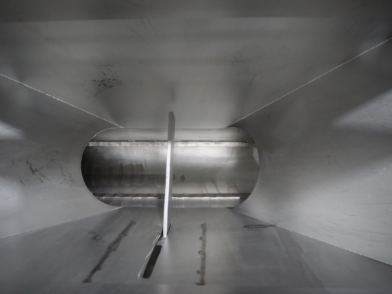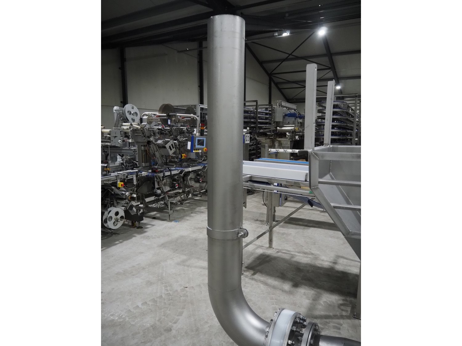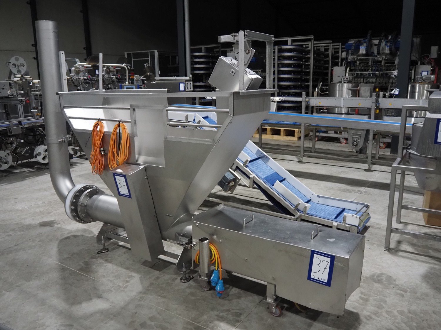 Infeed funnel with mobile screw and product pump., screw diameter: 260 mm, tier: 110 mm, clearance: 1790 mm x 455 mm, dimensions screw trolley: 2500 mm x 550 mm x 630 mm, dimensions funnel: 2500 mm x 700 mm x 2150 mm.