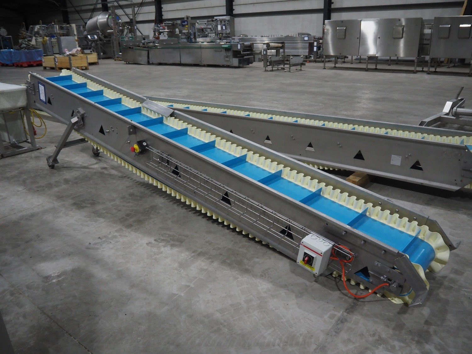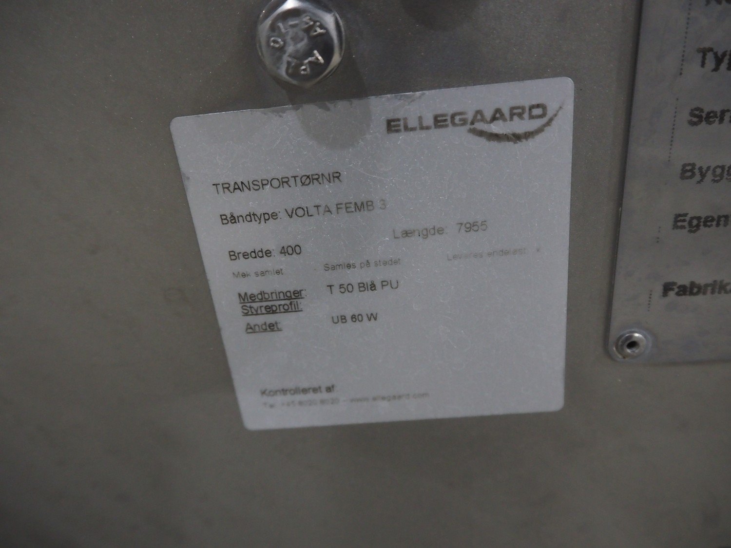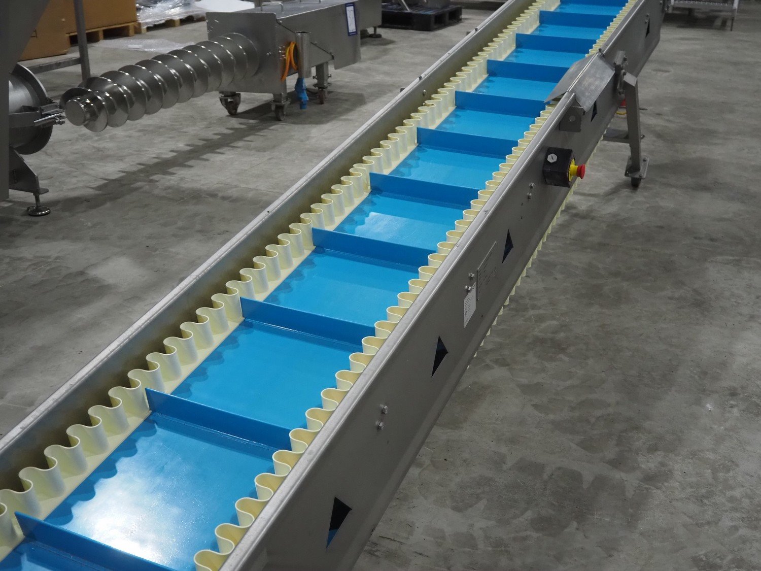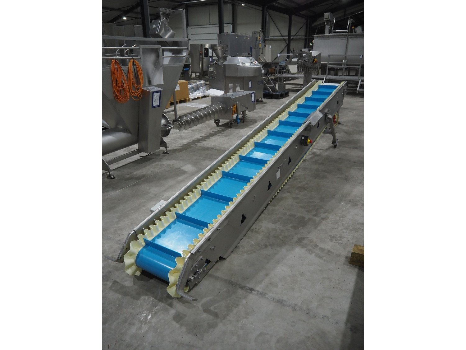 Ellegaard transport belt, plastic belt, belt width: 285 mm, distance between dividers: 290 mm, divider height: 50 mm, total dimensions: 4000 mm x 750 mm x 950 mm.