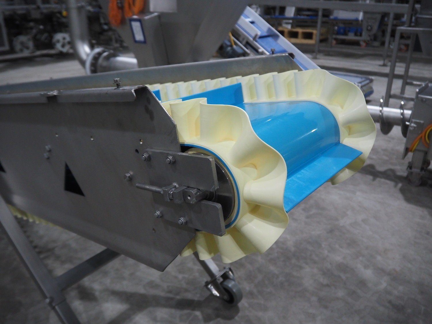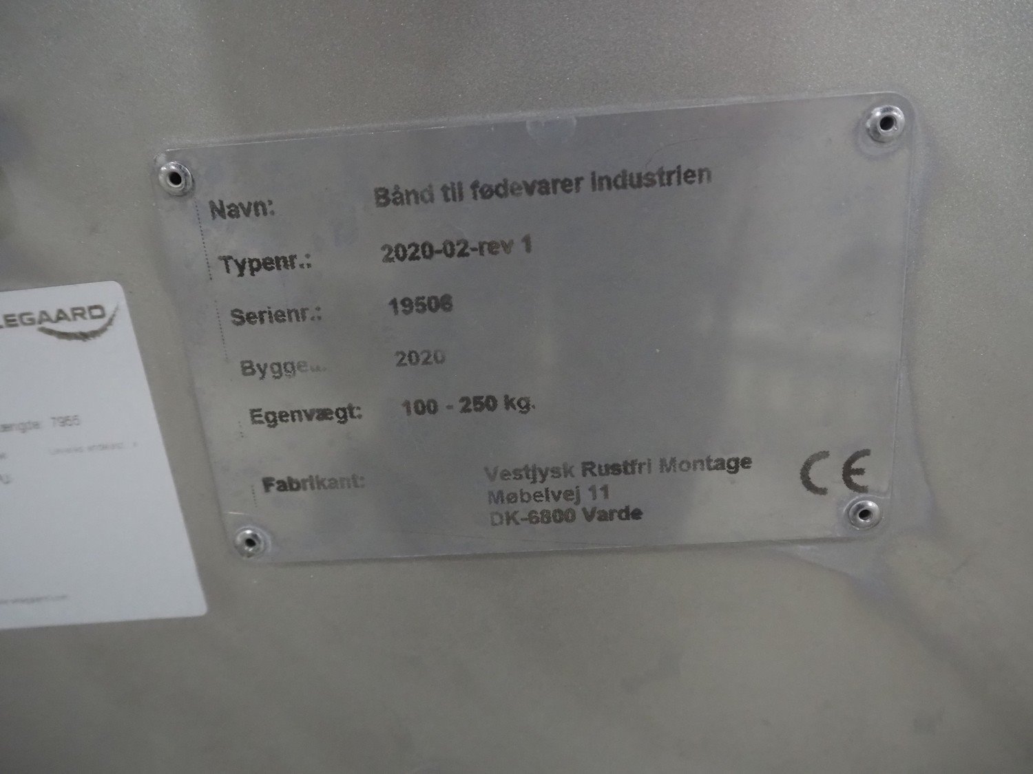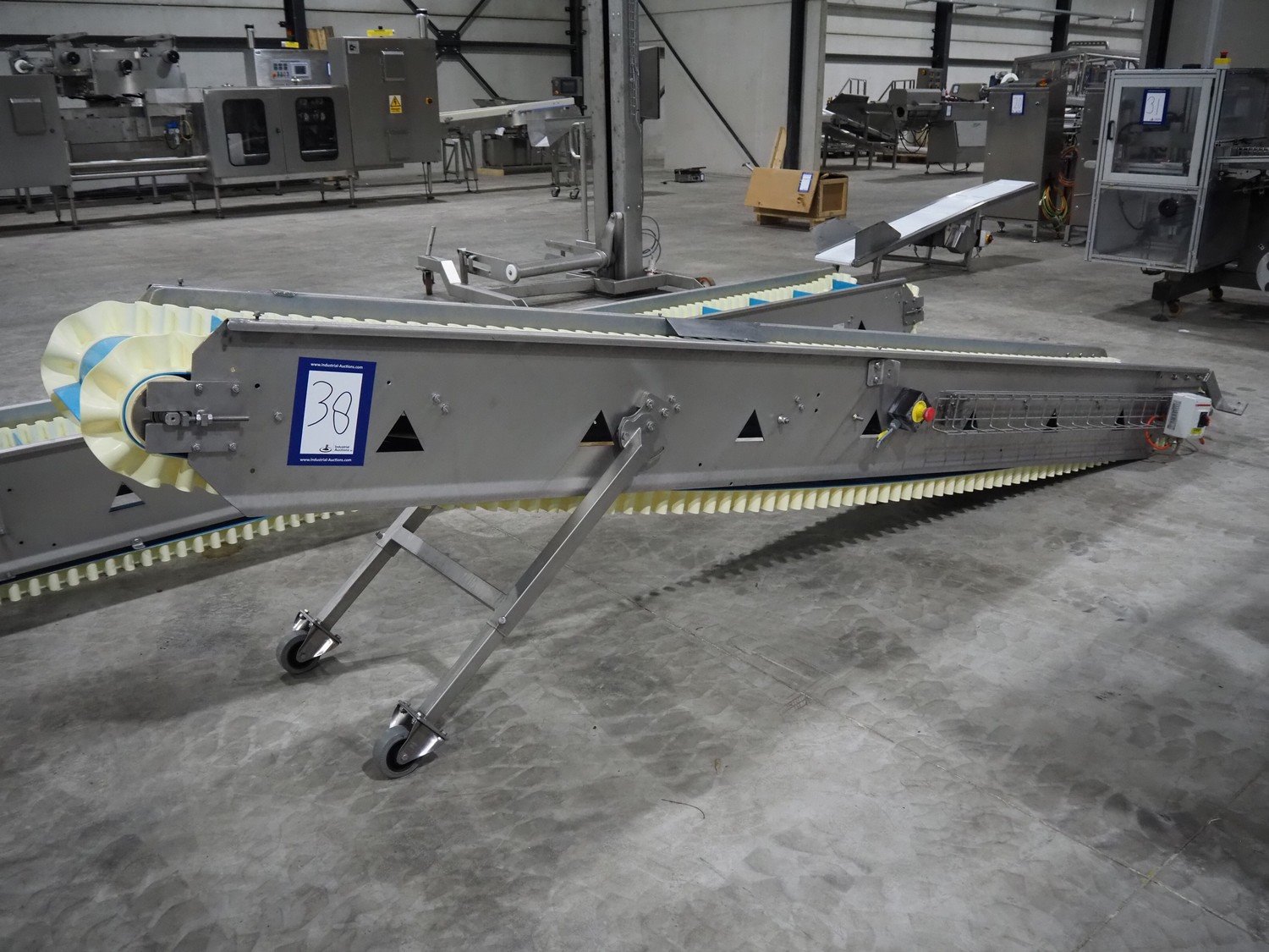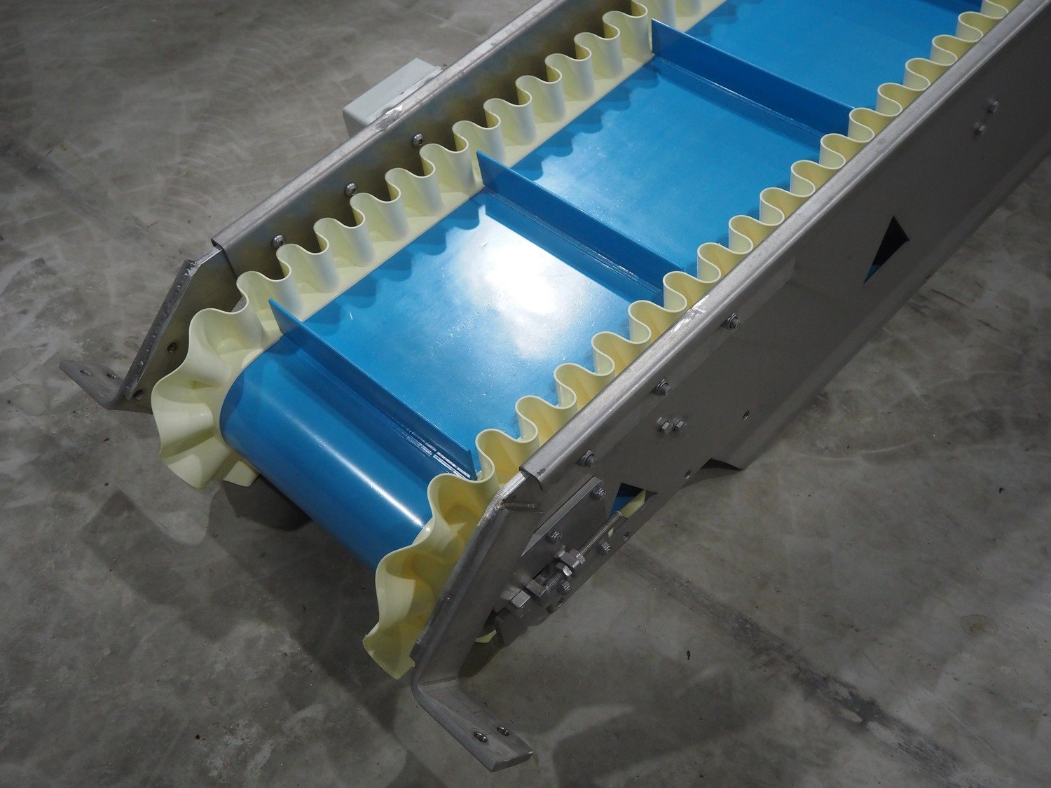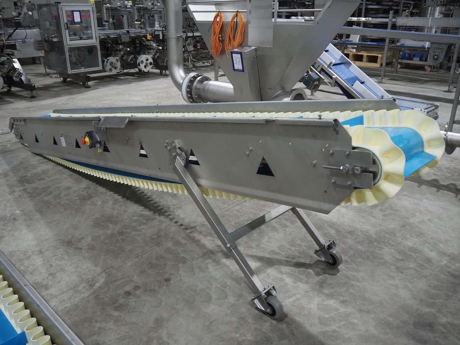 Ellegaard transport belt, plastic belt, belt width: 285 mm, distance between dividers: 290 mm, divider height: 50 mm, total dimensions: 4000 mm x 750 mm x 950 mm.