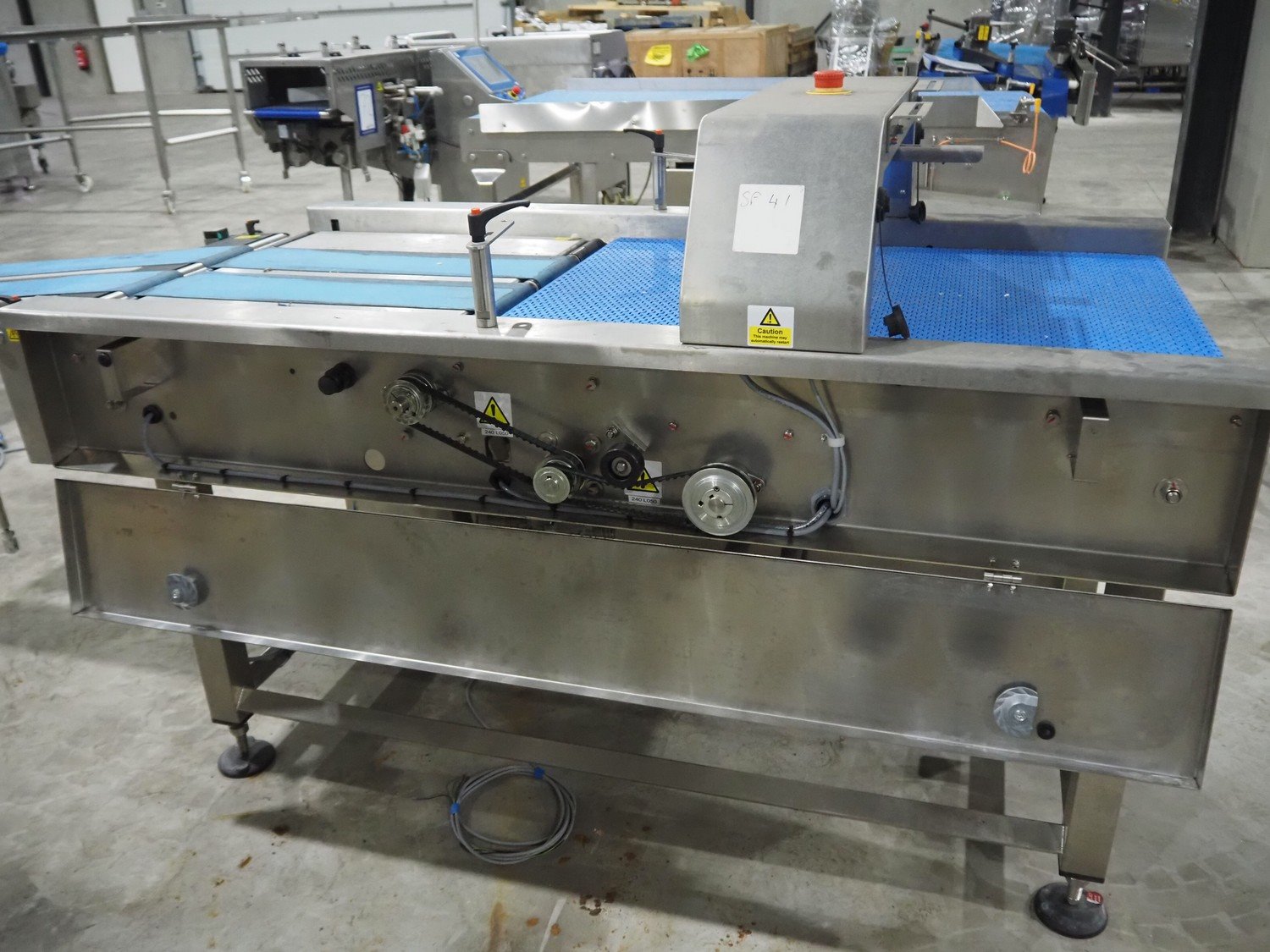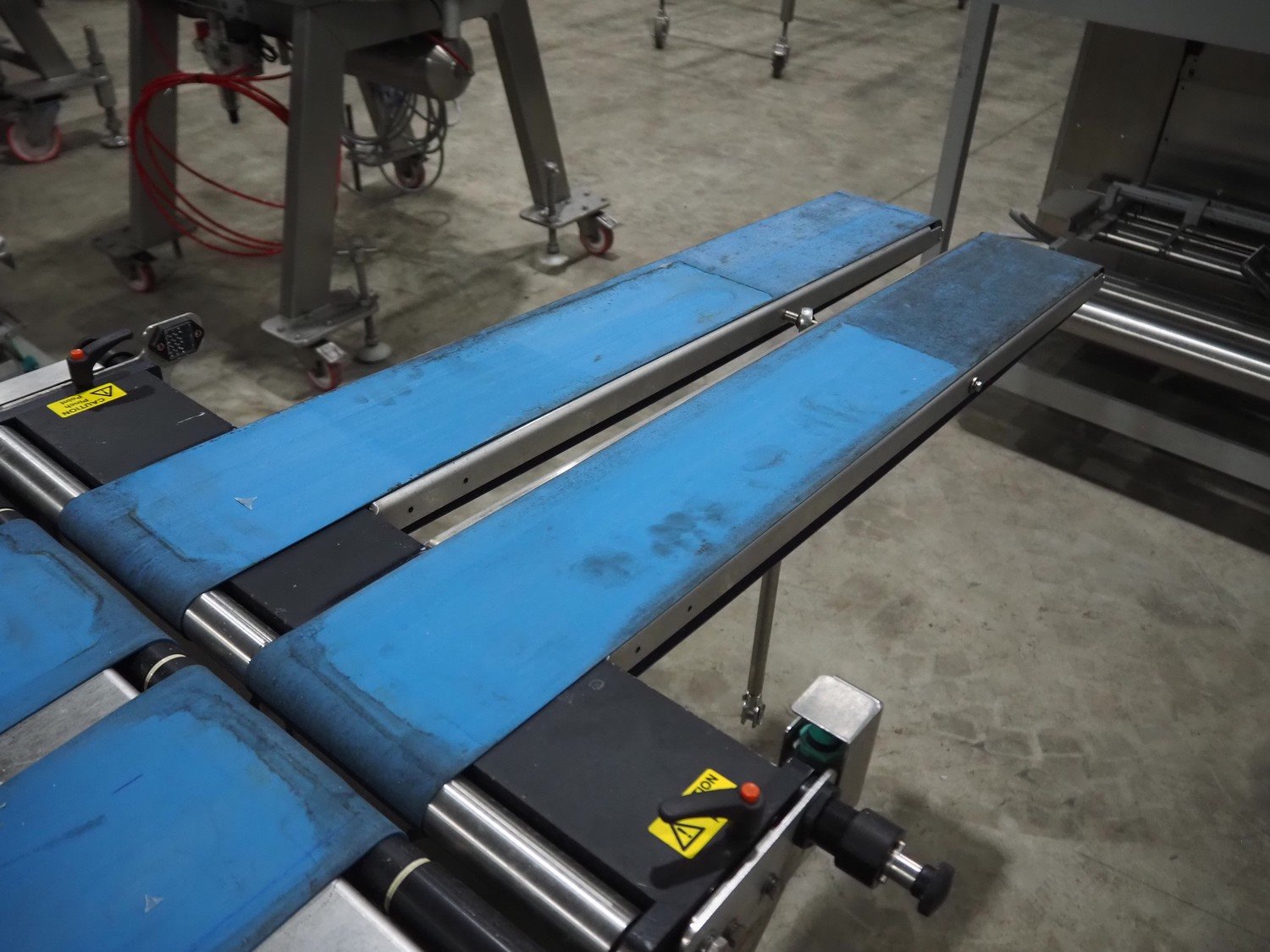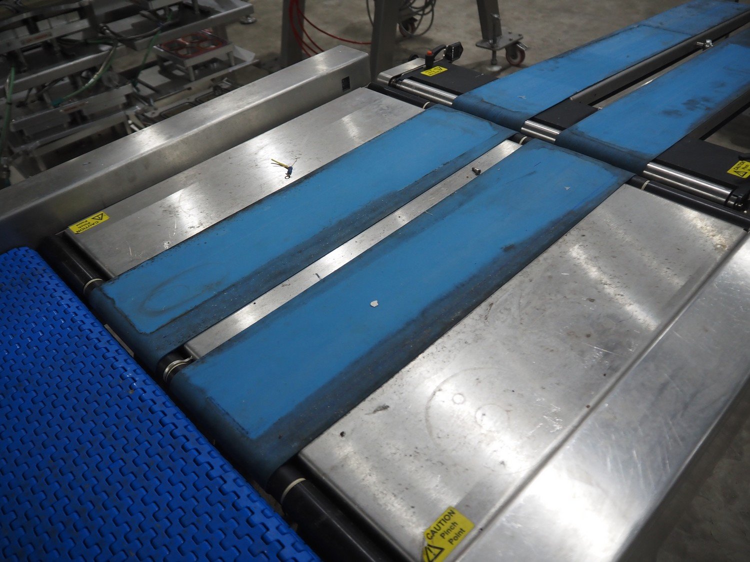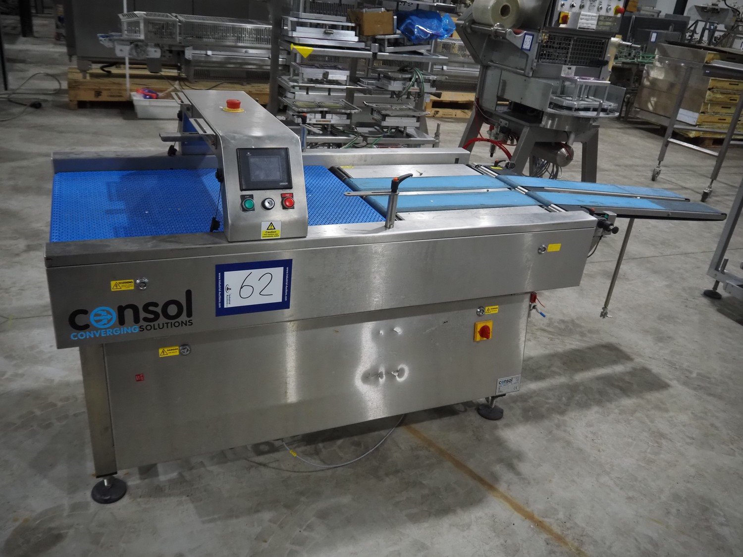 Consol Converging Solutions lane dividing belt, model: INT3, serial number: CS 6696, year of construction: 2019, 230 V, 16 A, plastic belts, belt width: (1x) 680 mm, (2x) 135 mm, total dimensions: 2650 mm x 860 mm x 1150 mm.