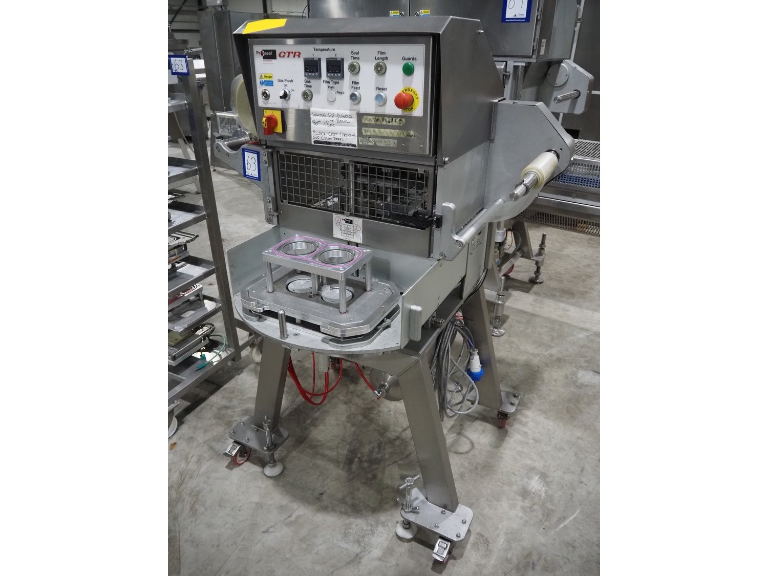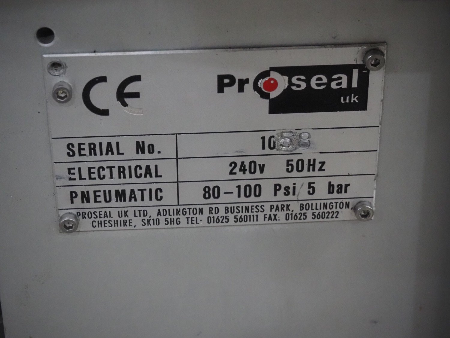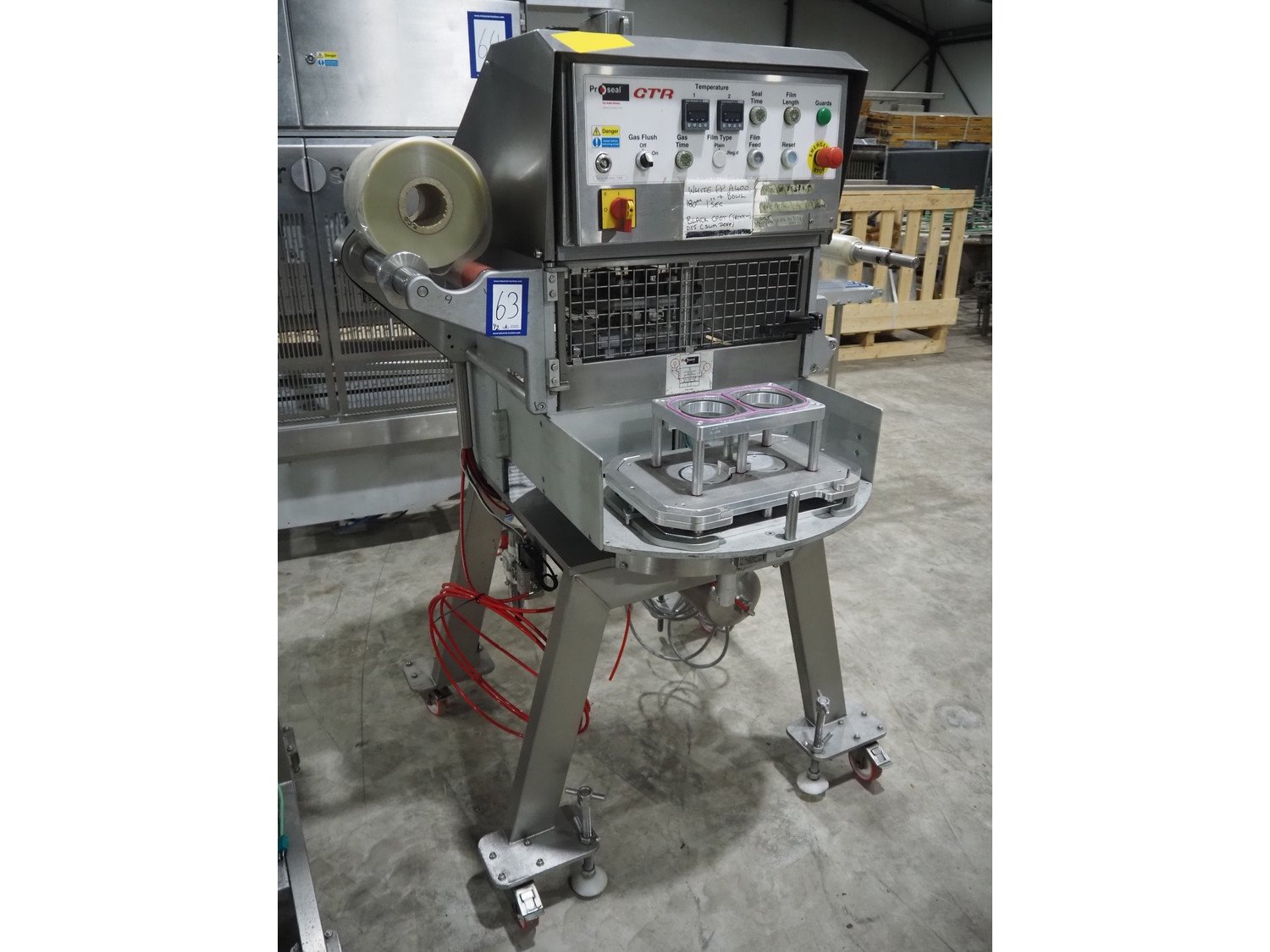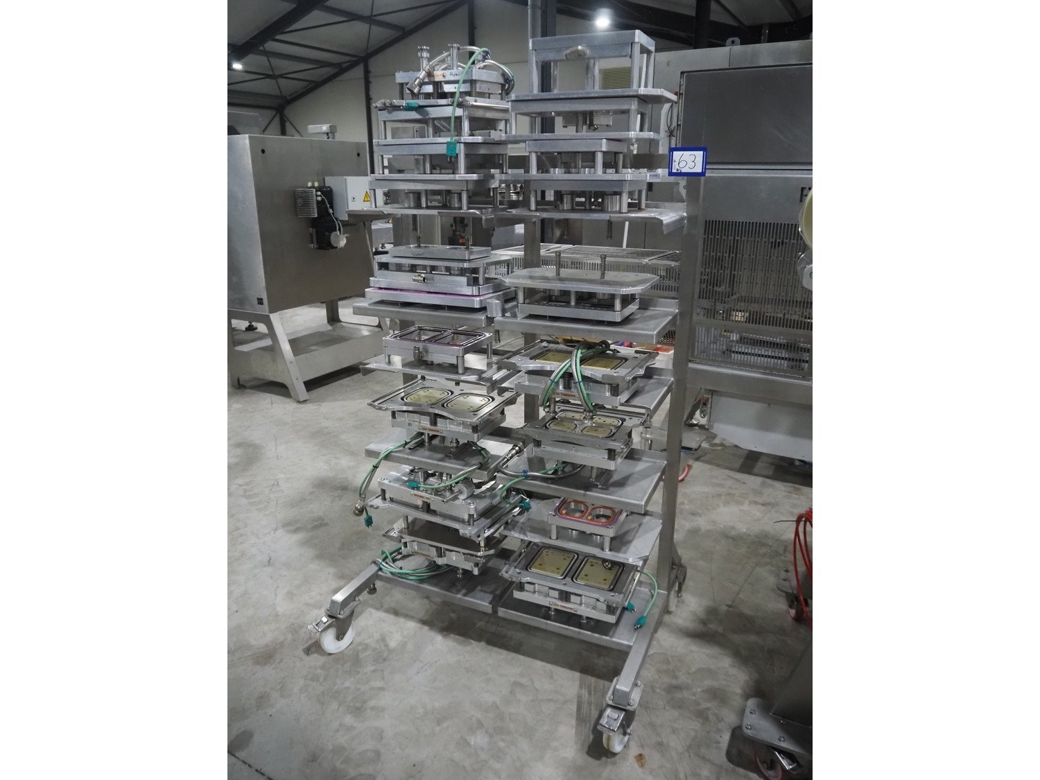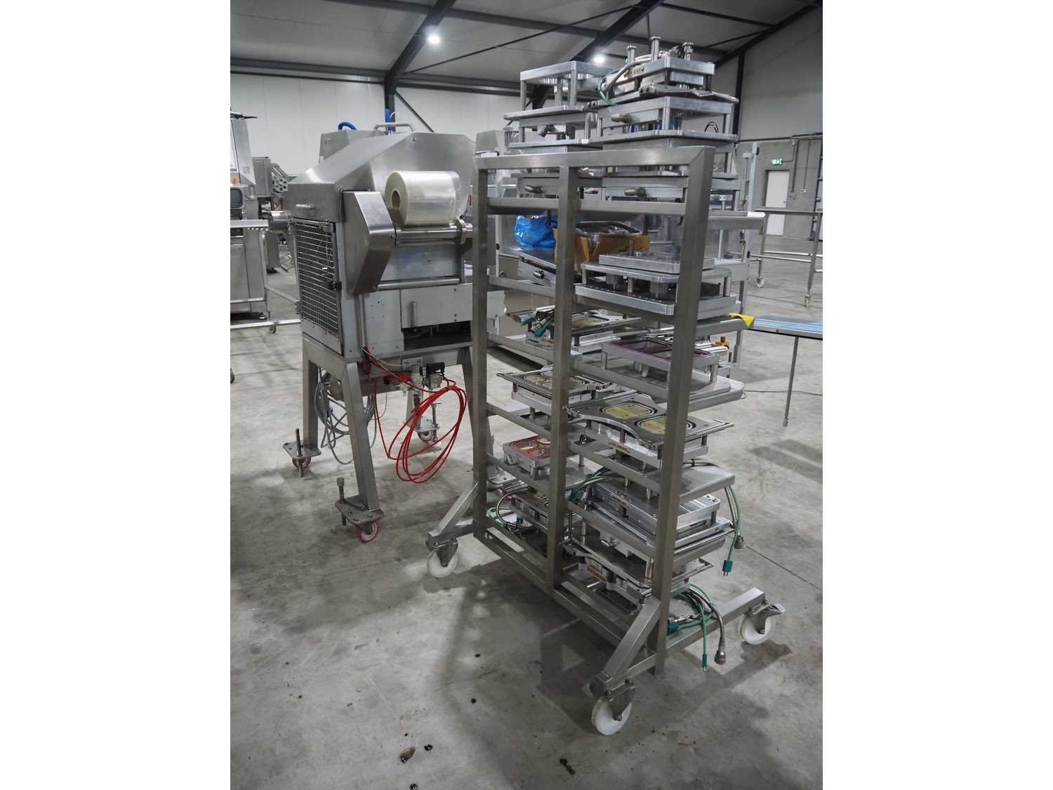 Proseal UK LTD mobile rotating traysealer, serial number: 1058, 240 V, 50 Hz, 5 bar, film width: 205 mm, dye: (2x) 105 mm x 160 mm, total dimensions: 1150 mm x 1000 mm x 1680 mm. Including s/s rack with large amount of extra forms, dye: (2x) 140 mm x 165 mm, (2x) 120 mm x 160 mm, (2x) 170 mm x 215 mm, 175 mm x 215 mm, (2x) 115 mm x 115 mm, (2x) 165 mm x 215 mm, (2x) Ø 135 mm, total dimensions rack: 1000 mm x 900 mm x 1600 mm.