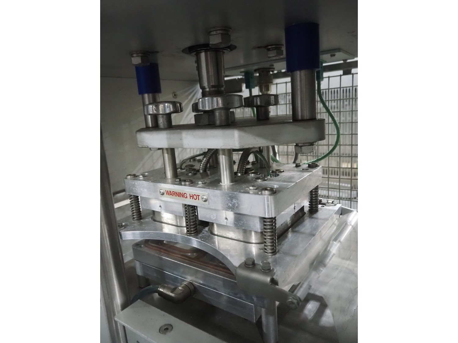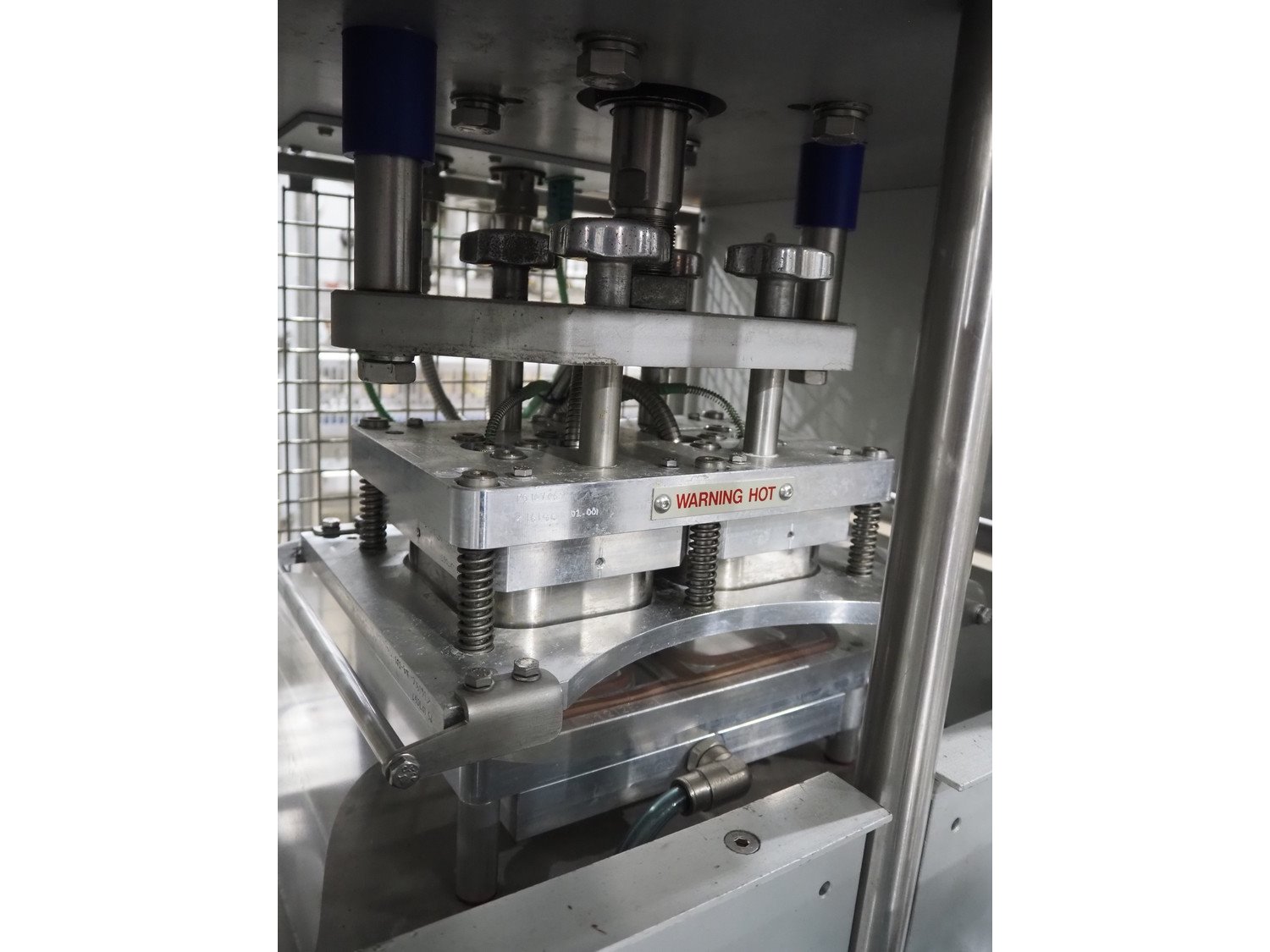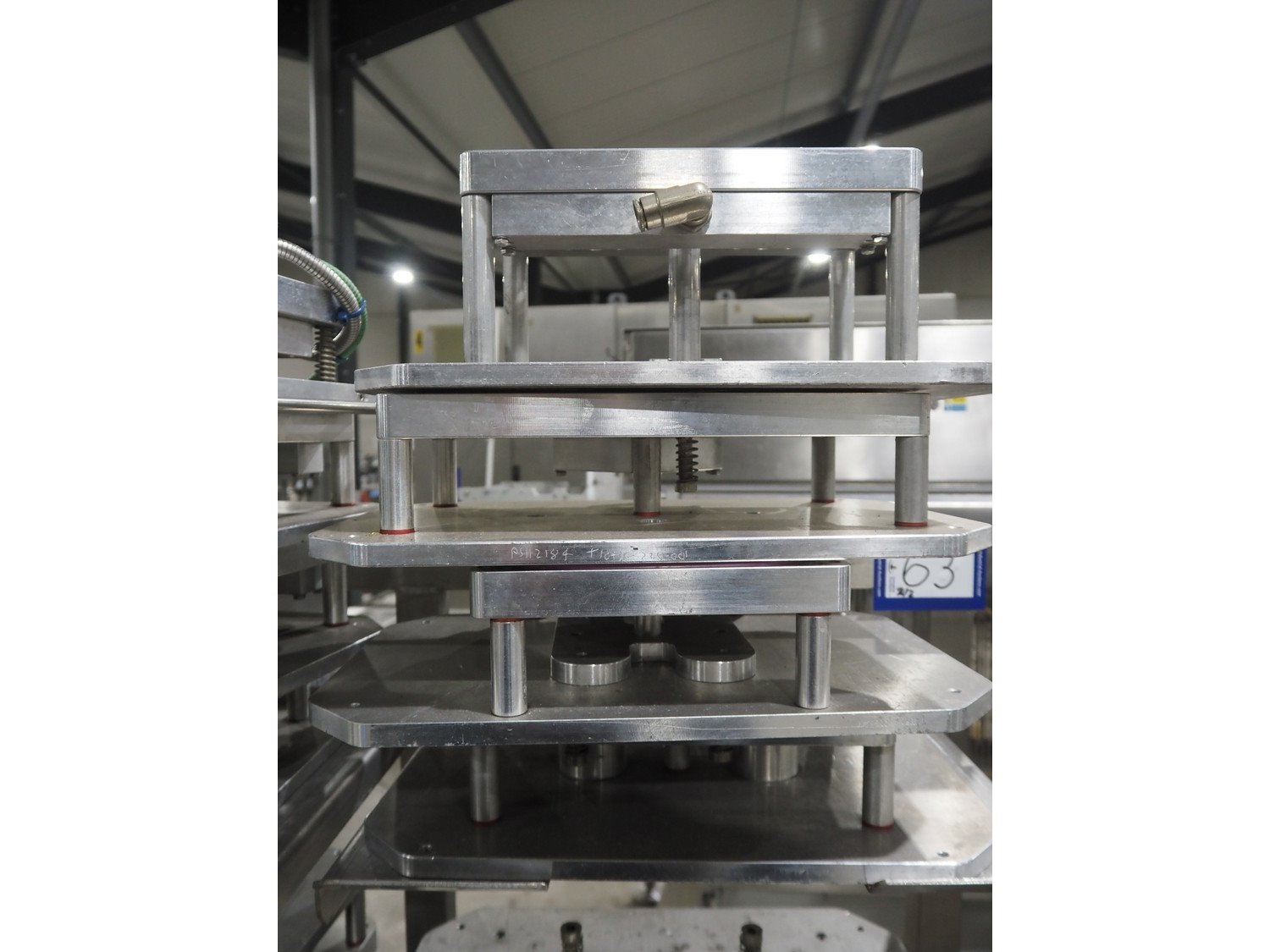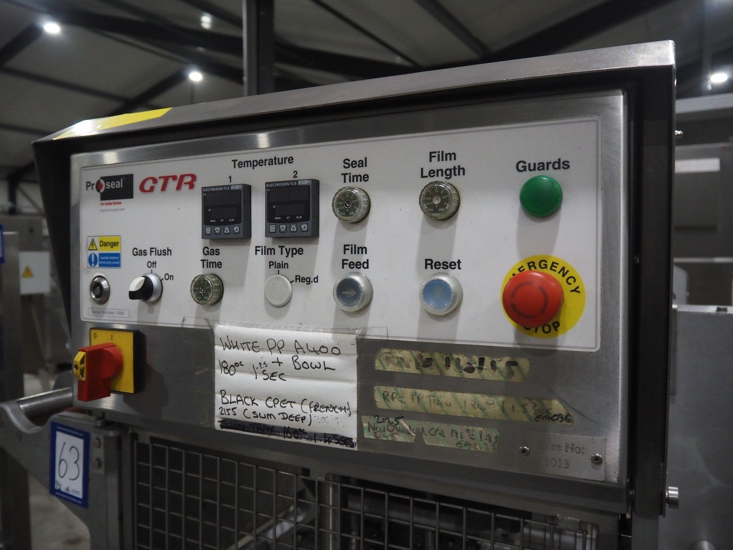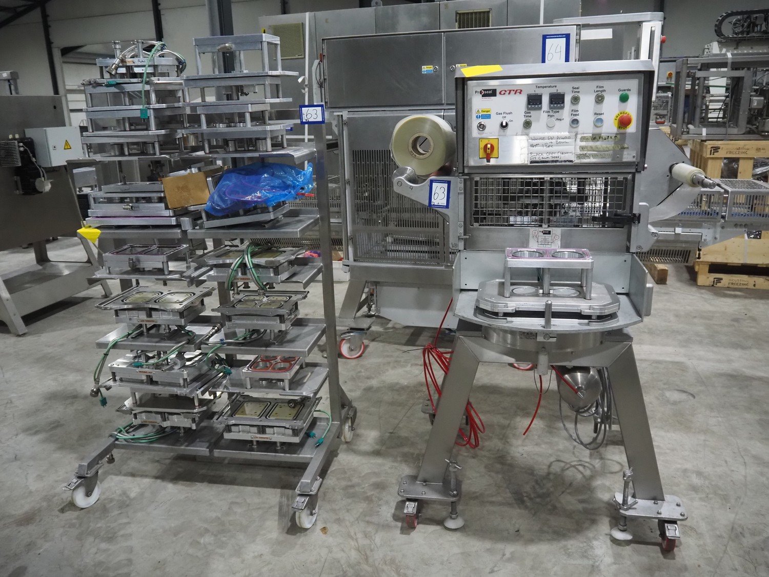 Proseal UK LTD mobile rotating traysealer, serial number: 1058, 240 V, 50 Hz, 5 bar, film width: 205 mm, dye: (2x) 105 mm x 160 mm, total dimensions: 1150 mm x 1000 mm x 1680 mm. Including s/s rack with large amount of extra forms, dye: (2x) 140 mm x 165 mm, (2x) 120 mm x 160 mm, (2x) 170 mm x 215 mm, 175 mm x 215 mm, (2x) 115 mm x 115 mm, (2x) 165 mm x 215 mm, (2x) Ø 135 mm, total dimensions rack: 1000 mm x 900 mm x 1600 mm.