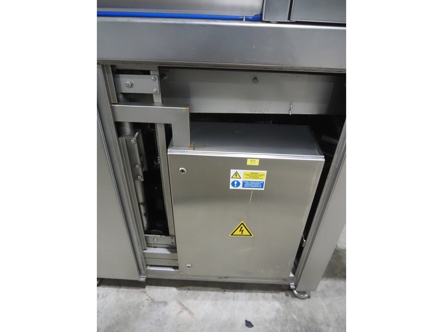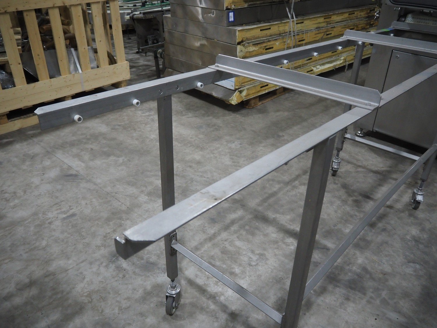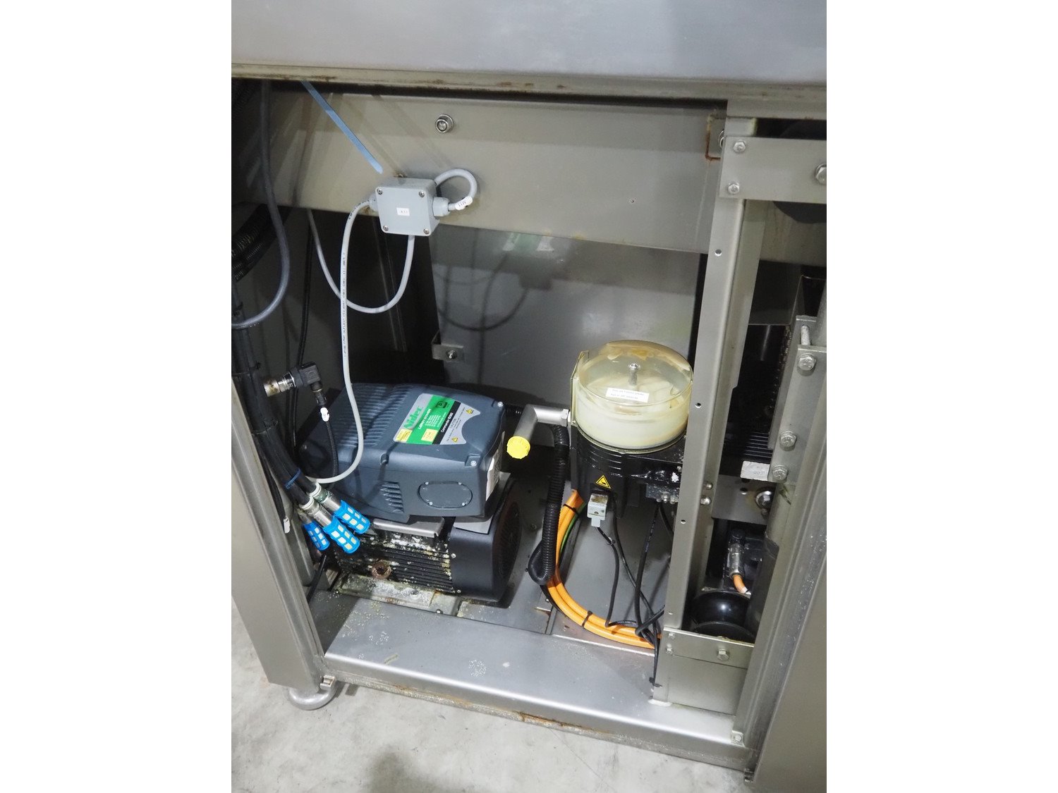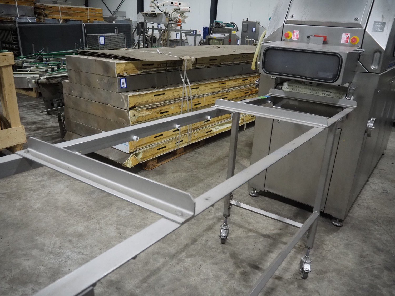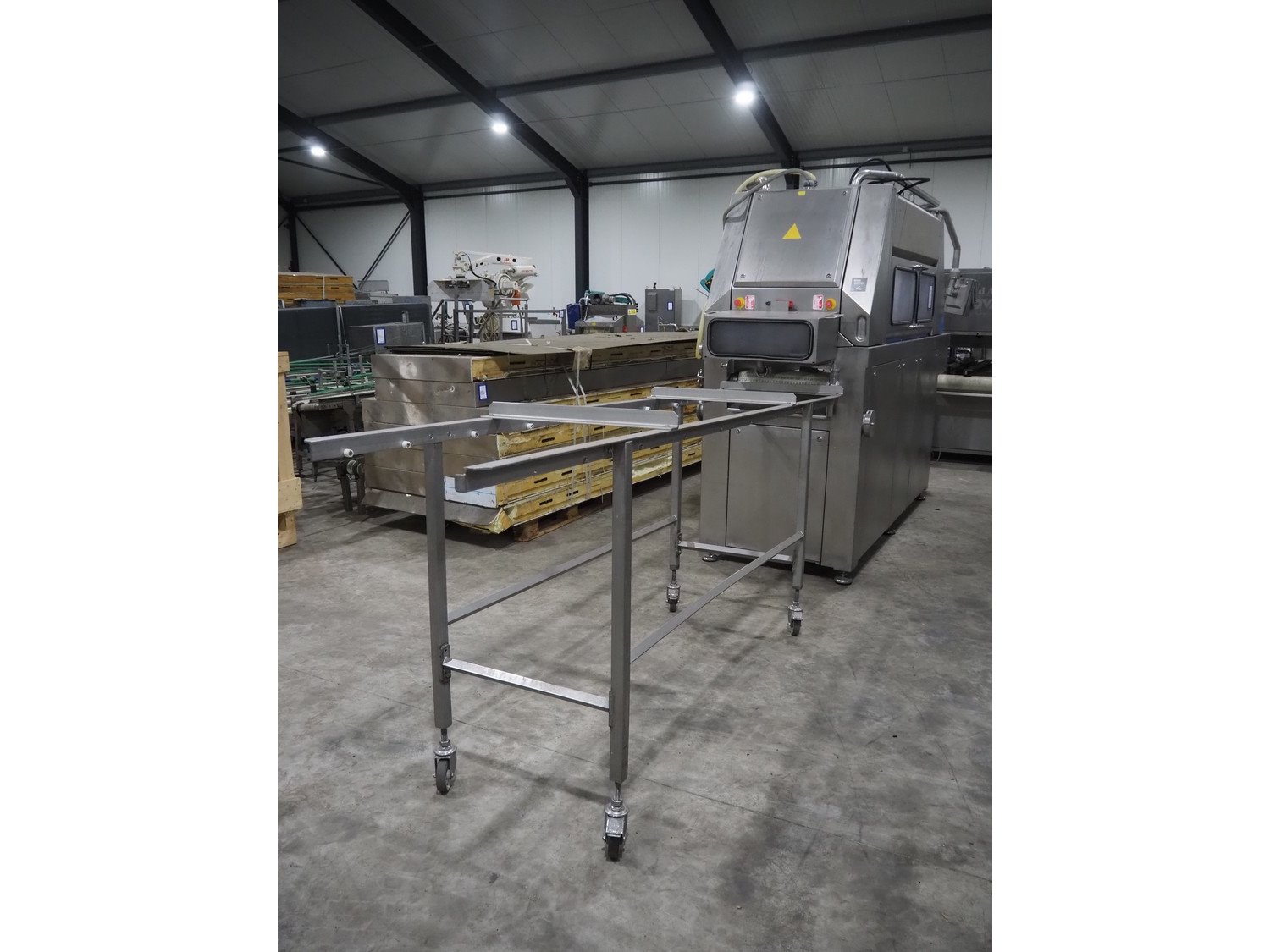 Fomaco injector, model: FGM 64 DC M3, serial number: 14818-2013, 400 V, 3 Ph, 50 Hz, 63 A, 19 kW, 6 bar, plastic mesh belt, belt width: 525 mm, total dimensions: 3200 mm x 1150 mm x 2500 mm. Incomplete. Including trolley for belt, dimensions: 2950 mm x 700 mm x 1220 mm.