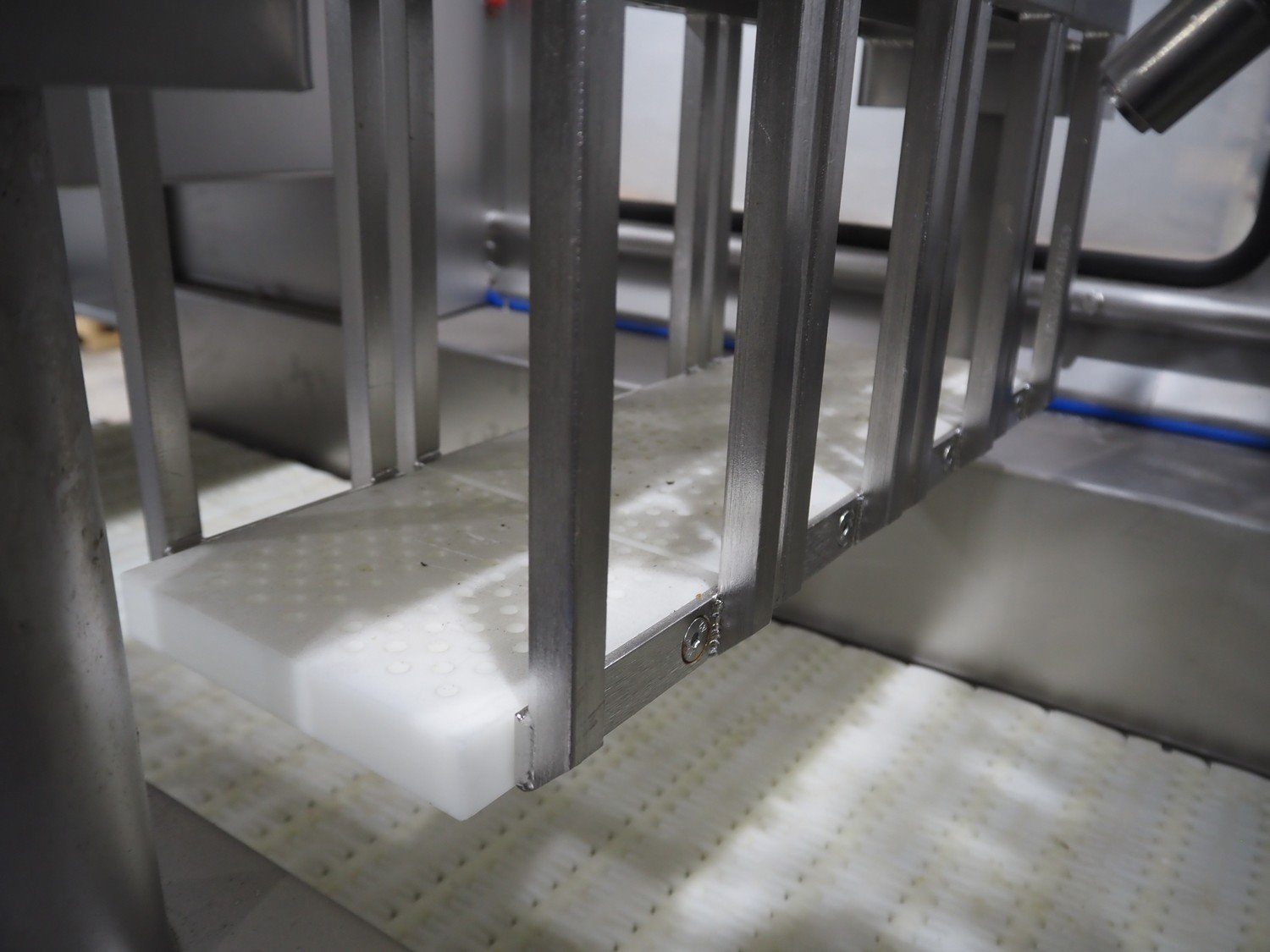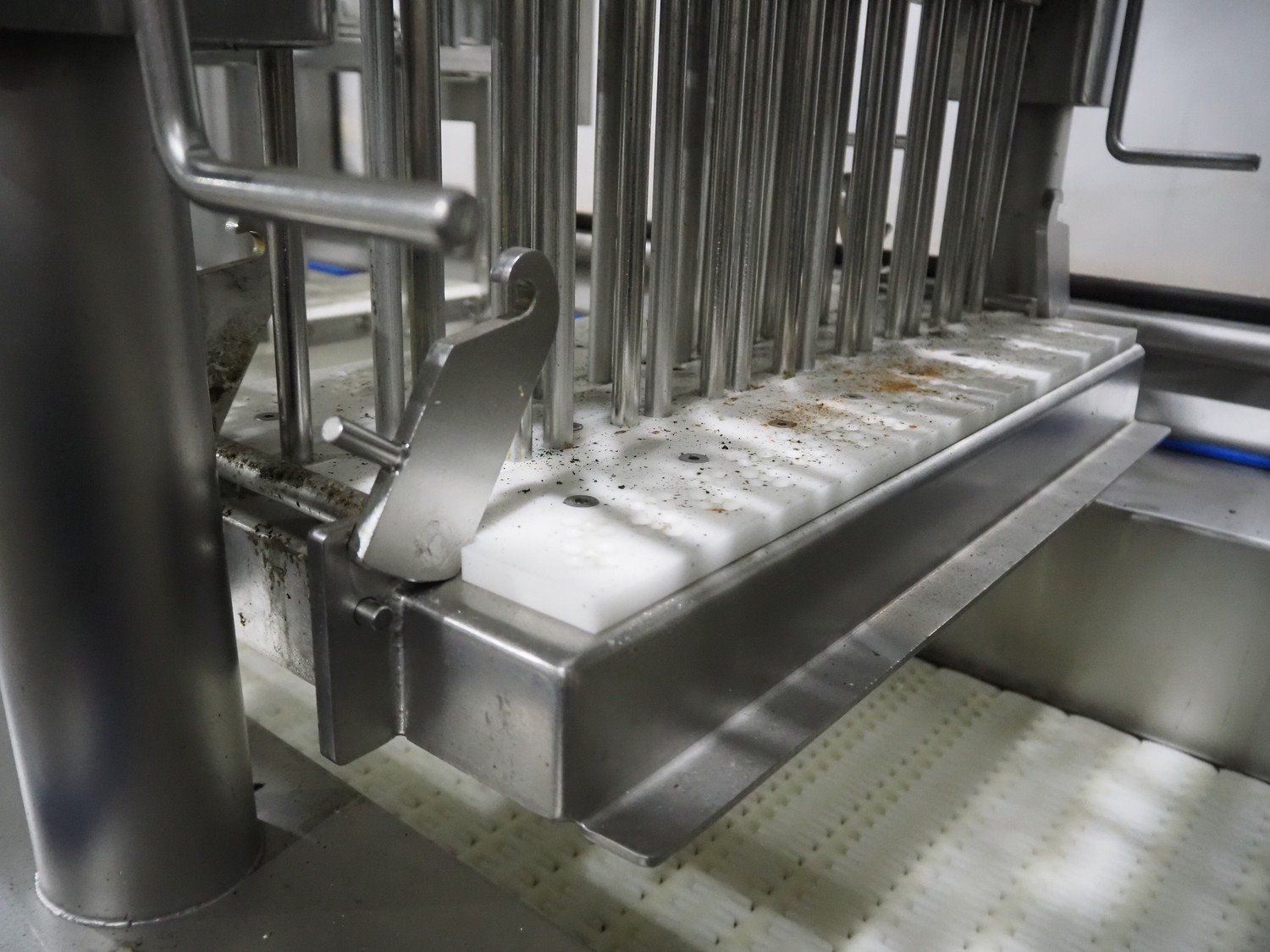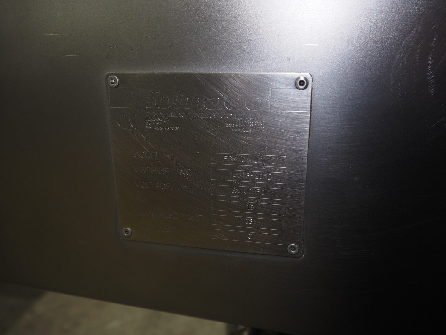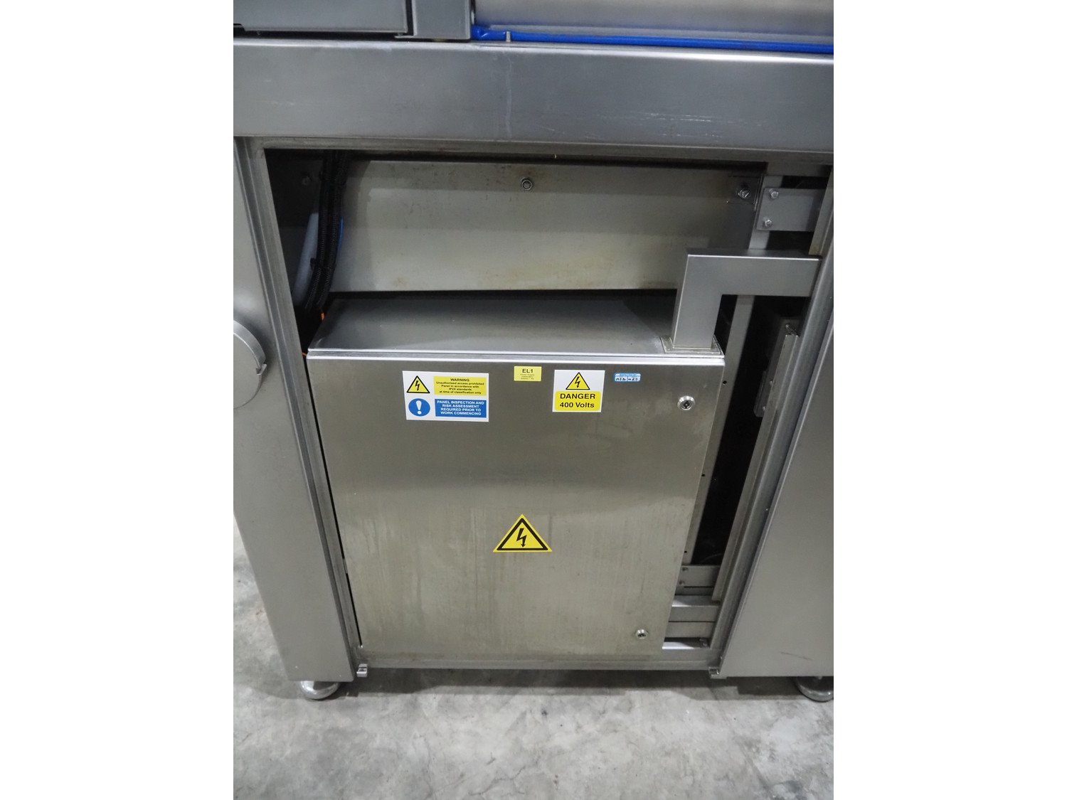Fomaco injector, model: FGM 64 DC M3, serial number: 14818-2013, 400 V, 3 Ph, 50 Hz, 63 A, 19 kW, 6 bar, plastic mesh belt, belt width: 525 mm, total dimensions: 3200 mm x 1150 mm x 2500 mm. Incomplete. Including trolley for belt, dimensions: 2950 mm x 700 mm x 1220 mm.