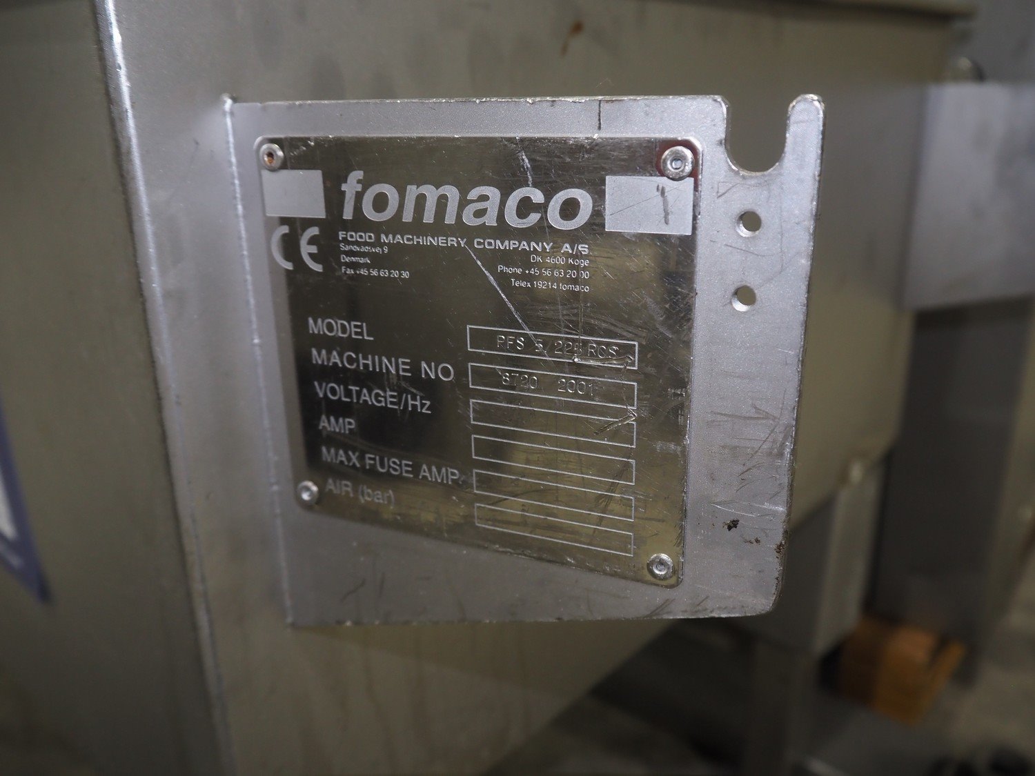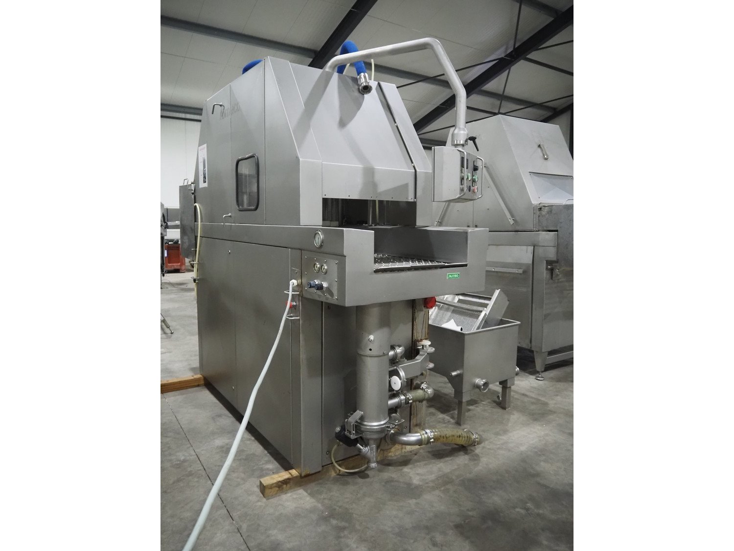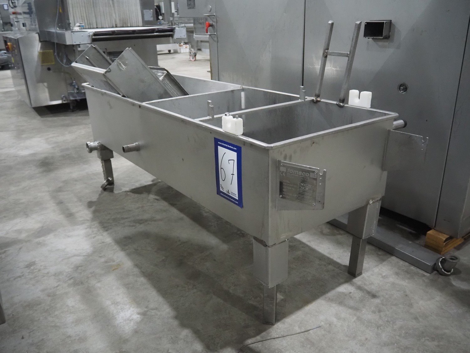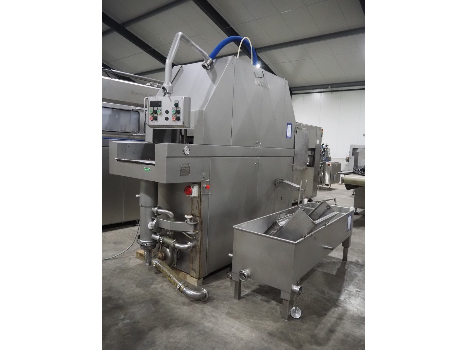 Fomaco A/S injector, model: FGM 64F SW, machine number: 7897 1999, year of construction: 1999, 400 V, 3 Ph, 50 Hz, 18/32 A, 6 bar, s/s walking beam width: 540 mm, clearance: 540 mm x 150 mm, total dimensions: 1680 mm x 850 mm x 2220 mm. Including Fomaco A/S mobile filter tub, model: PFS 5/225 ROS, machine number: 8720, year of construction: 2001, dimensions: 1800 mm x 620 mm x 920 mm. Filter tub is incomplete.