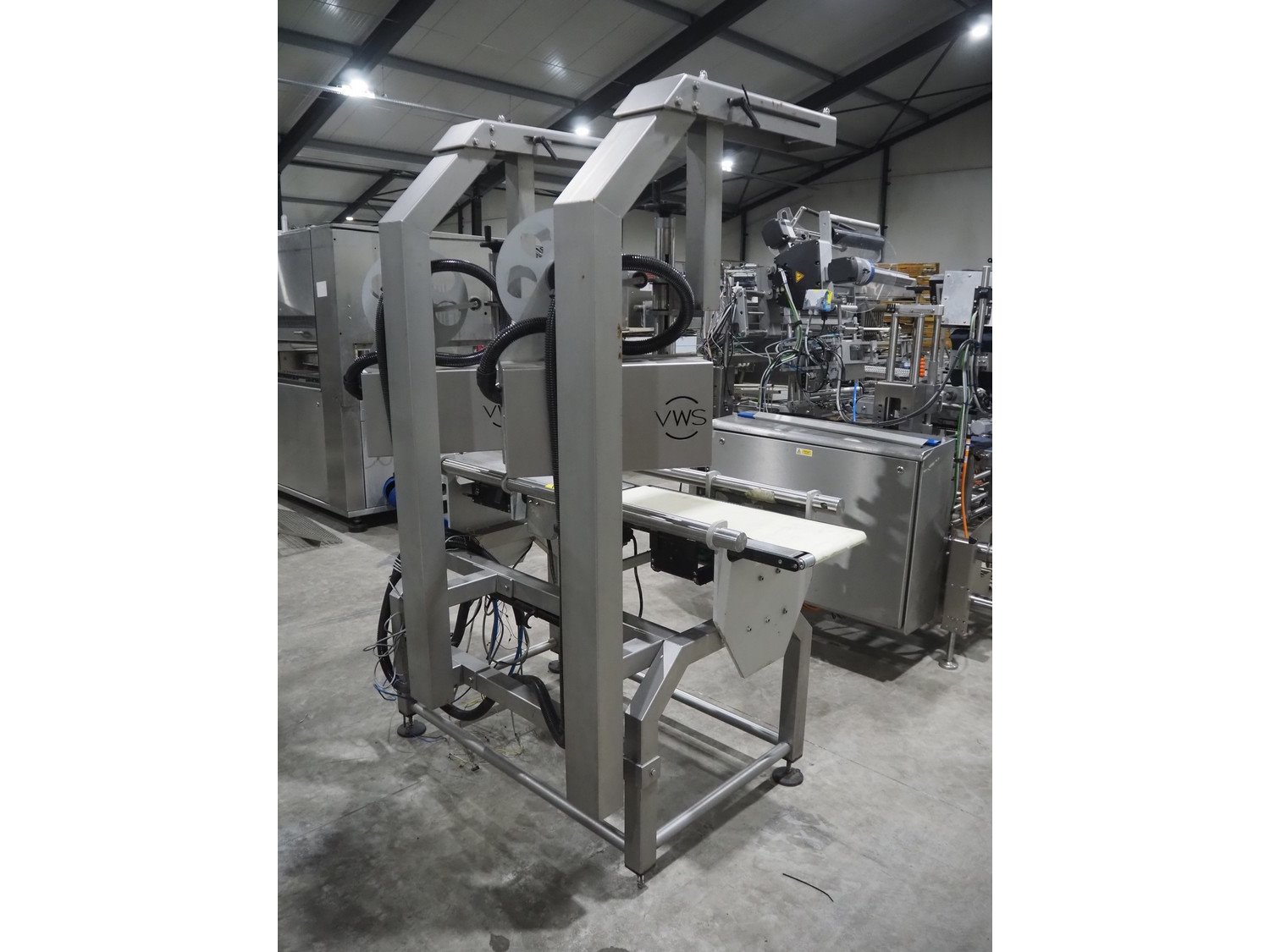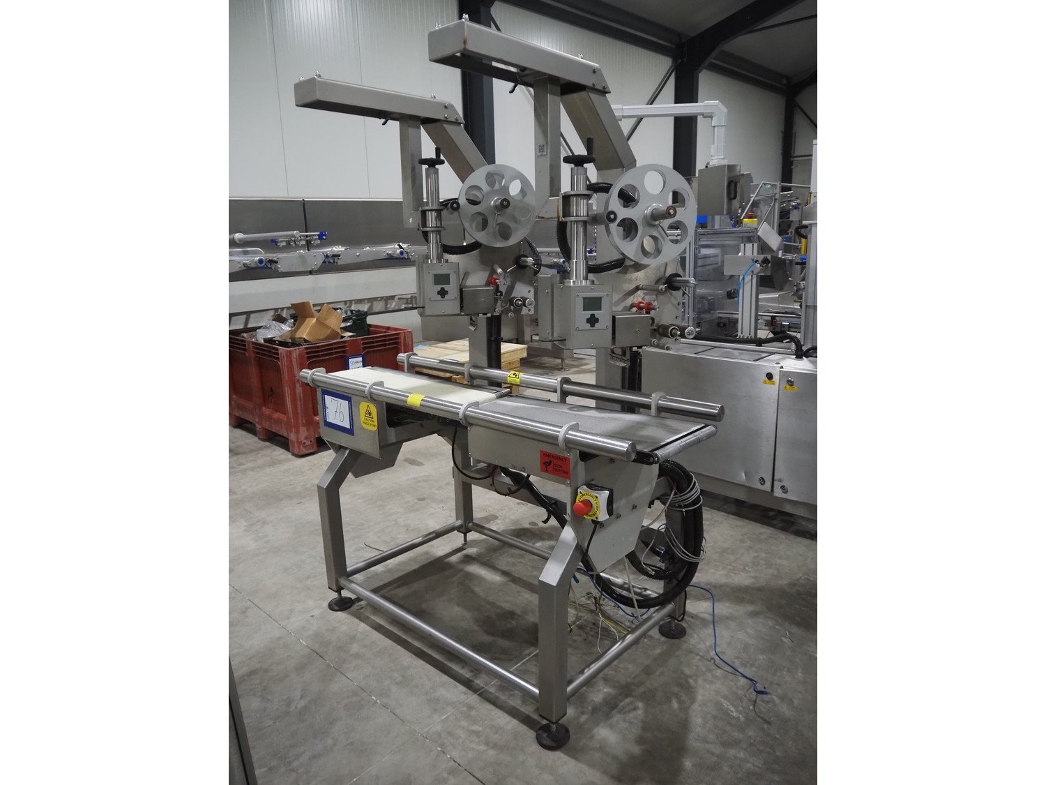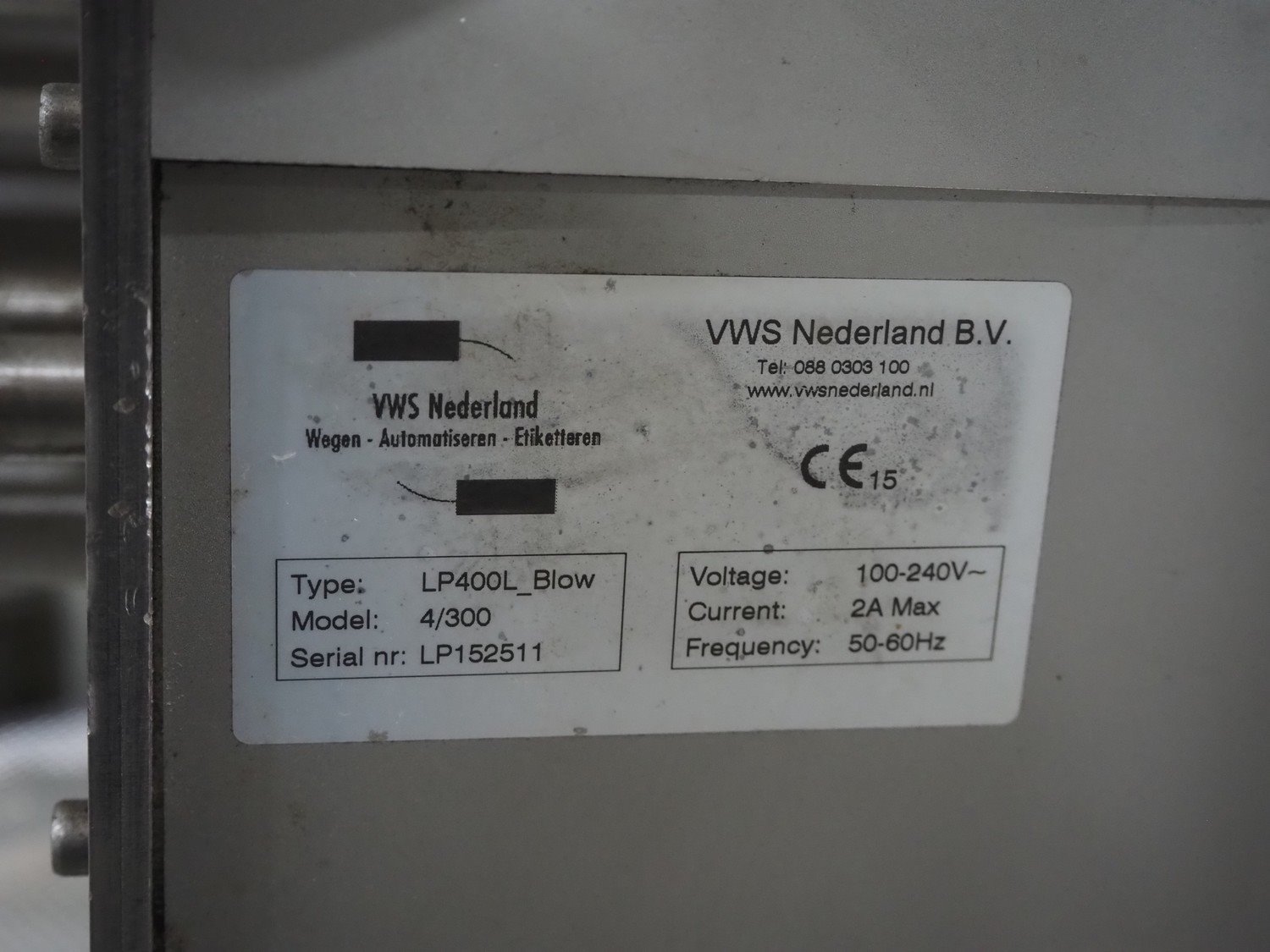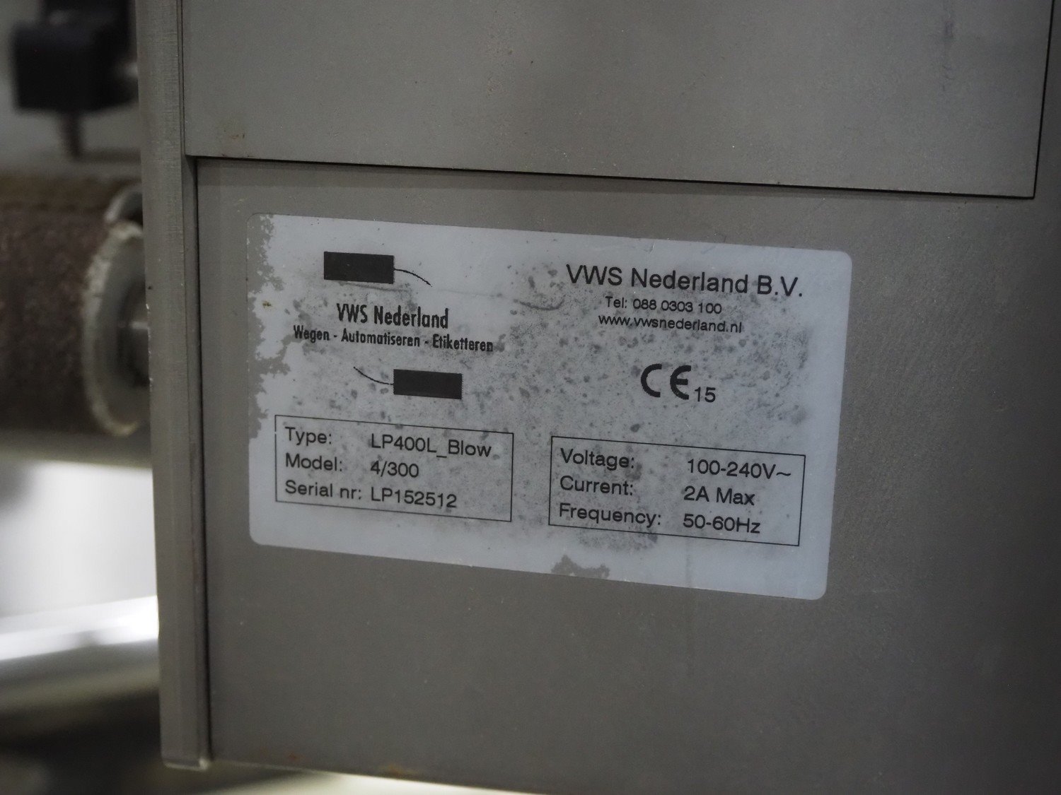 VWS Nederland B.V. double labeller, type: (2x) LP400L_Blow, model: 4/300, serial number: LP152511 and LP152512, 100-240 V, 50-60 Hz, 2 A, belt width: 295 mm, 255 mm, total dimensions: 1620 mm x 900 mm x 1960 mm.