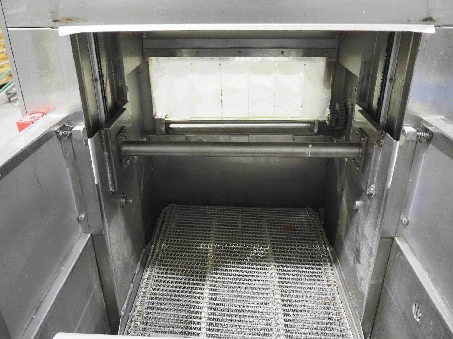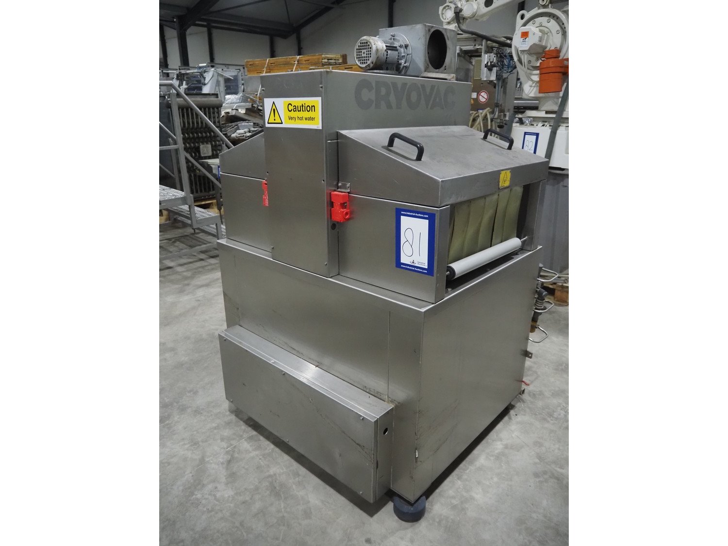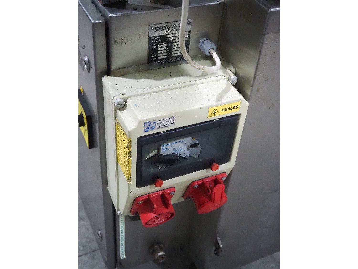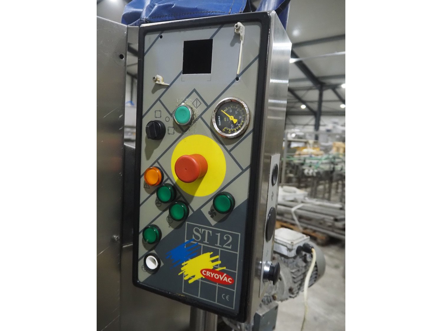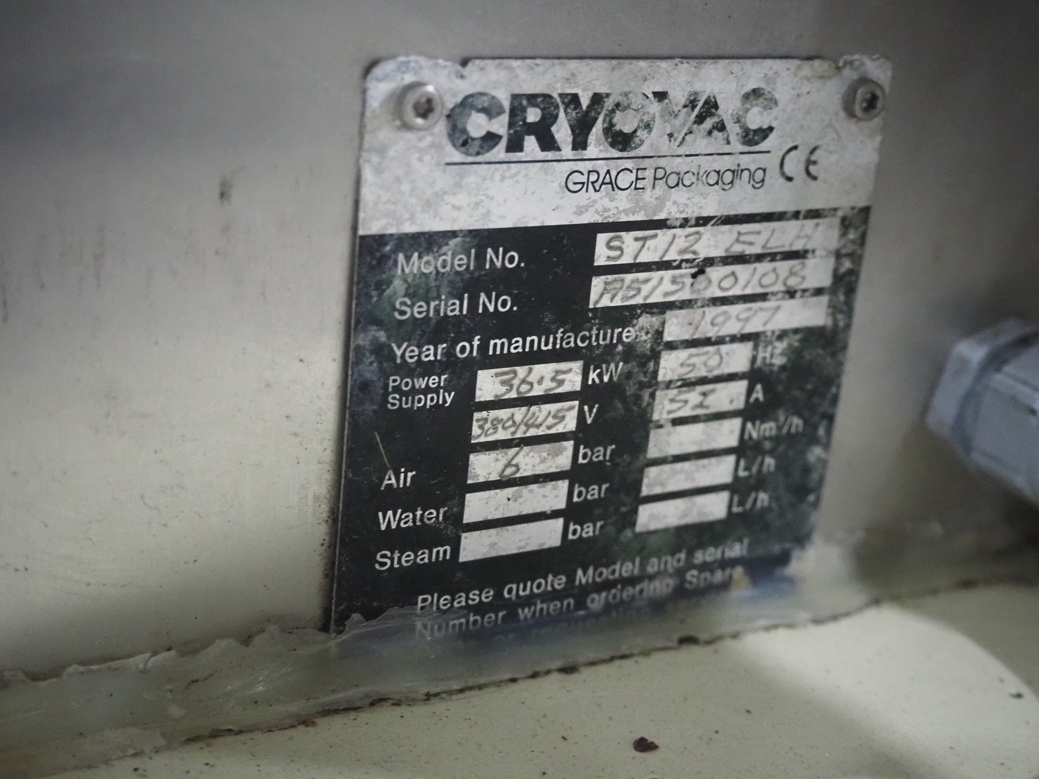 Cryovac dip tank, model number: ST12 ELH, serial number: A51500108, year of construction: 1997, 380/415 V, 50 Hz, 51 A, 6 bar, s/s mesh belt, belt width: 600 mm, clearance: 650 mm x 230 mm, total dimensions: 1300 mm x 1250 mm x 1600 mm.