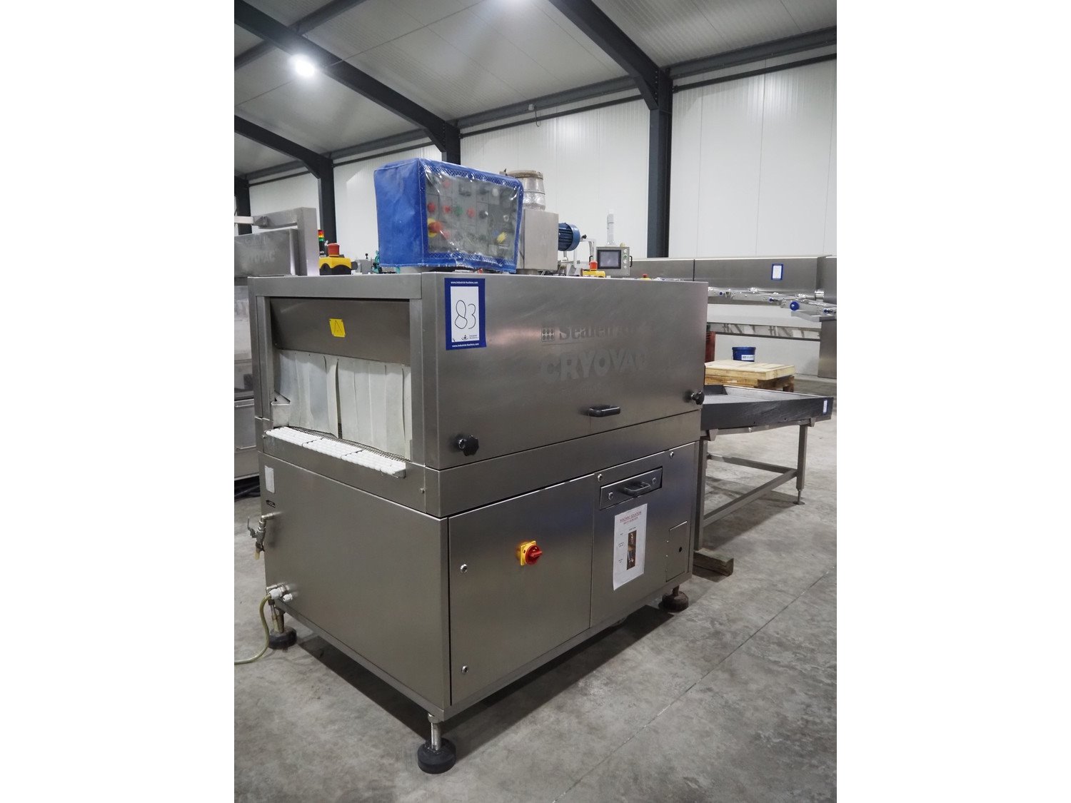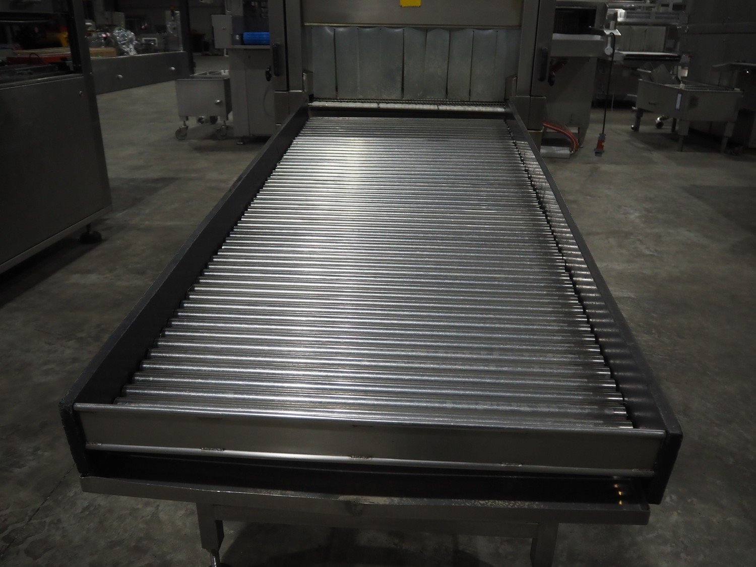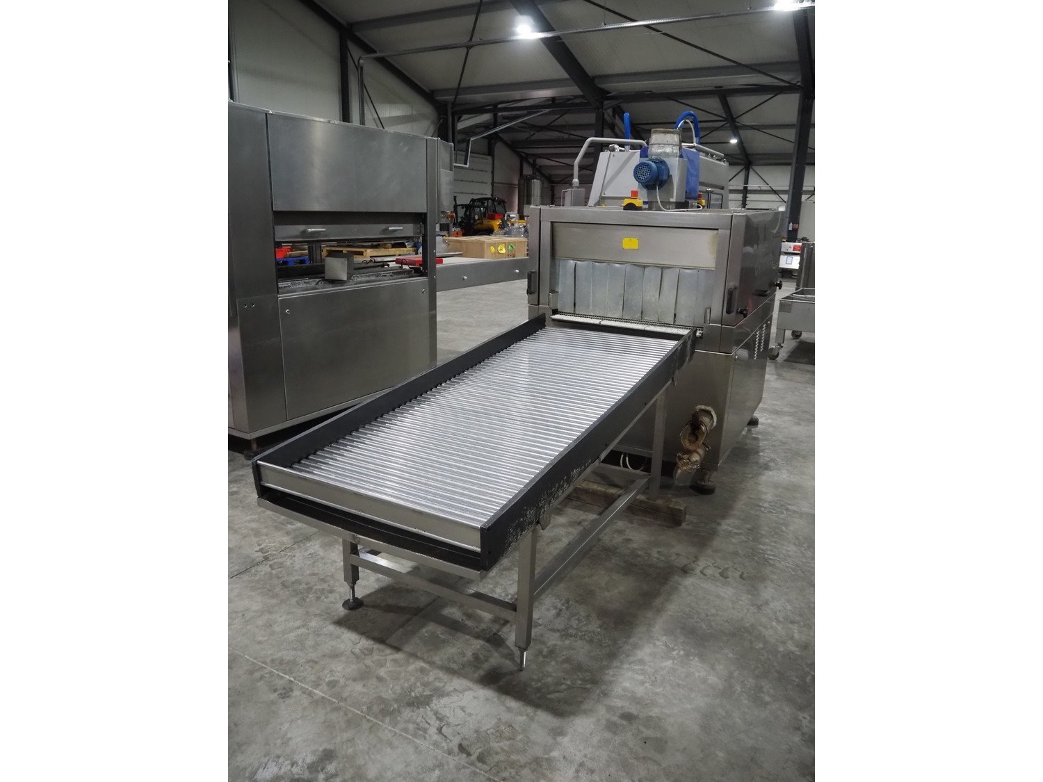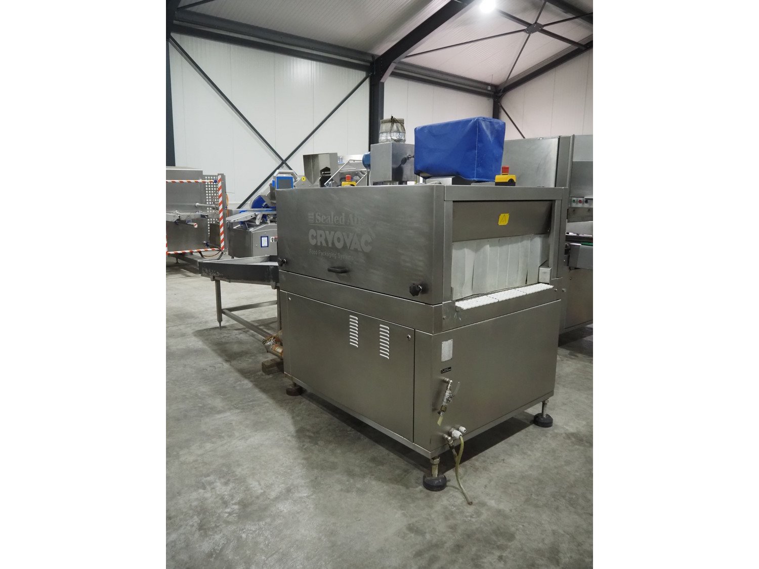 Cryovac shrink tunnel, model number: ST98-800 STEAM, serial number: A56122511, year of construction: 2005, belt width: 870 mm, clearance: 800 mm x 300 mm, total dimensions: 1500 mm x 1200 mm x 1900 mm. Including outfeed roller conveyor, s/s rollers, roller width: 800 mm, total dimensions roller conveyor: 2000 mm x 850 mm x 940 mm.
