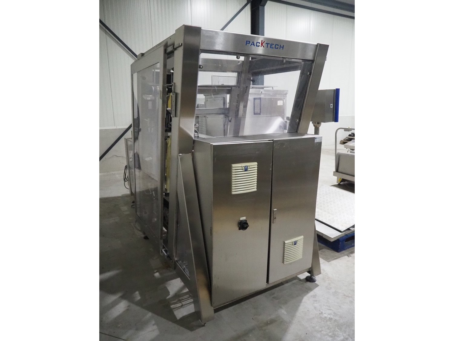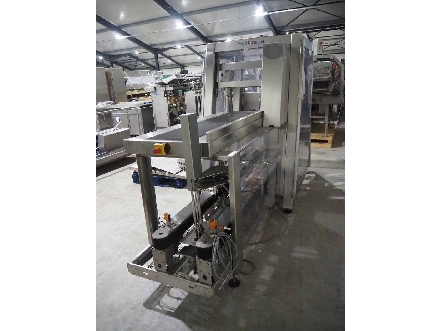 Paktech linear case erector, plastic belt, belt width: 400 mm, clearance: 225 mm, total dimensions: 3700 mm x 1650 mm x 2100 mm.