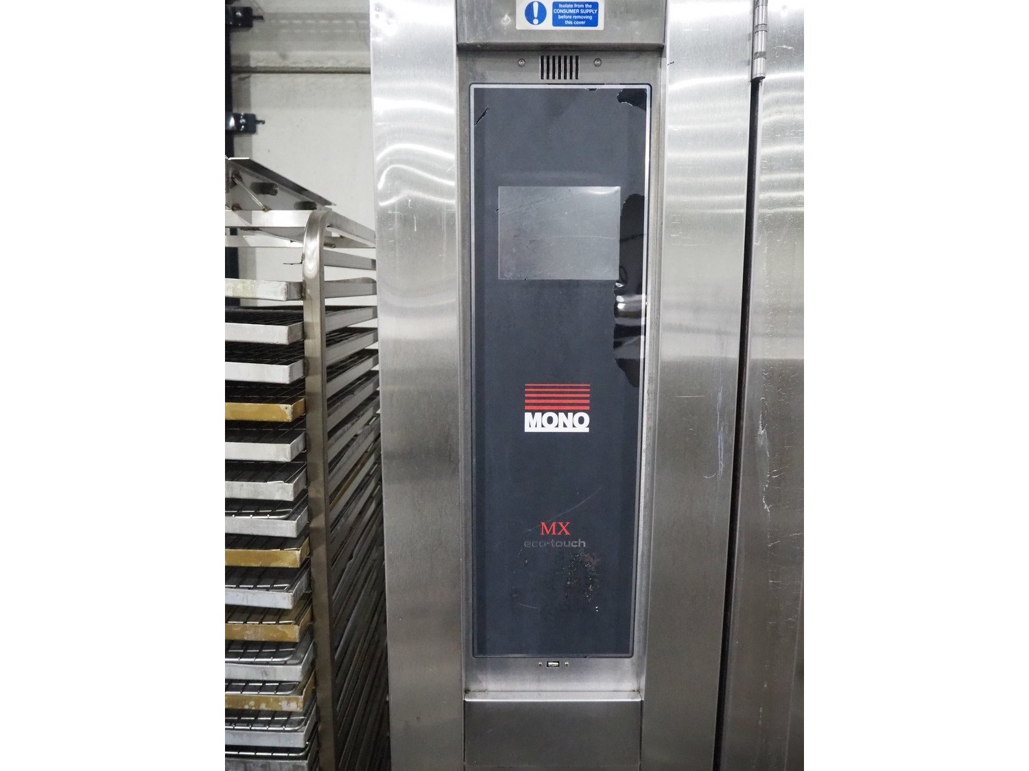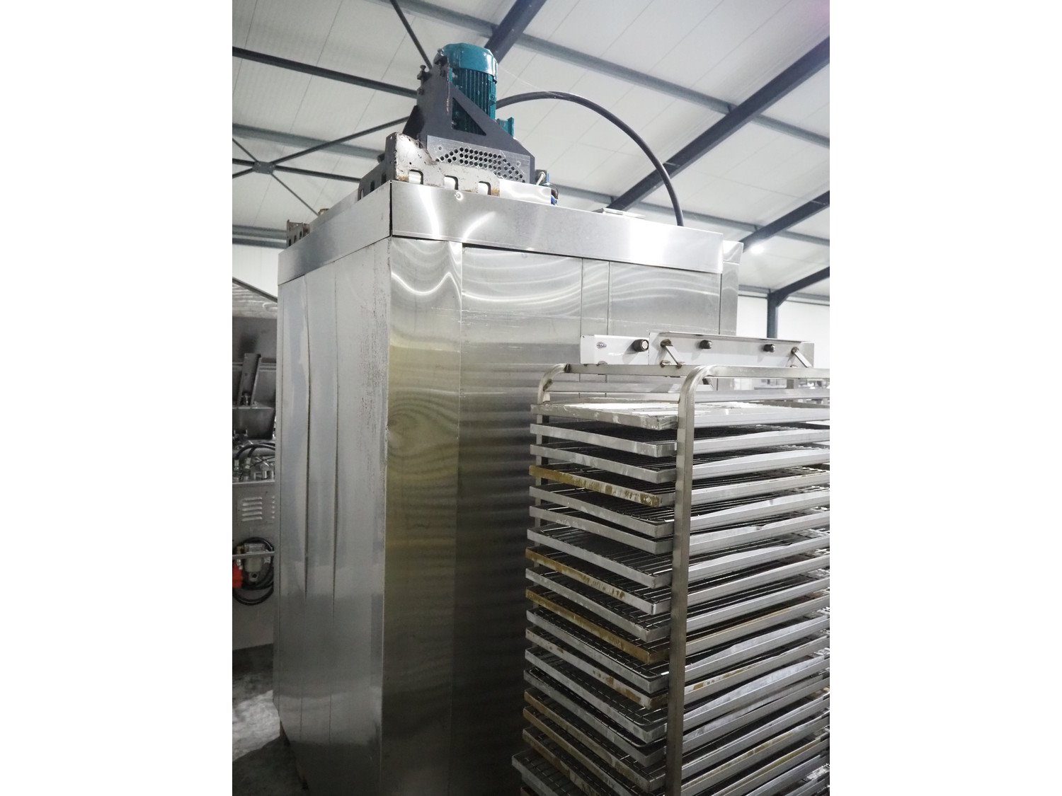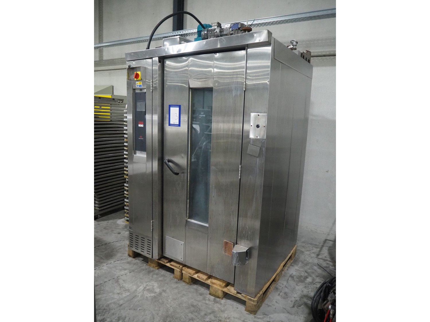 Mono rotary oven with 2 trolleys, inside dimensions: 950 mm x 950 mm x 1950 mm, total dimensions: 1500 mm x 1350 mm x 2600 mm. 2 s/s trolleys, 32 floors, floor dimensions: (32x) 760 mm x 460 mm, total dimensions: (2x) 770 mm x 530 mm x 1830 mm.