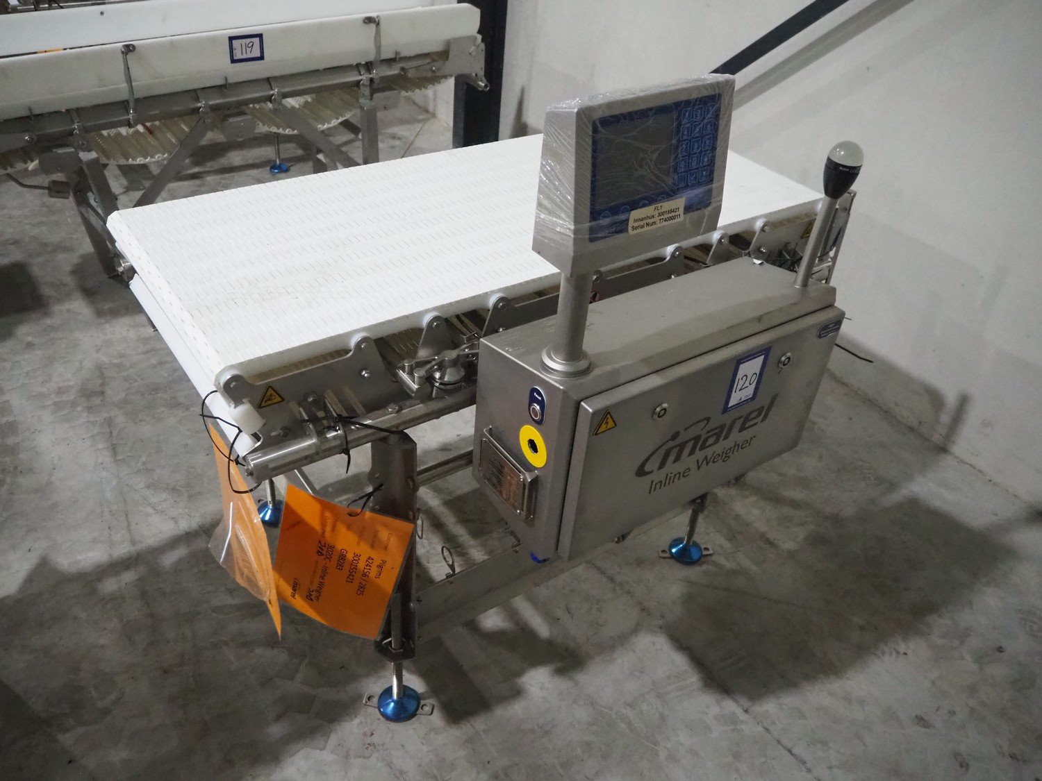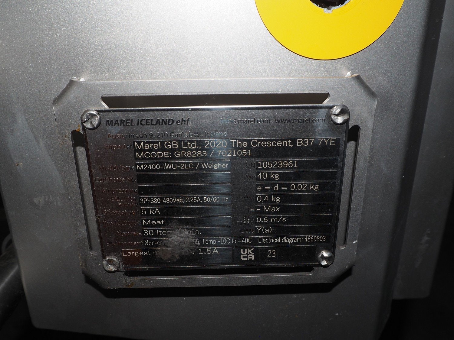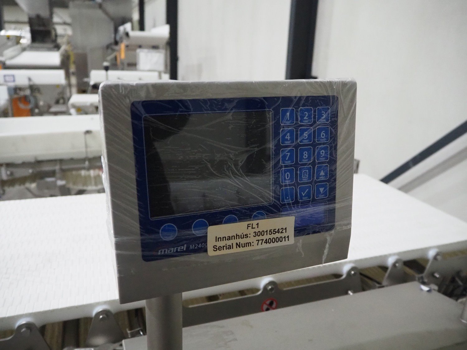 Marel inline weigher, model: M2400-IWU-2LC, serial number: 10523961, year of construction: 2023, max: 40 Kg, min: 0.4 Kg, e=d=0.02 Kg, plastic belt, belt width: 505 mm, total dimensions: 1250 mm x 900 mm x 1250 mm.