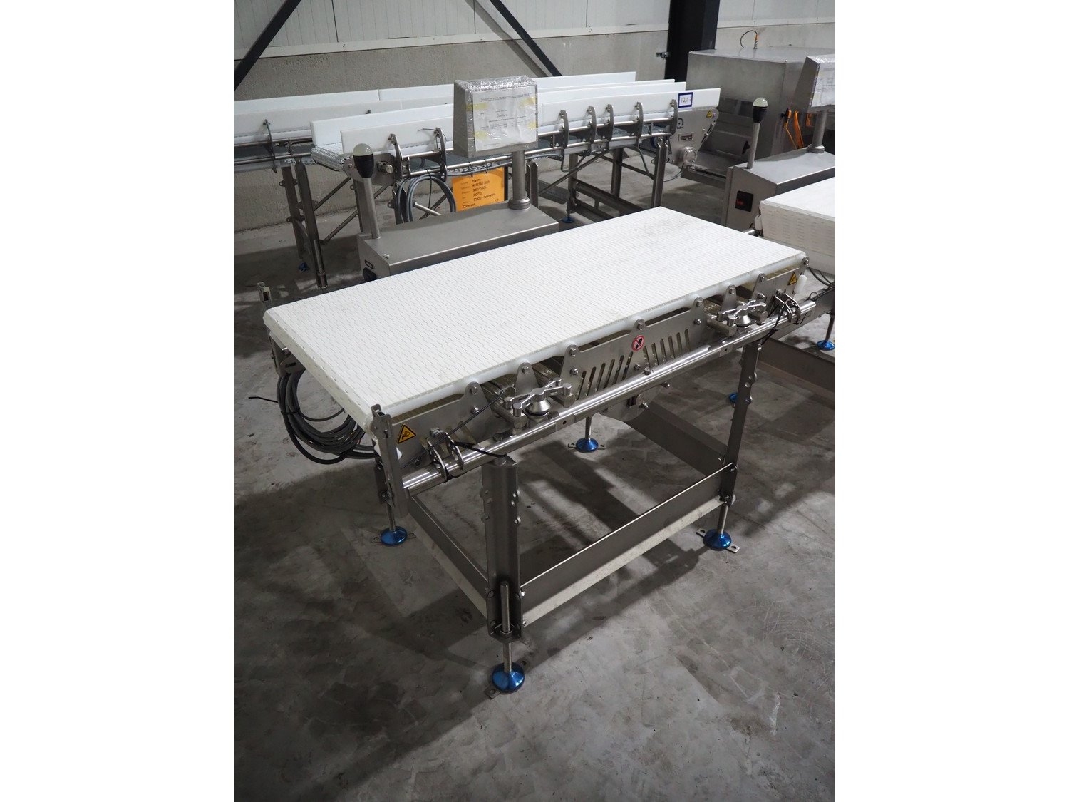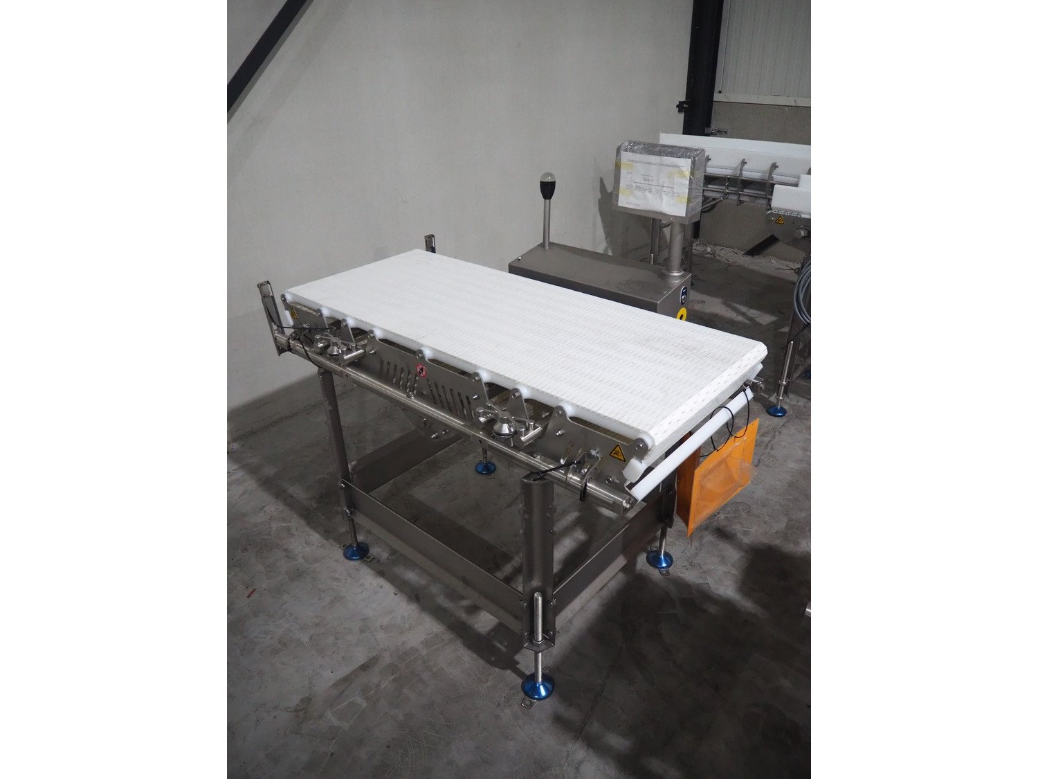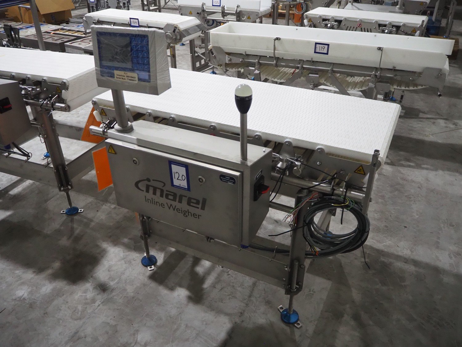 Marel inline weigher, model: M2400-IWU-2LC, serial number: 10523961, year of construction: 2023, max: 40 Kg, min: 0.4 Kg, e=d=0.02 Kg, plastic belt, belt width: 505 mm, total dimensions: 1250 mm x 900 mm x 1250 mm.