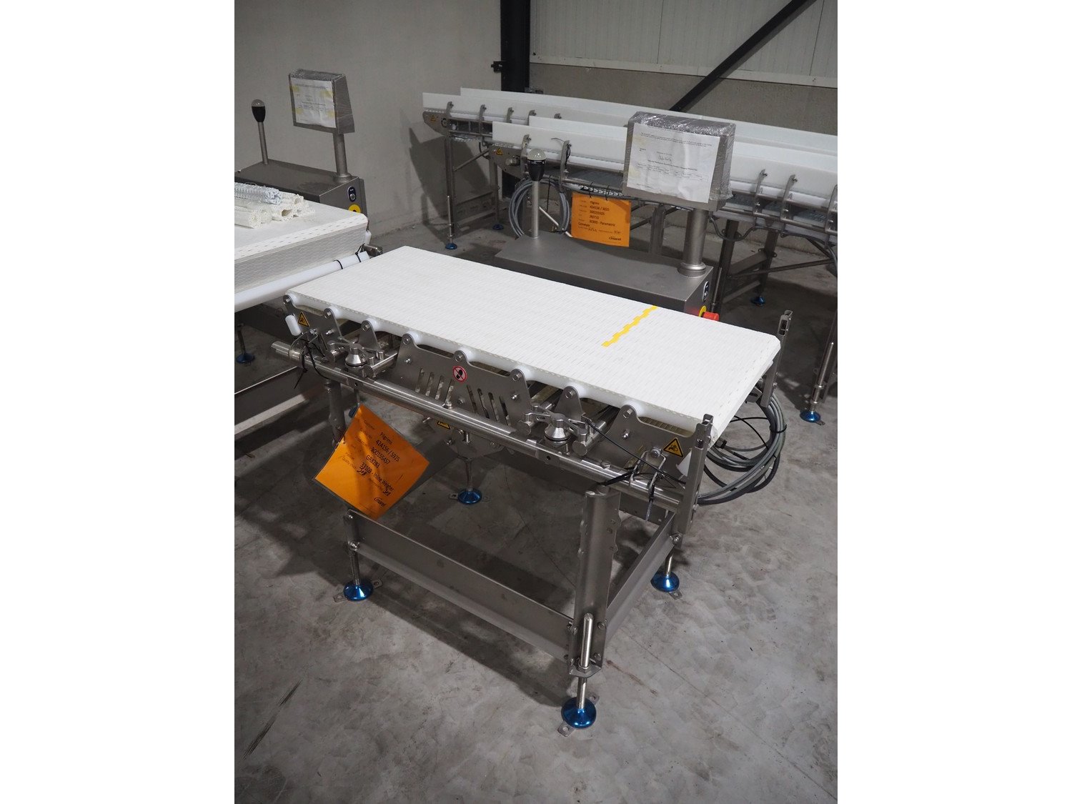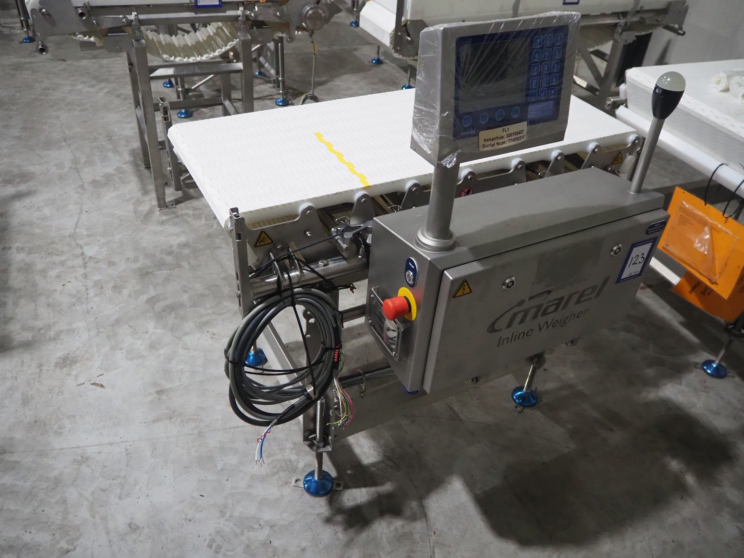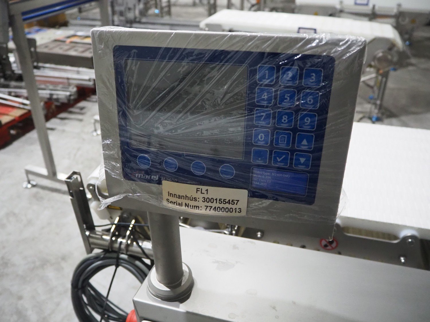 Marel inline weigher, model: M2400-IWU-2LC, serial number: 10523963, year of construction: 2023, max: 40 Kg, min: 0.4 Kg, e=d=0.02 Kg, plastic belt, belt width: 405 mm, total dimensions: 1050 mm x 800 mm x 1230 mm.