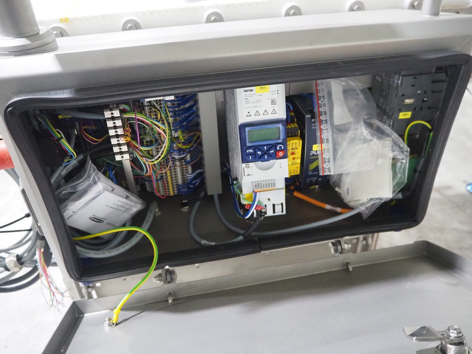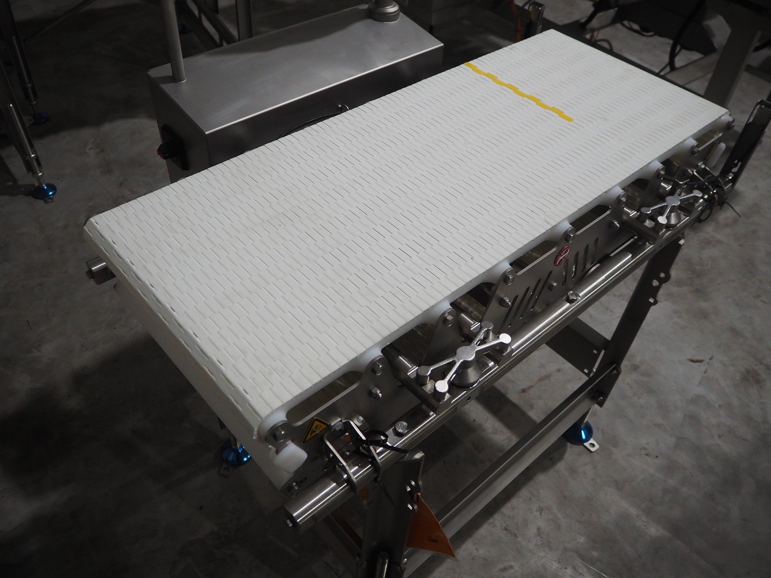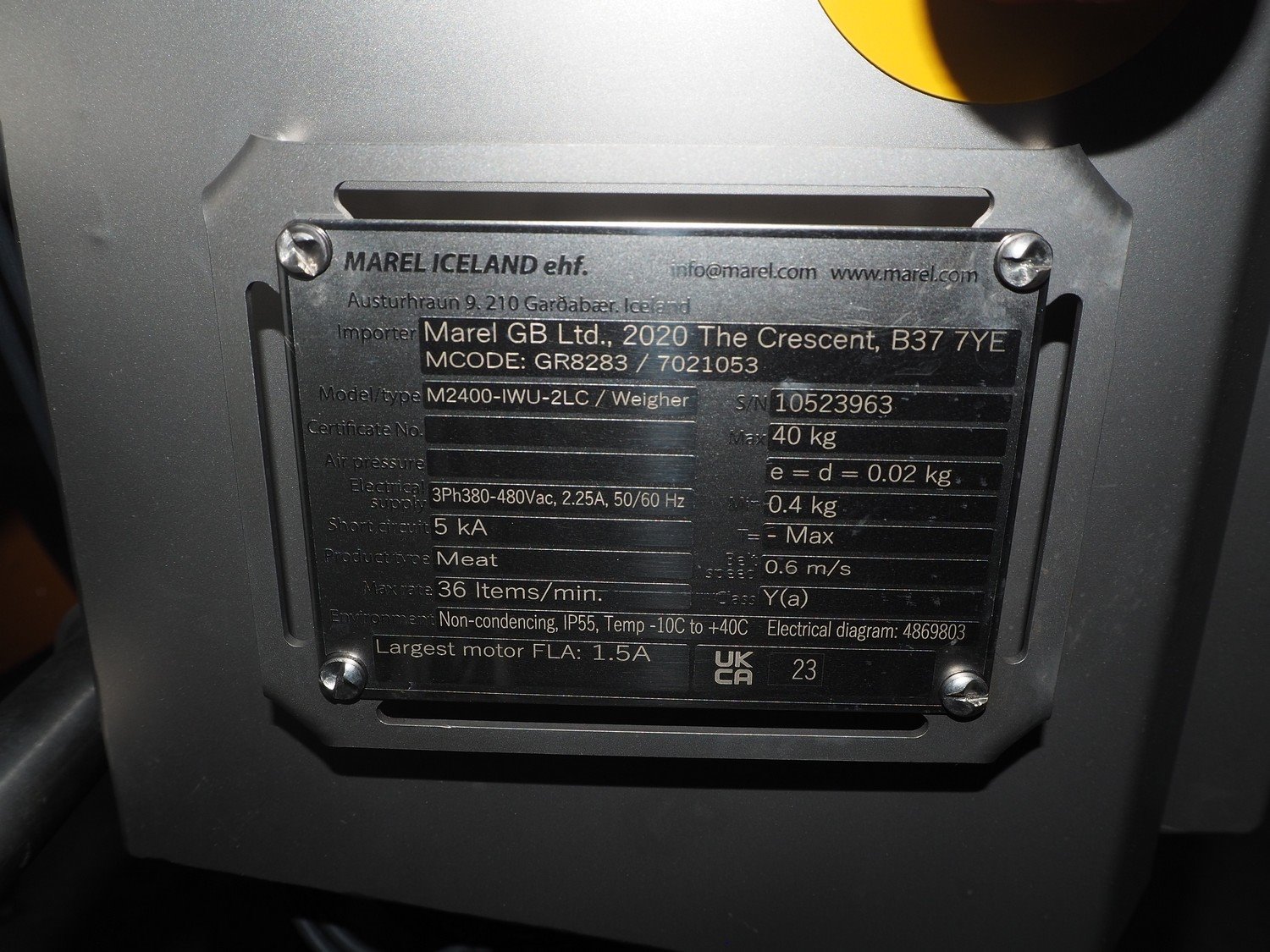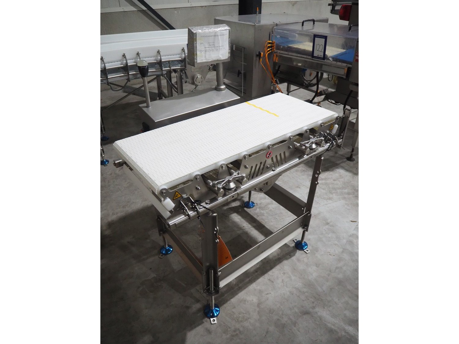 Marel inline weigher, model: M2400-IWU-2LC, serial number: 10523963, year of construction: 2023, max: 40 Kg, min: 0.4 Kg, e=d=0.02 Kg, plastic belt, belt width: 405 mm, total dimensions: 1050 mm x 800 mm x 1230 mm.