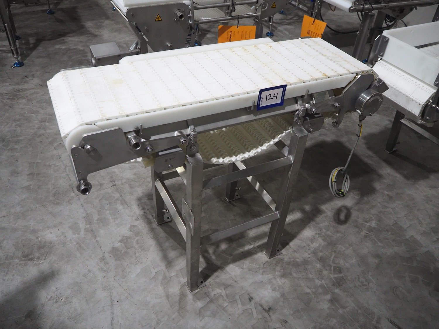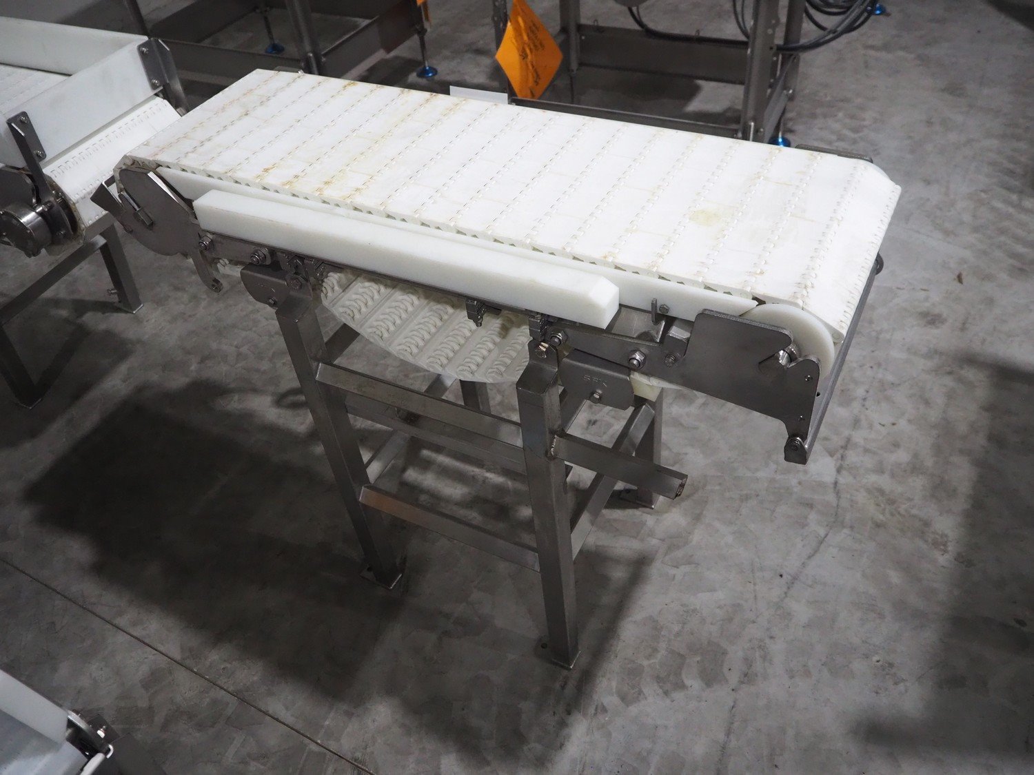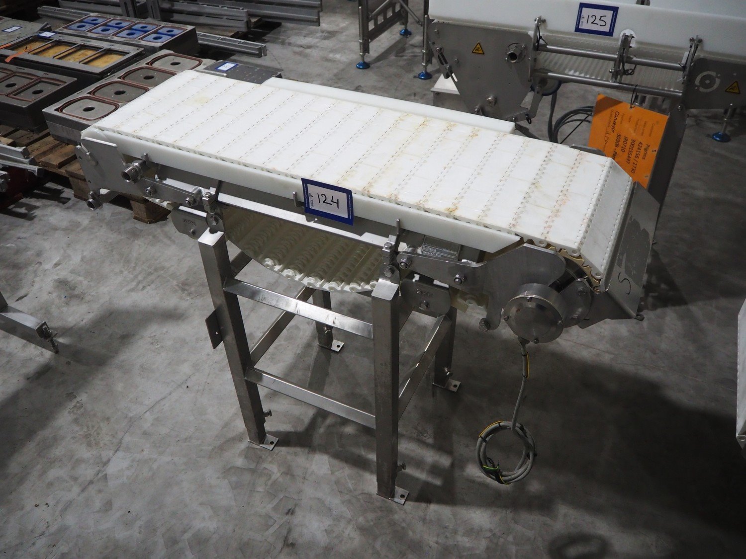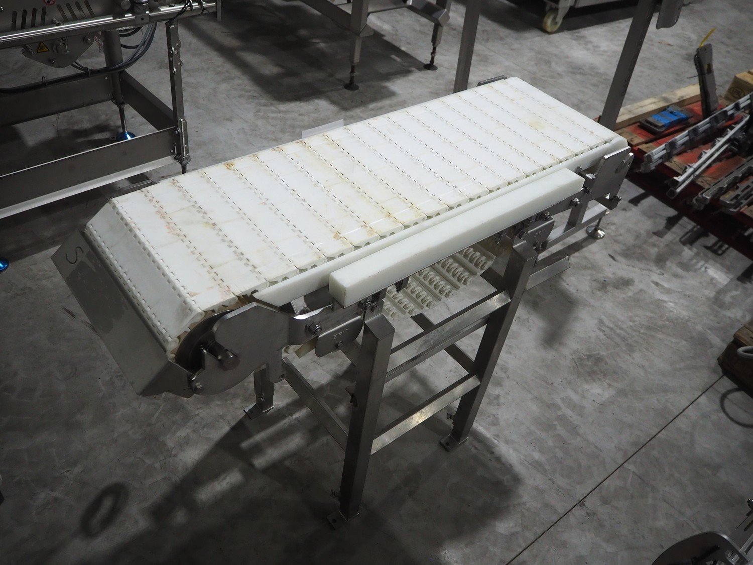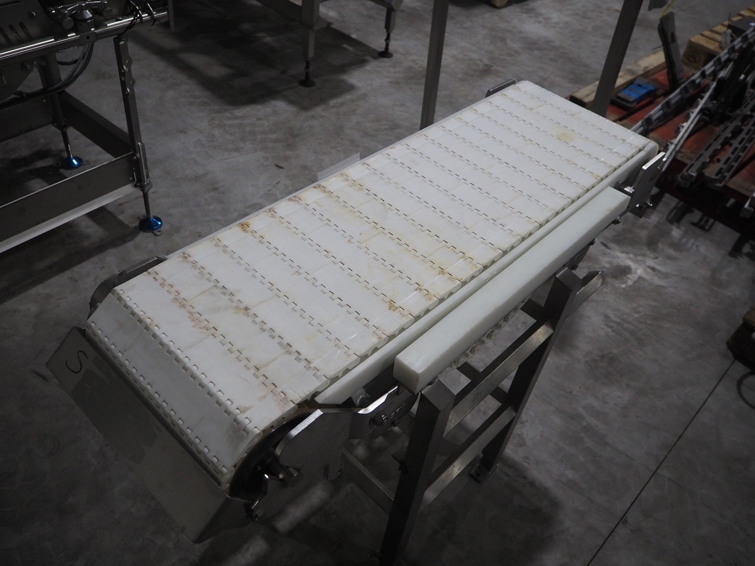 Marel transport belt, number: 1100037992, year of construction: 21-08-2015, plastic belt, belt width: 300 mm, total dimensions: 1150 mm x 450 mm x 870 mm.
