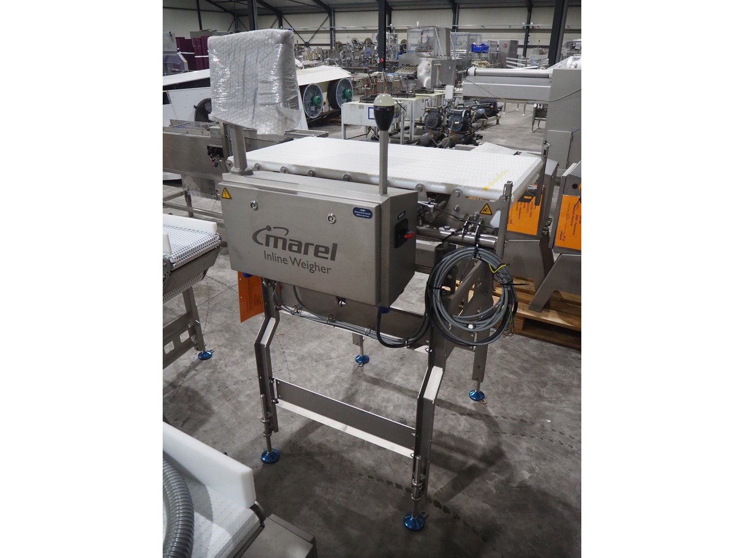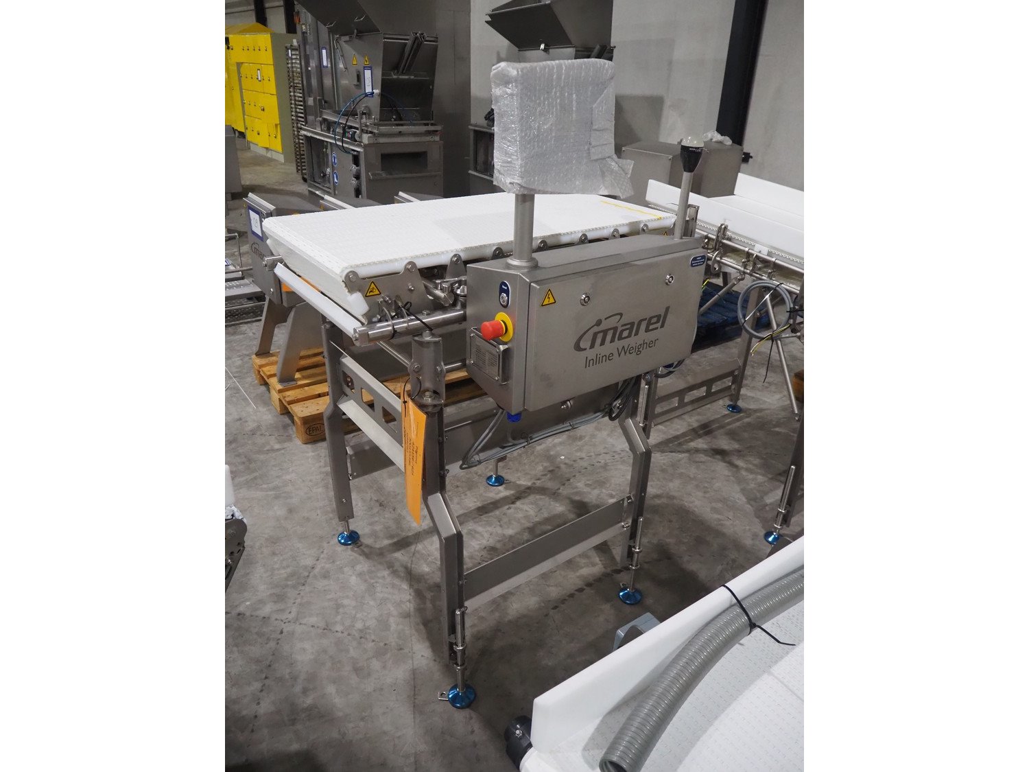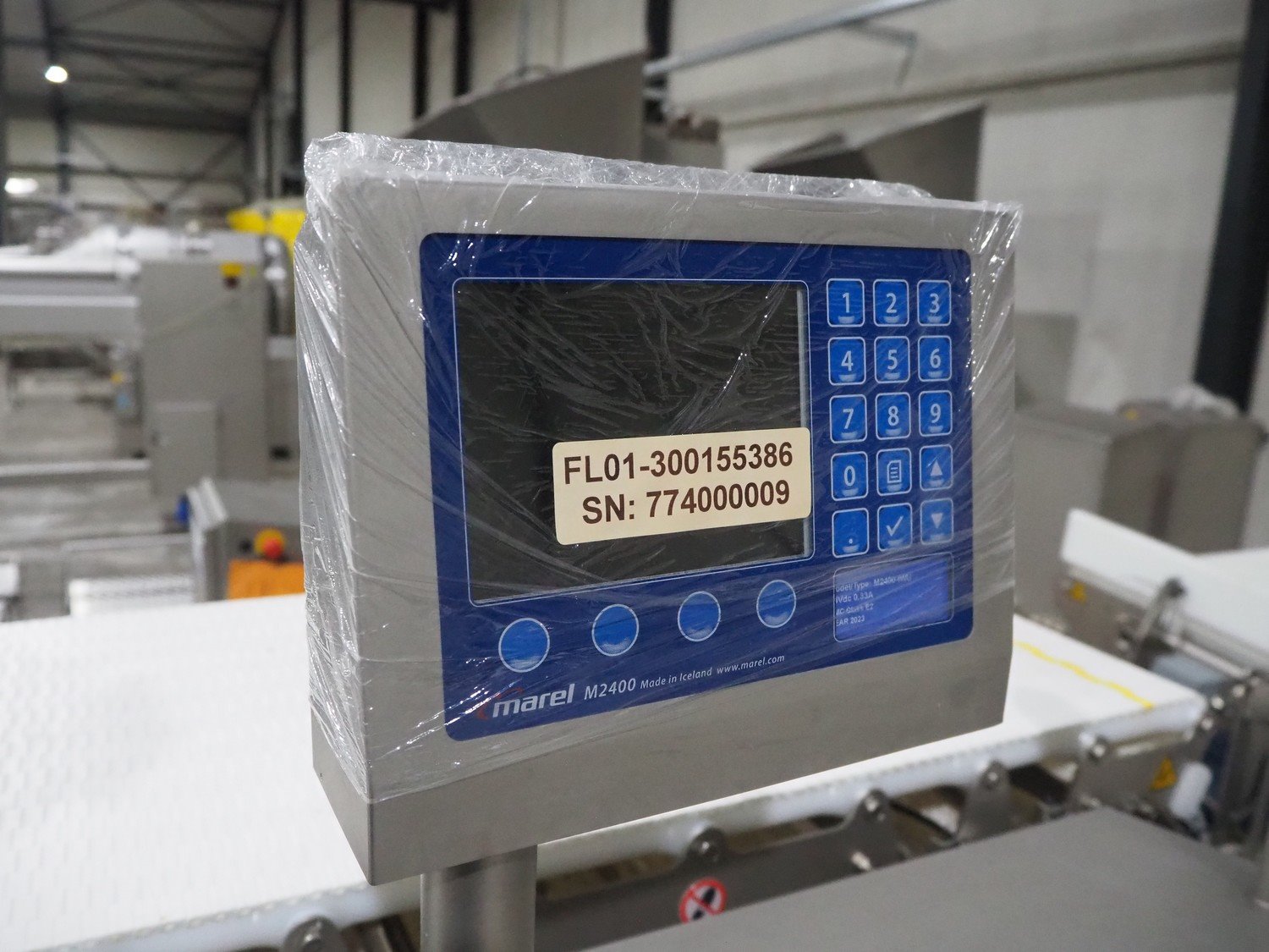 Marel inline weigher, model: M2400-IWU-2LC, serial number: 10523959, year of construction: 2023, max: 40 Kg, min: 0.4 Kg, e=d=0.02 Kg, plastic belt, belt width: 505 mm, total dimensions: 1050 mm x 900 mm x 1650 mm.
