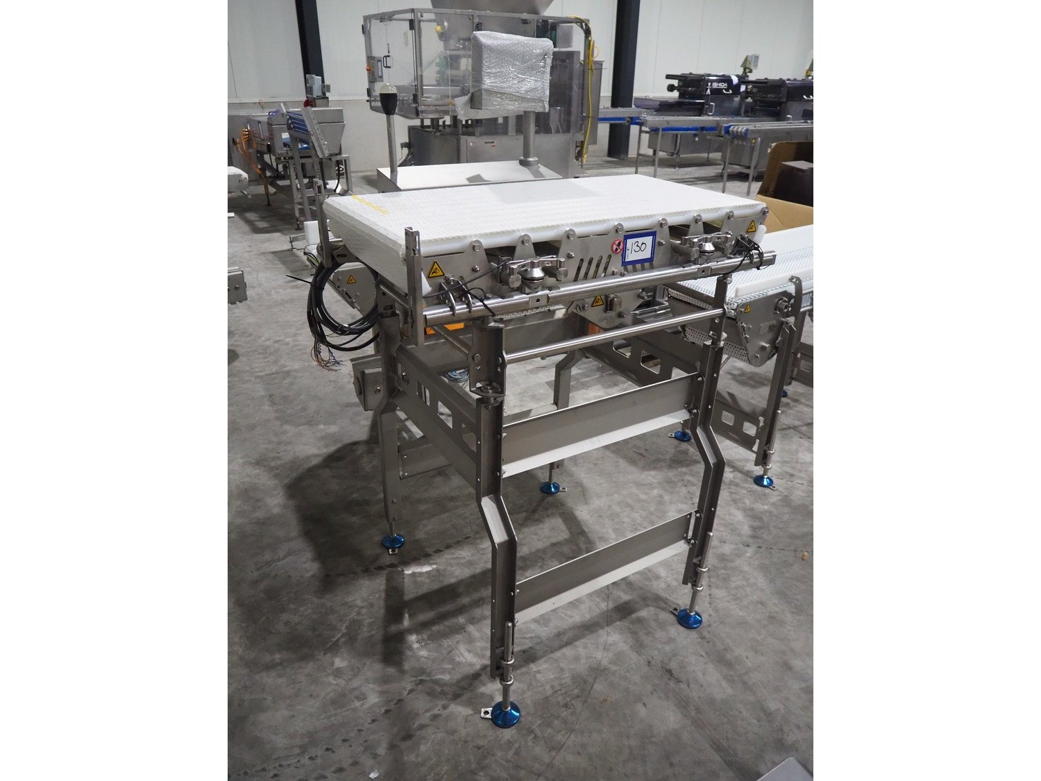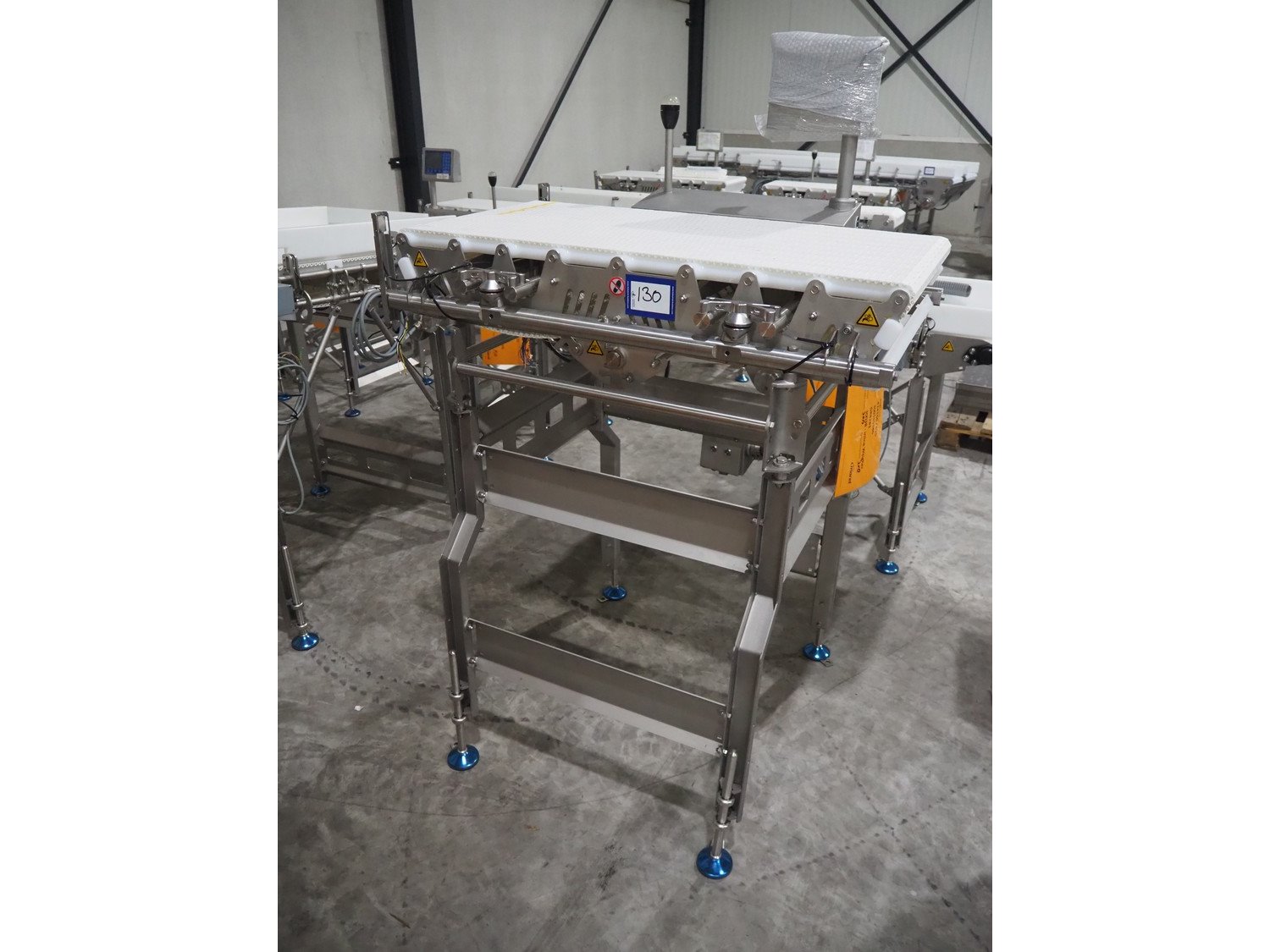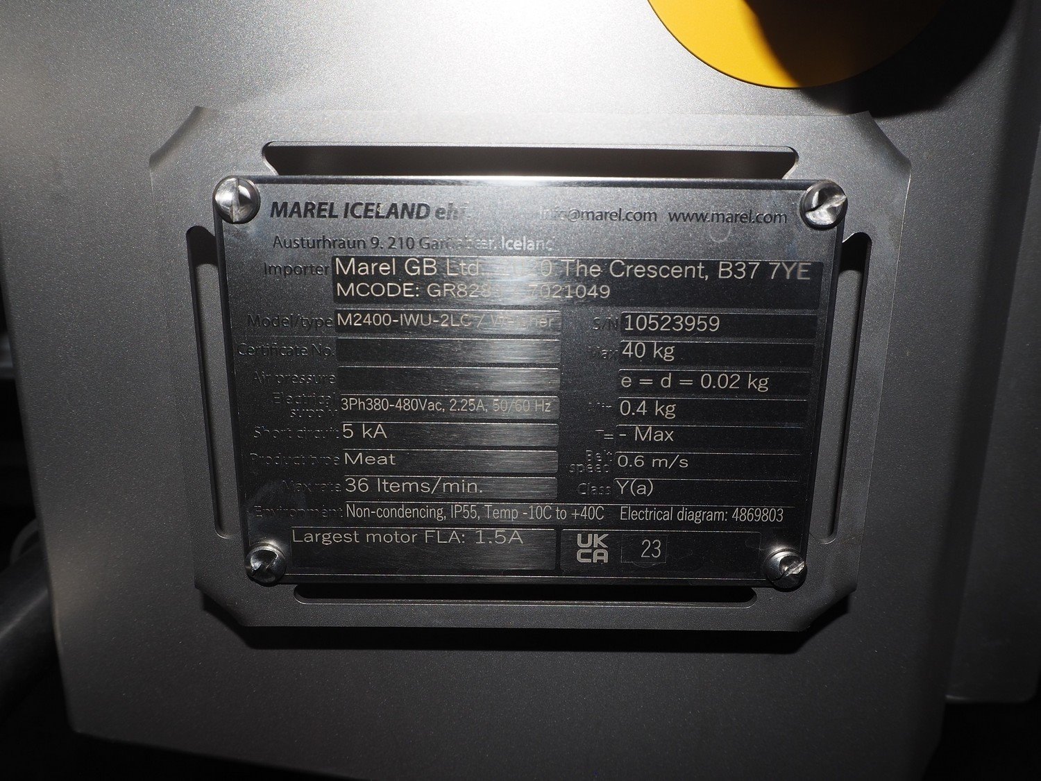 Marel inline weigher, model: M2400-IWU-2LC, serial number: 10523959, year of construction: 2023, max: 40 Kg, min: 0.4 Kg, e=d=0.02 Kg, plastic belt, belt width: 505 mm, total dimensions: 1050 mm x 900 mm x 1650 mm.