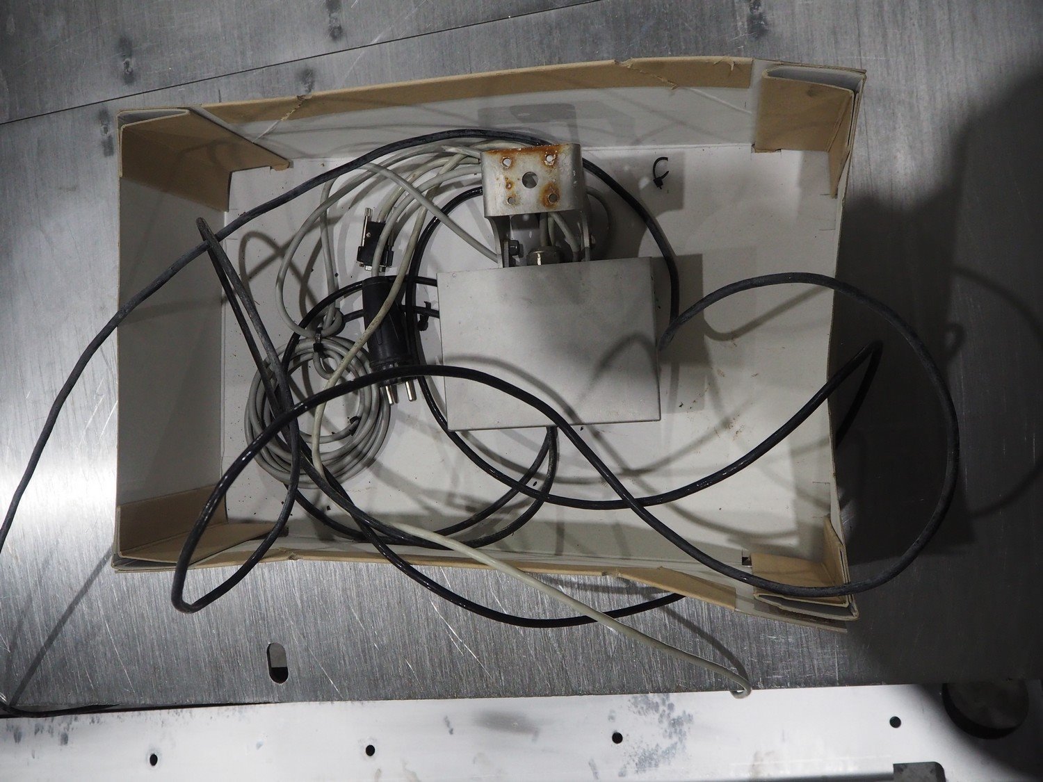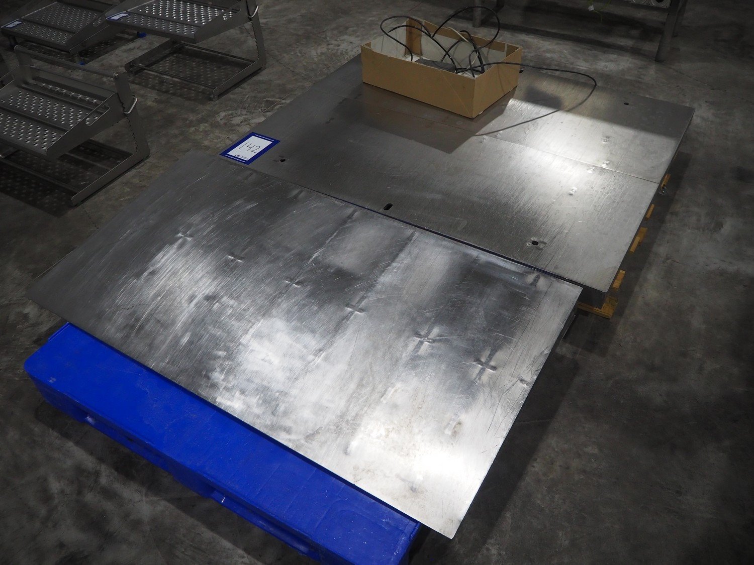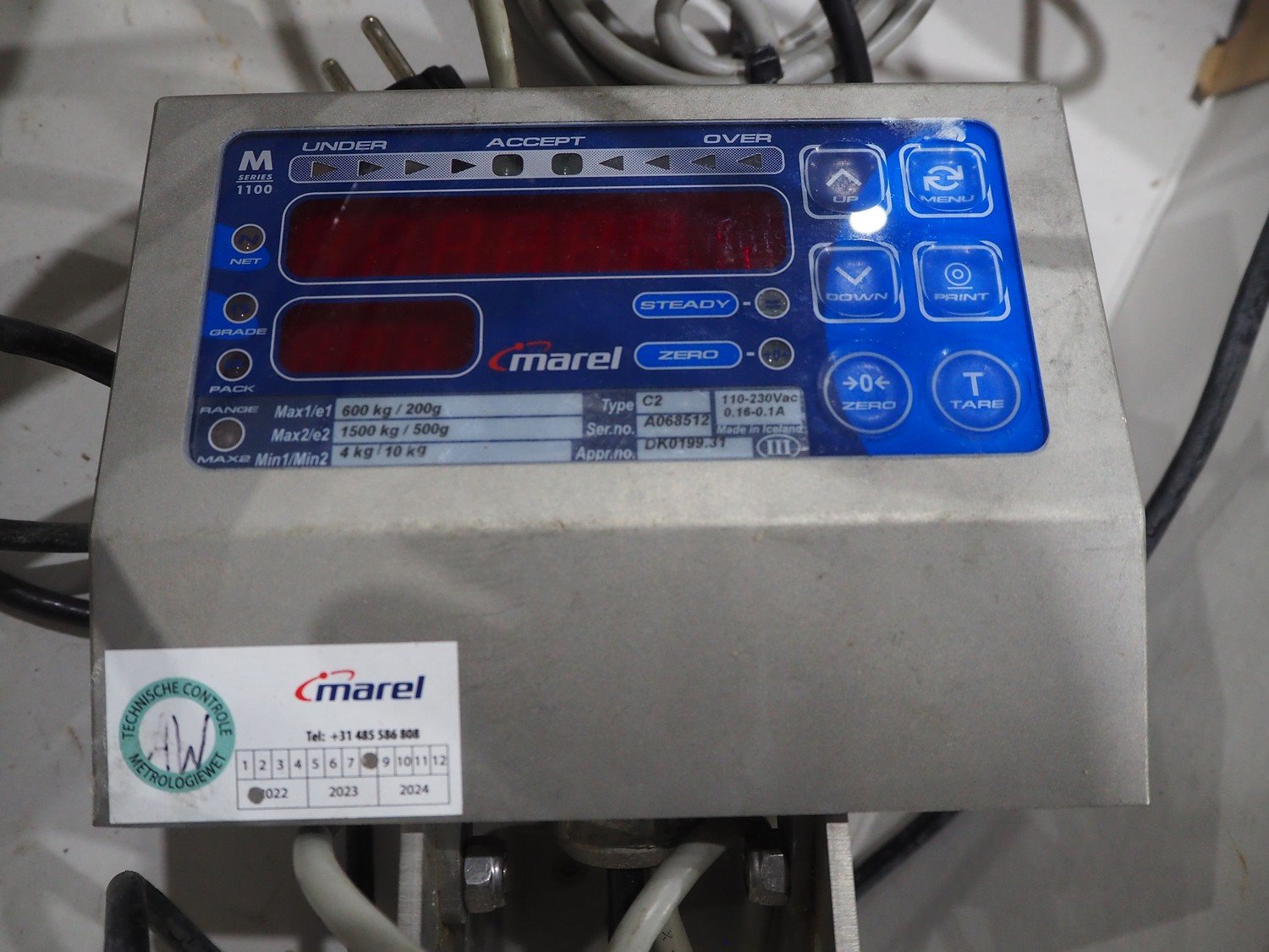 S/s floor weighing scale with Marel indicator, type indicator: C2, serial number: A068512, 110/230 V, 0.16/0.1 A, Max1/e1: 600 kg / 200g, Max2/e2: 1500 kg / 500g, min1/min2: 4 kg / 10 kg, dimensions ramp: 1500 mm x 800 x 100 mm, dimensions: 1500 mm x 1250 x 100 mm.