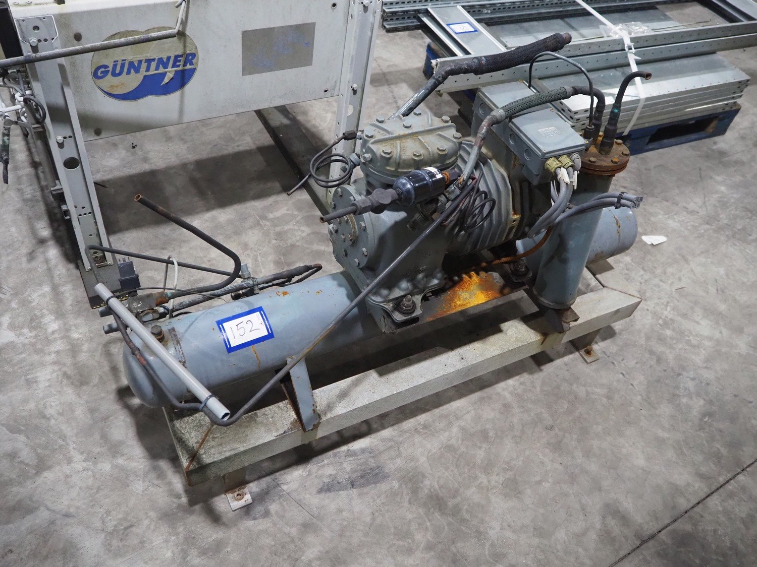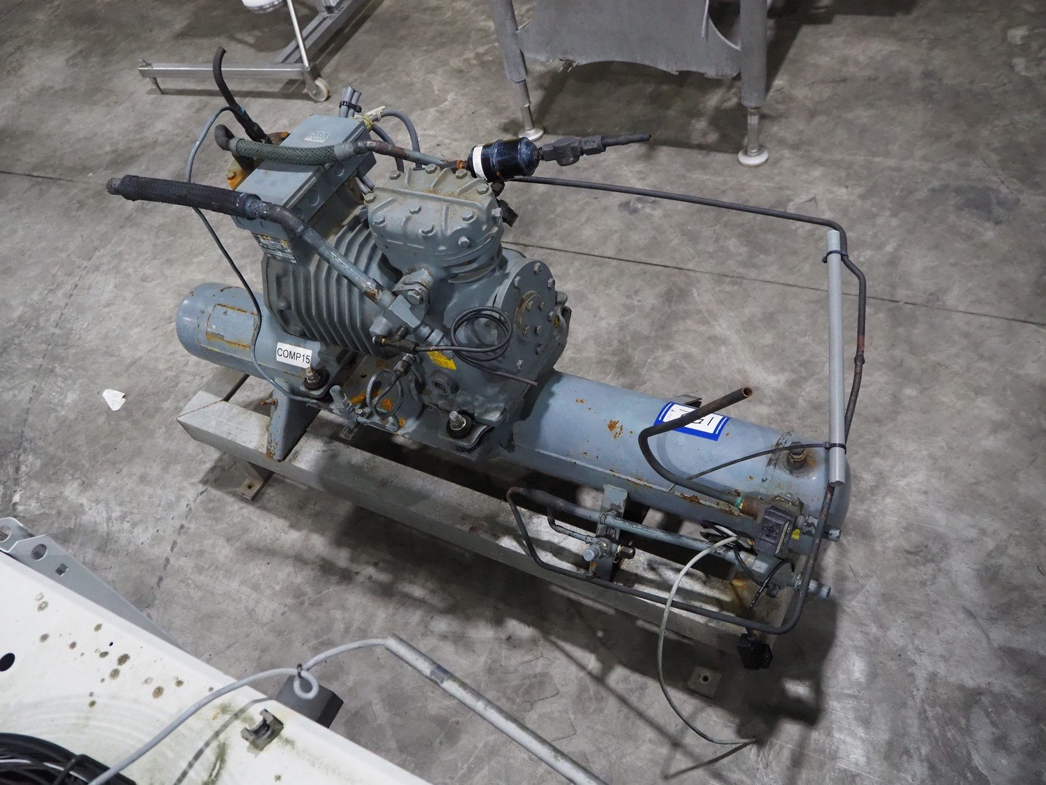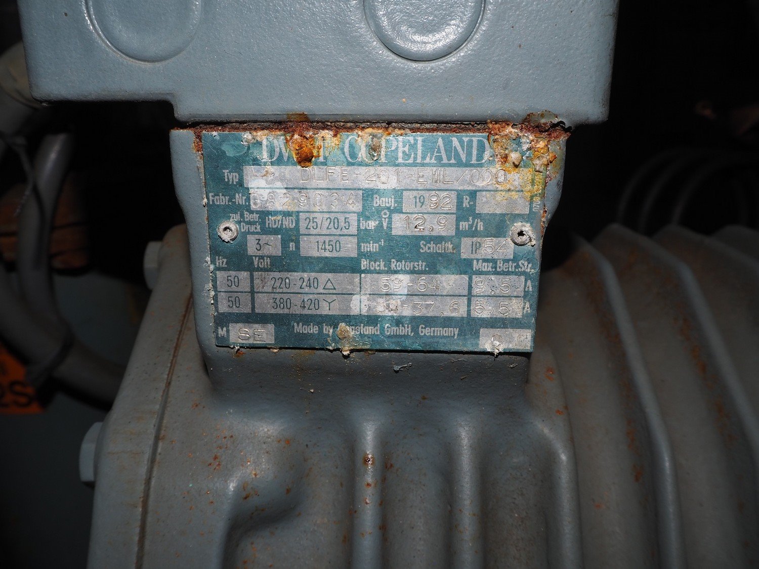 DWM Copeland cooling compressor, type: 0829034, serial number: 370310, year of construction: 1992, 220/240/380/420 V, 3 Ph, 50 Hz, 9.5/5.5 A, capacity 12.9 m³ per hour, dimensions: 1250 mm x 500 mm x 720 mm.