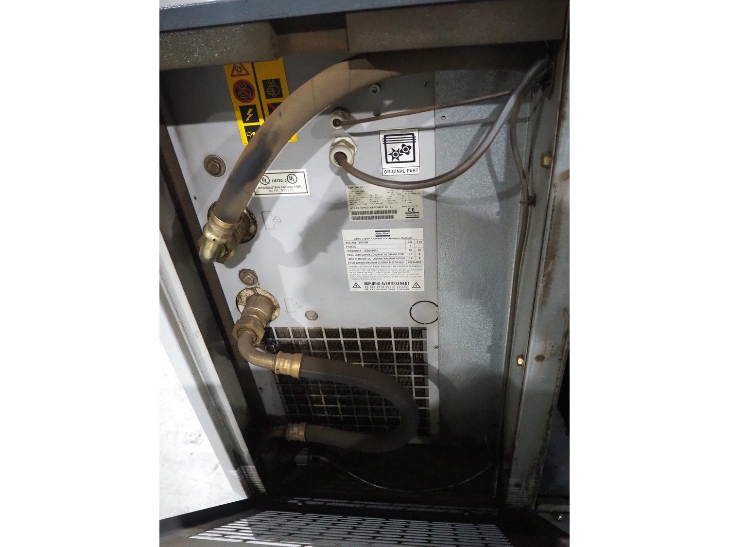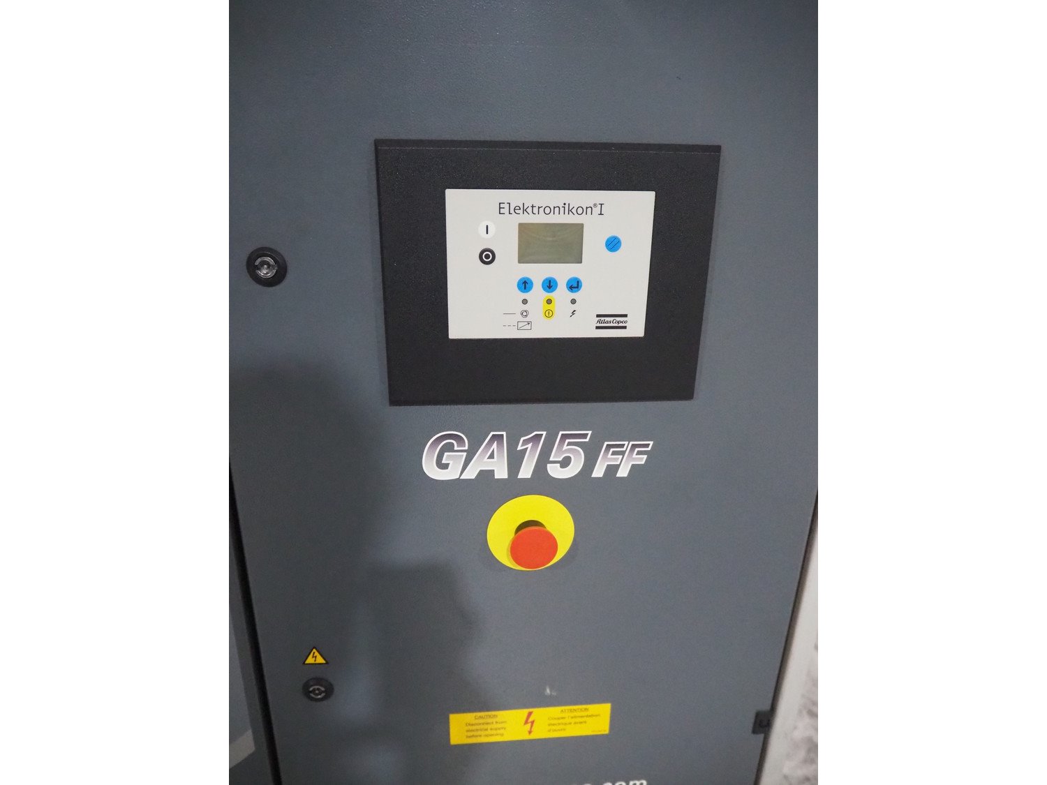 Atlas Copco air compressor, type: GA15, serial number: API456568, year of construction: 2008, 15 kW, 7.2 bar, 3540 rpm, 2.55m³ per minute, working hours: 26540, weight: 440/565 kg, dimensions: 1800 mm x 700 mm x 1550 mm.