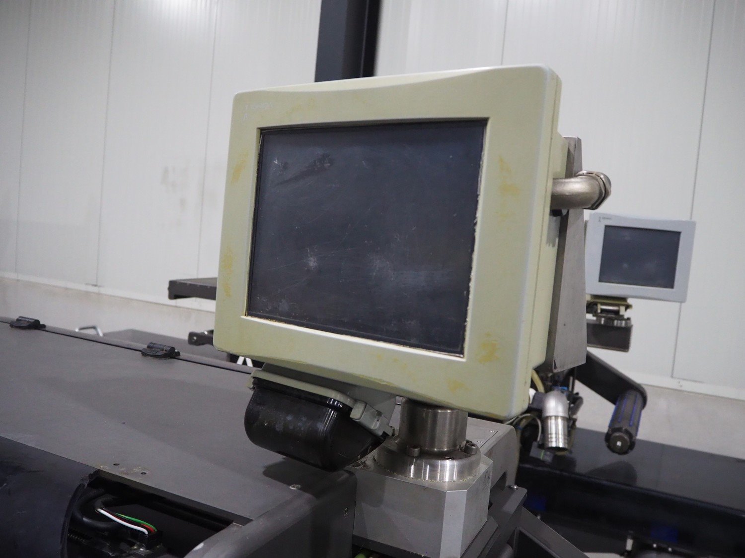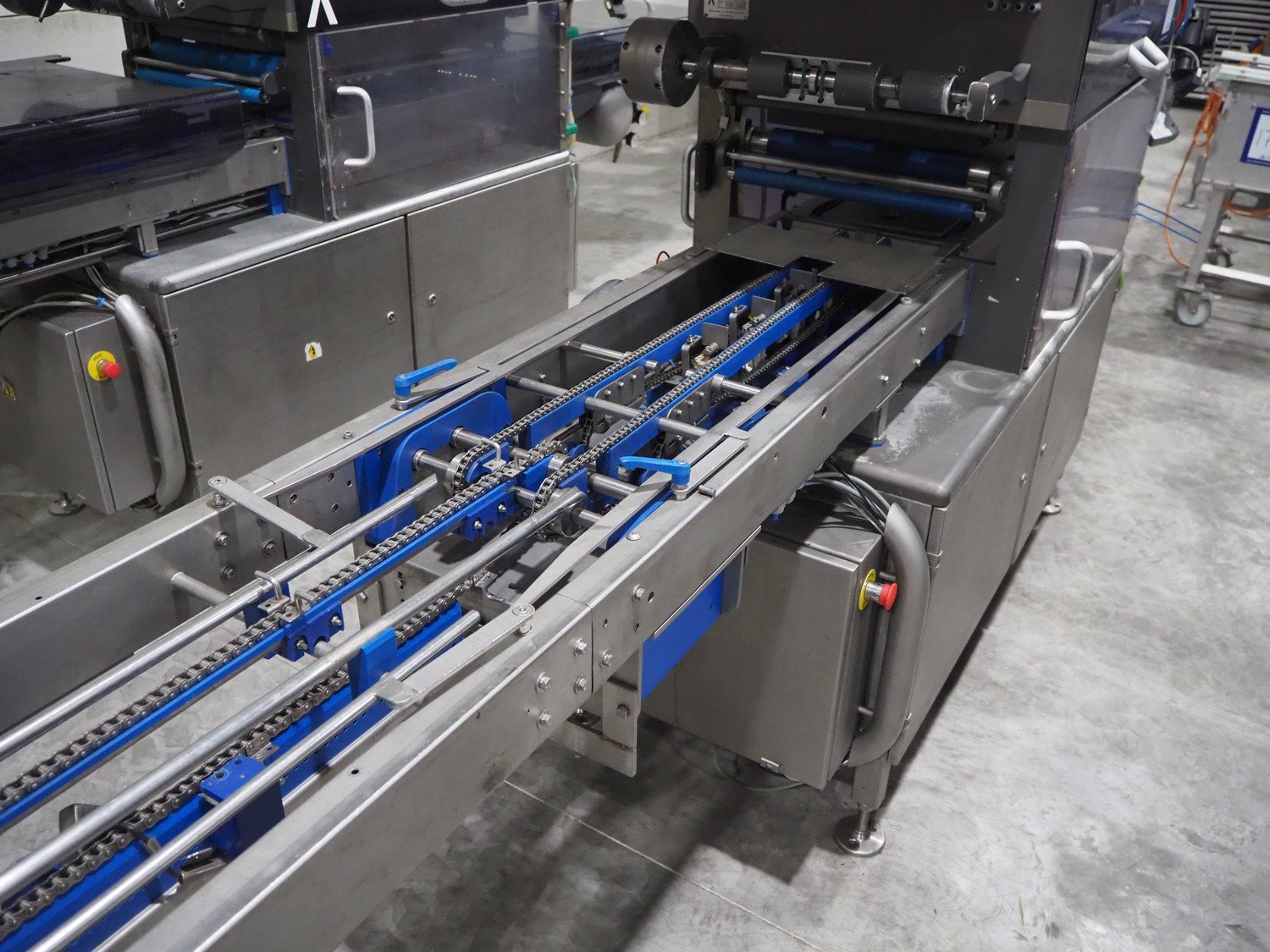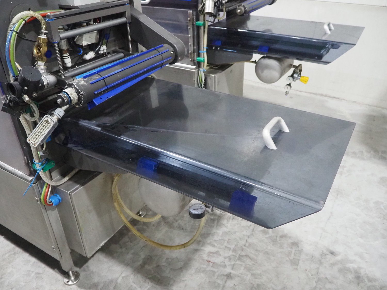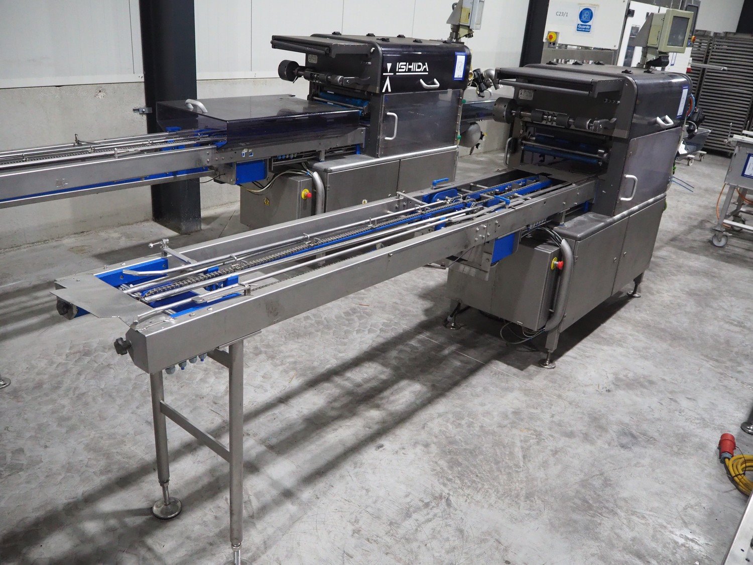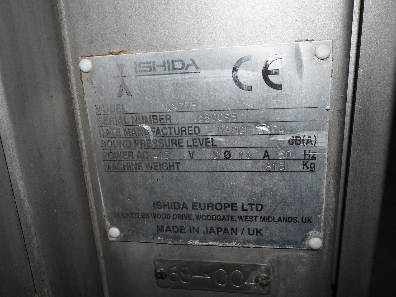 Ishida traysealer, model: QX775, serial number: 580095, year of construction: 03/2004, 415 V, 3 Ph, 50 Hz, 16 A, 815 kg, s/s chain conveyor with dividers, distance between dividers: 300 mm, dimensions dye: (4x) 180 mm x 280 mm, total dimensions: 4750 mm x 800 mm x 1820 mm.
