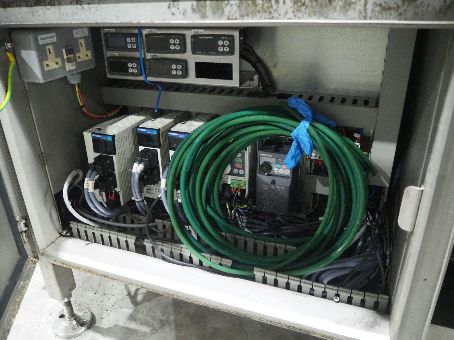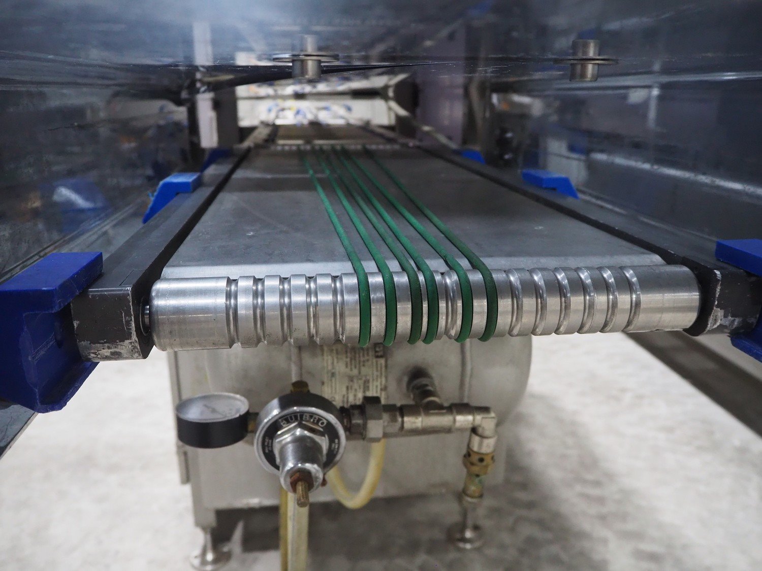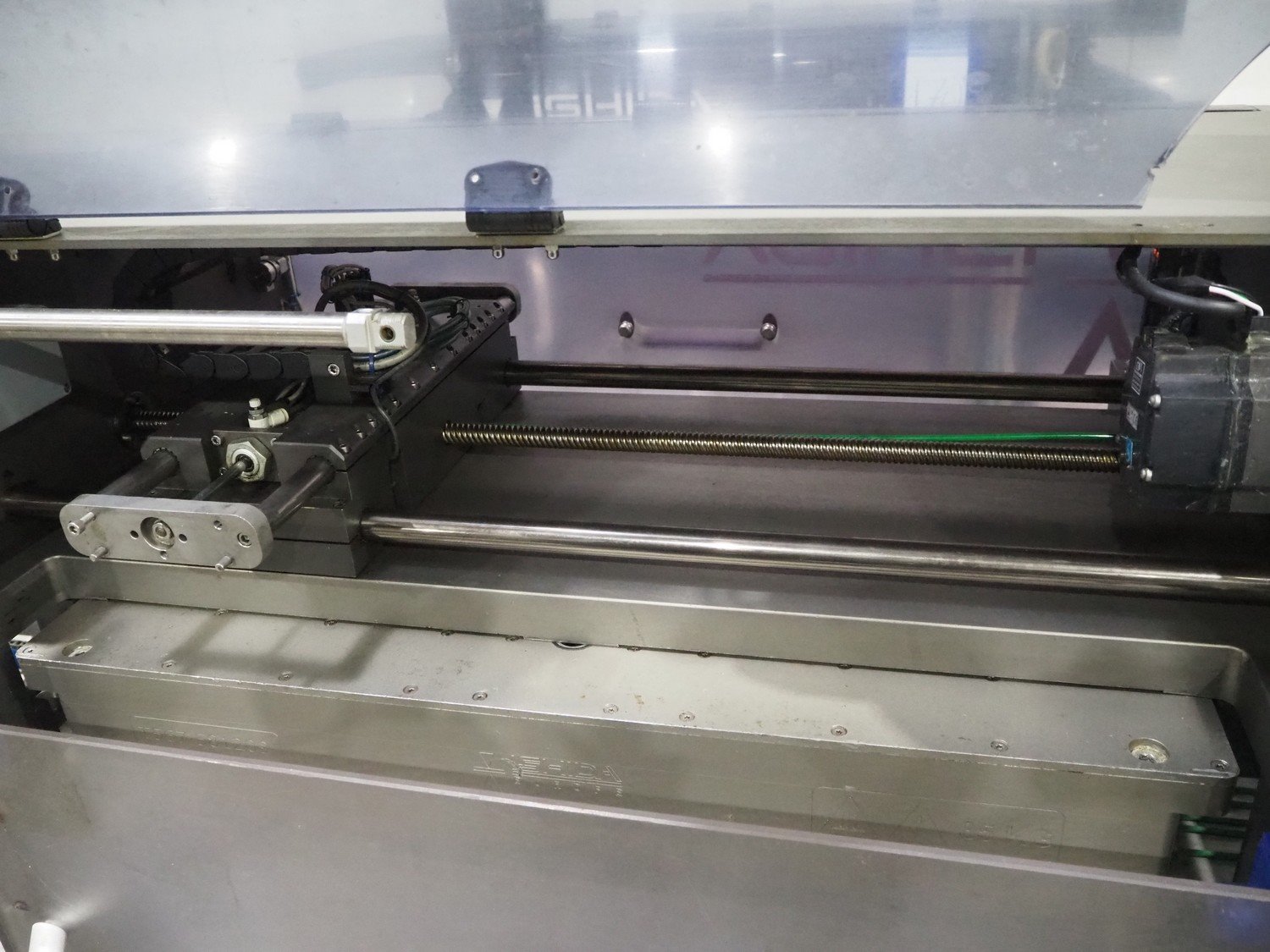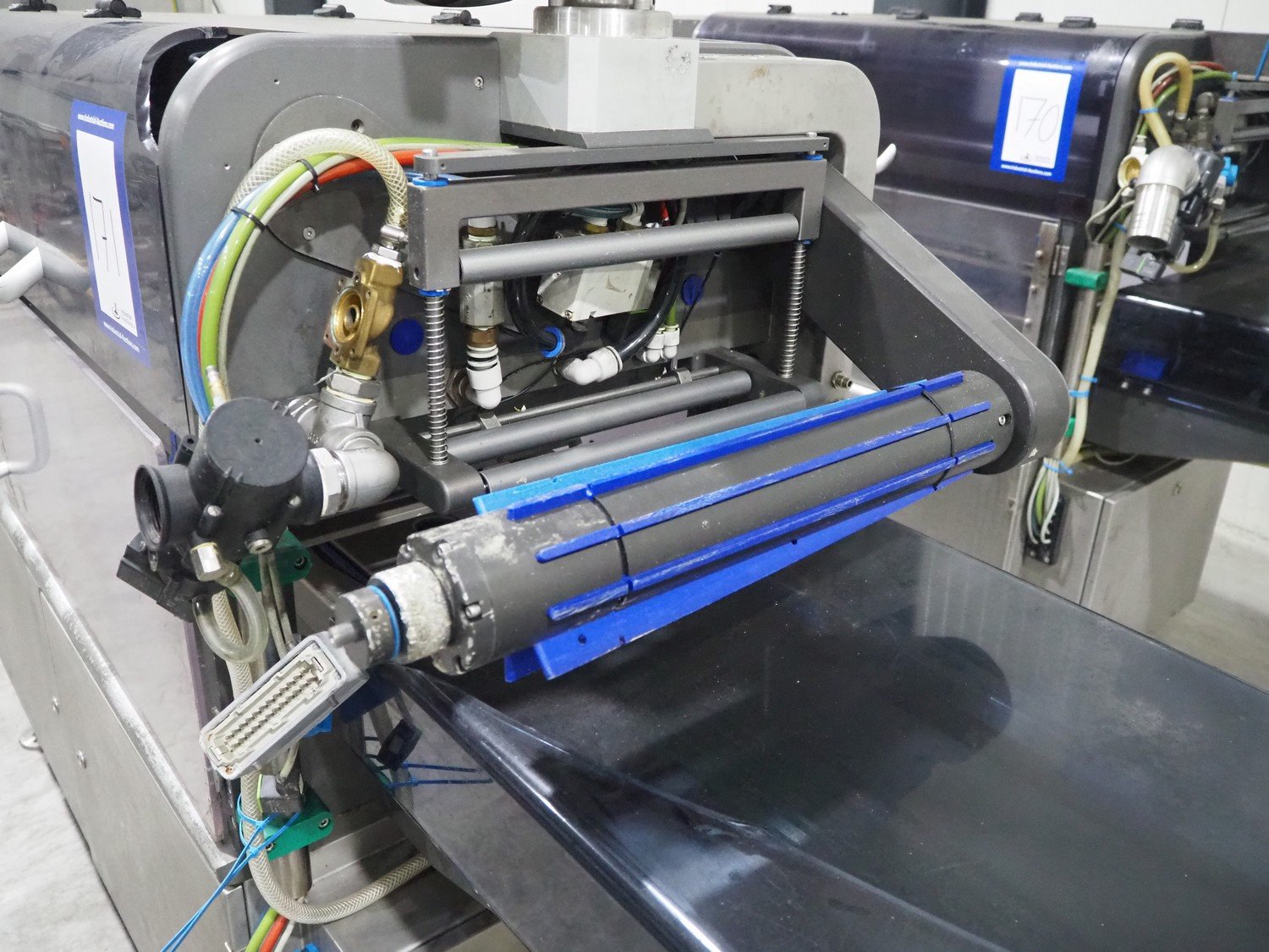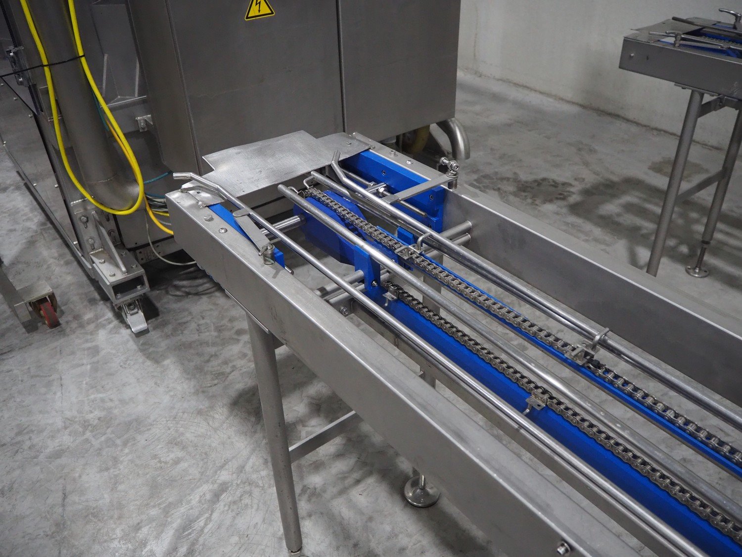 Ishida traysealer, model: QX775, serial number: 580095, year of construction: 03/2004, 415 V, 3 Ph, 50 Hz, 16 A, 815 kg, s/s chain conveyor with dividers, distance between dividers: 300 mm, dimensions dye: (4x) 180 mm x 280 mm, total dimensions: 4750 mm x 800 mm x 1820 mm.
