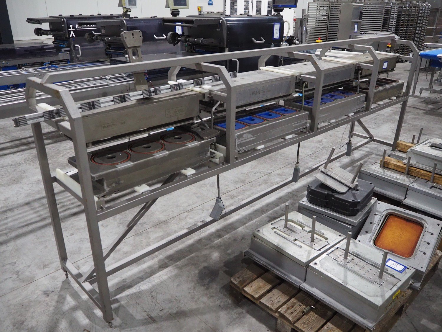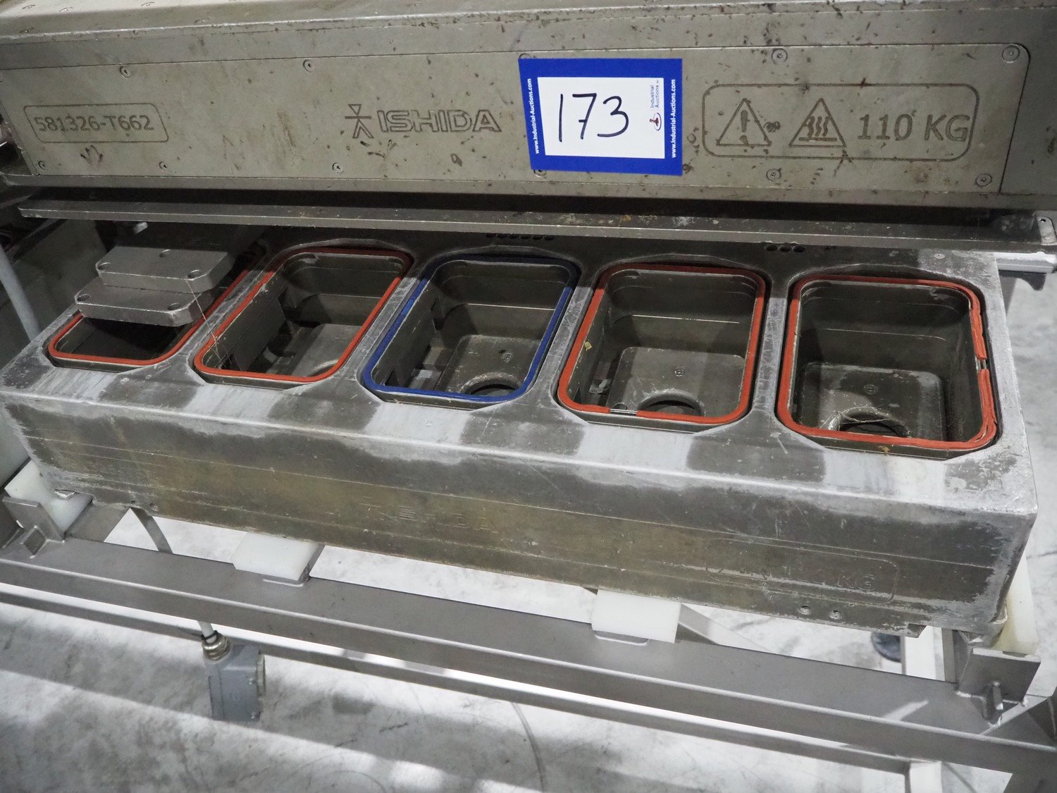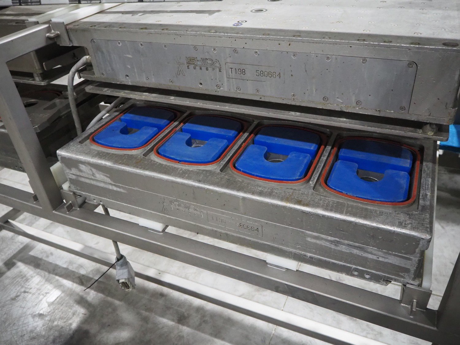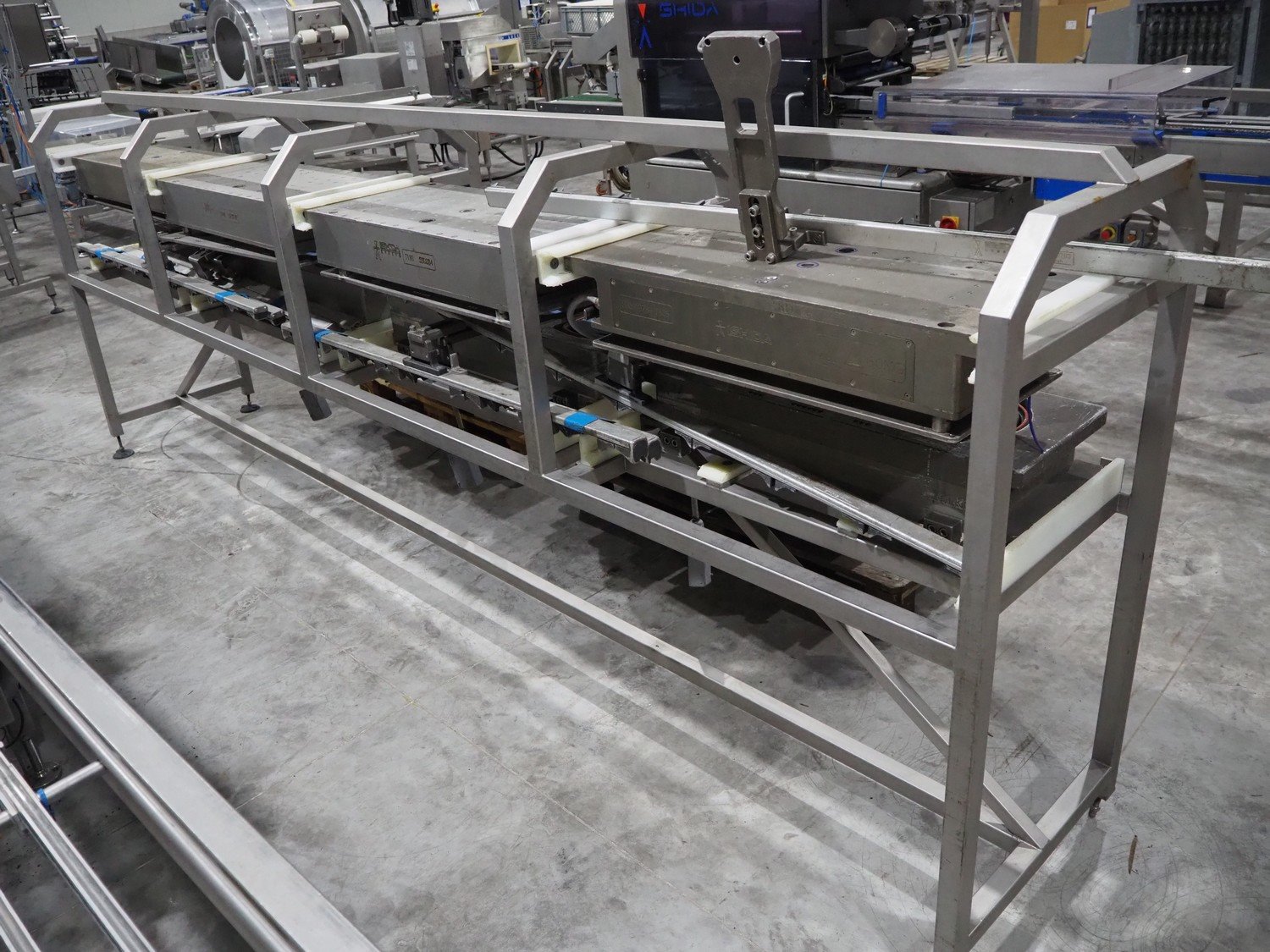 Ishida s/s rack for dye's, 4 dyes, dimensions: (5x) 165 mm x 120, (4x) 200 mm x 150 mm, (4x) 200 mm x 150 mm, (3x) Ø 185 mm, total dimensions: 3650 mm x 595 mm x 1350 mm.