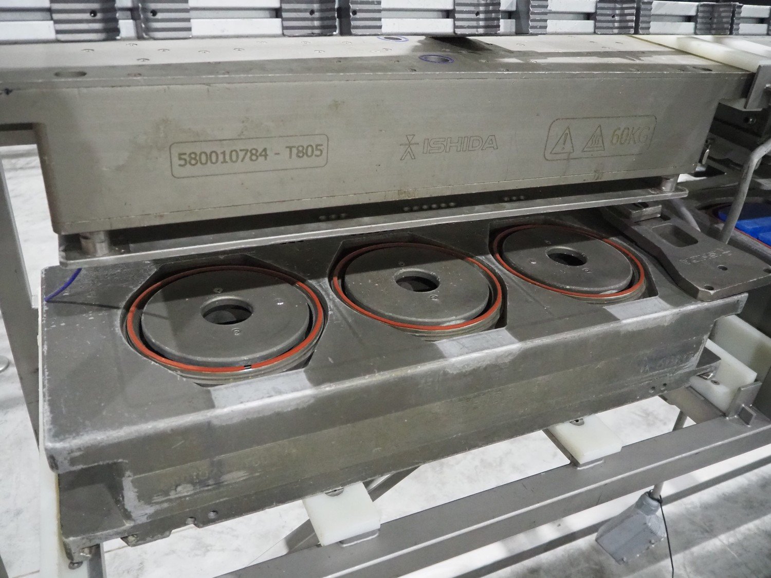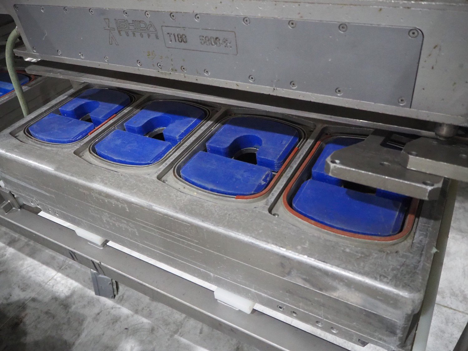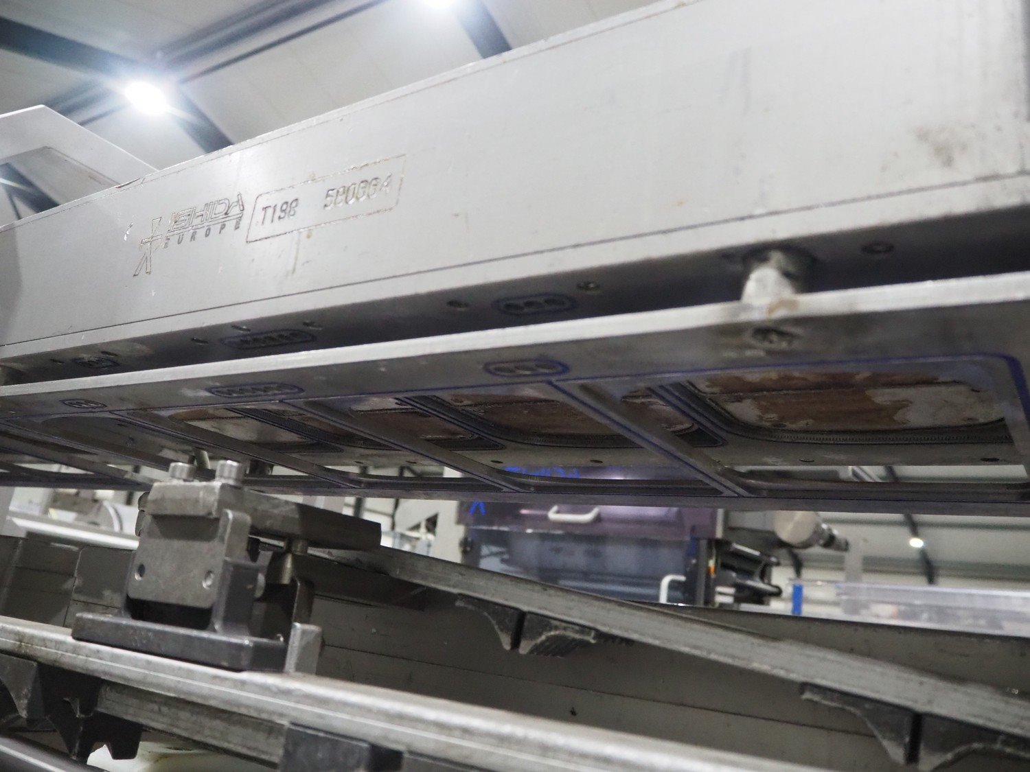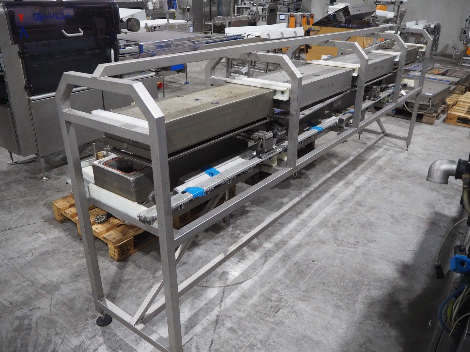 Ishida s/s rack for dye's, 4 dyes, dimensions: (5x) 165 mm x 120, (4x) 200 mm x 150 mm, (4x) 200 mm x 150 mm, (3x) Ø 185 mm, total dimensions: 3650 mm x 595 mm x 1350 mm.