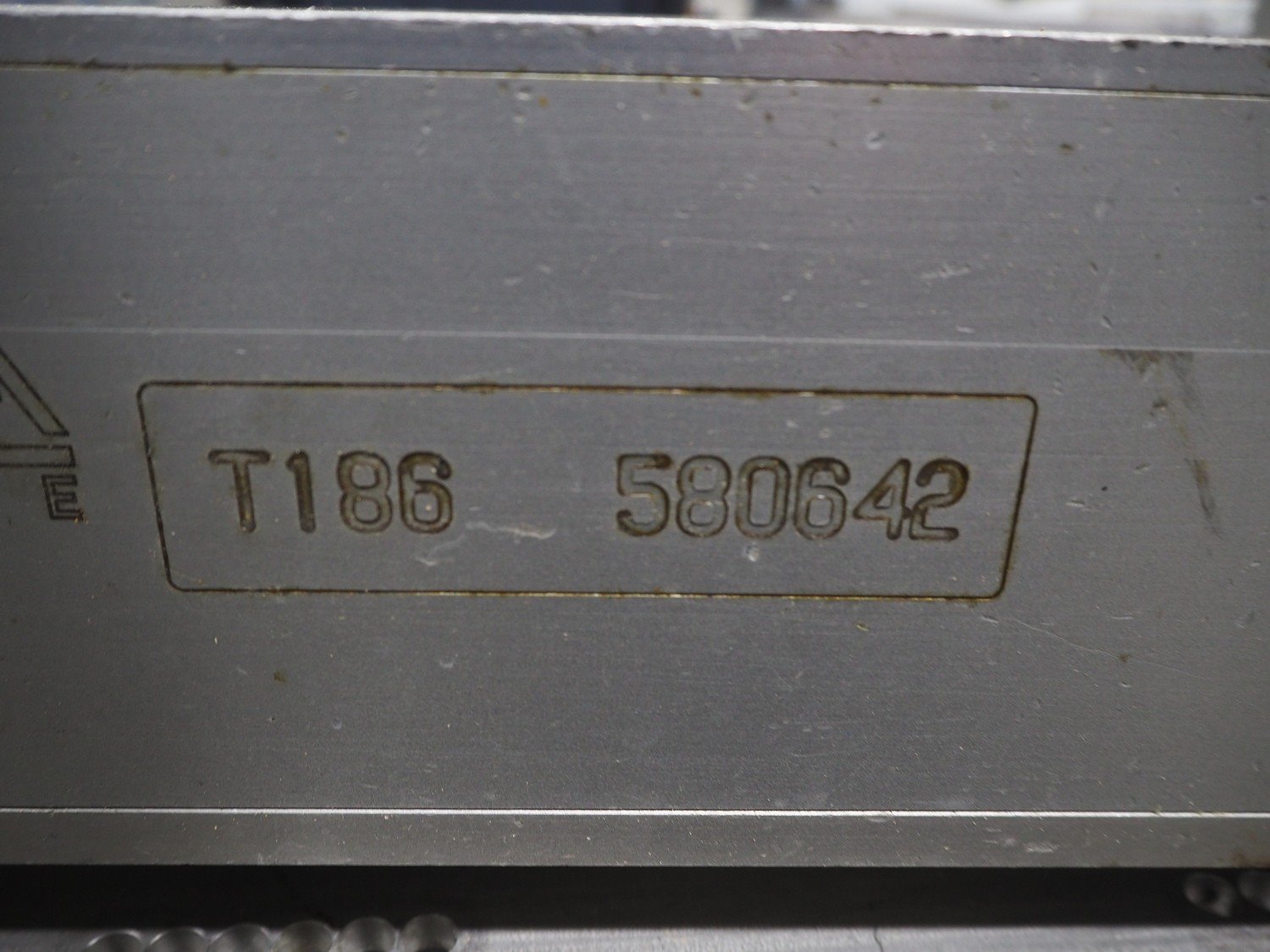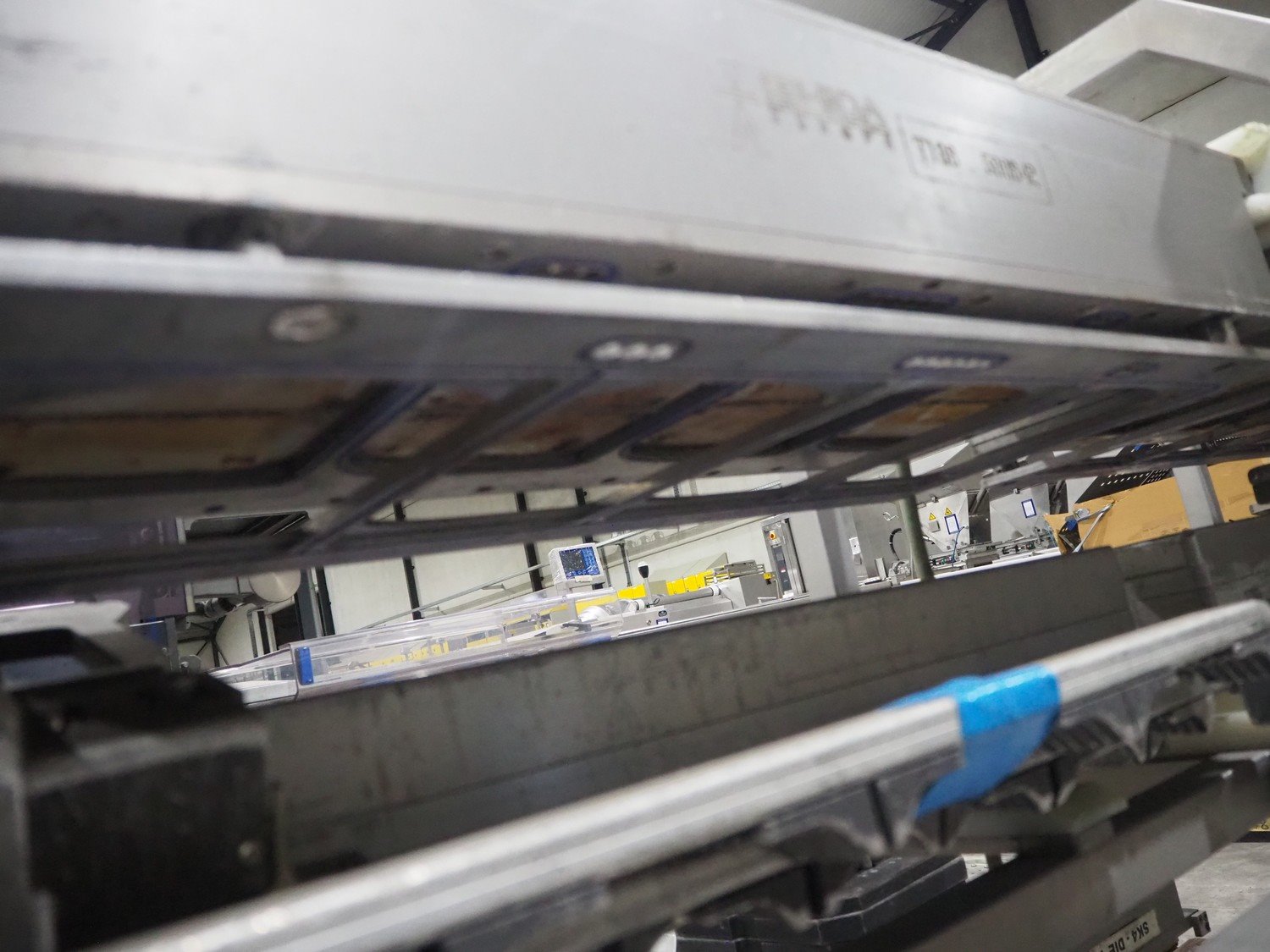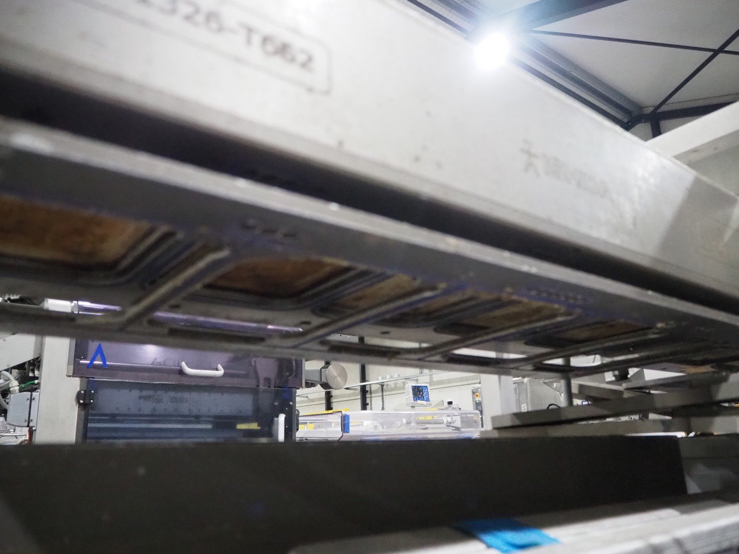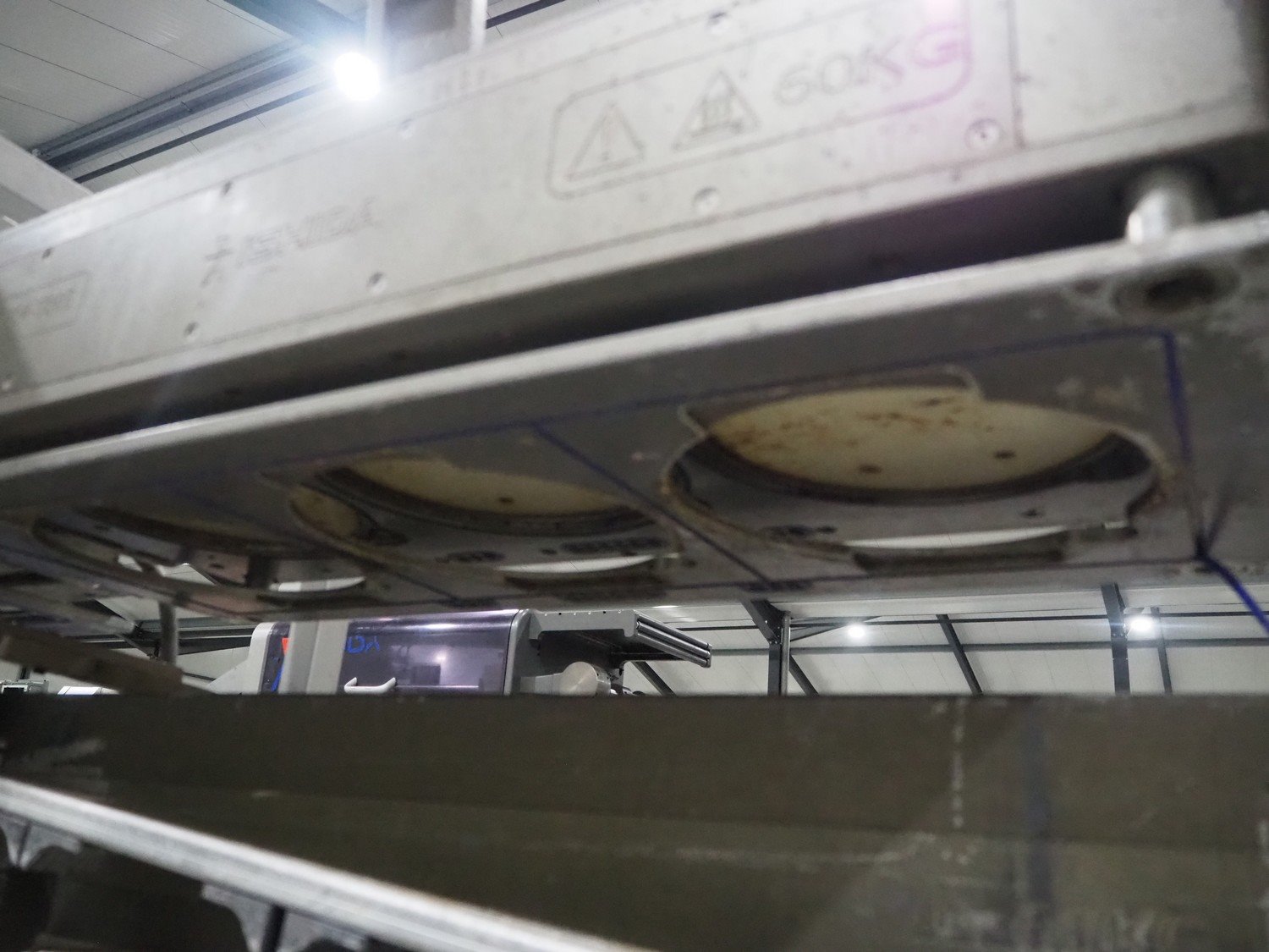 Ishida s/s rack for dye's, 4 dyes, dimensions: (5x) 165 mm x 120, (4x) 200 mm x 150 mm, (4x) 200 mm x 150 mm, (3x) Ø 185 mm, total dimensions: 3650 mm x 595 mm x 1350 mm.