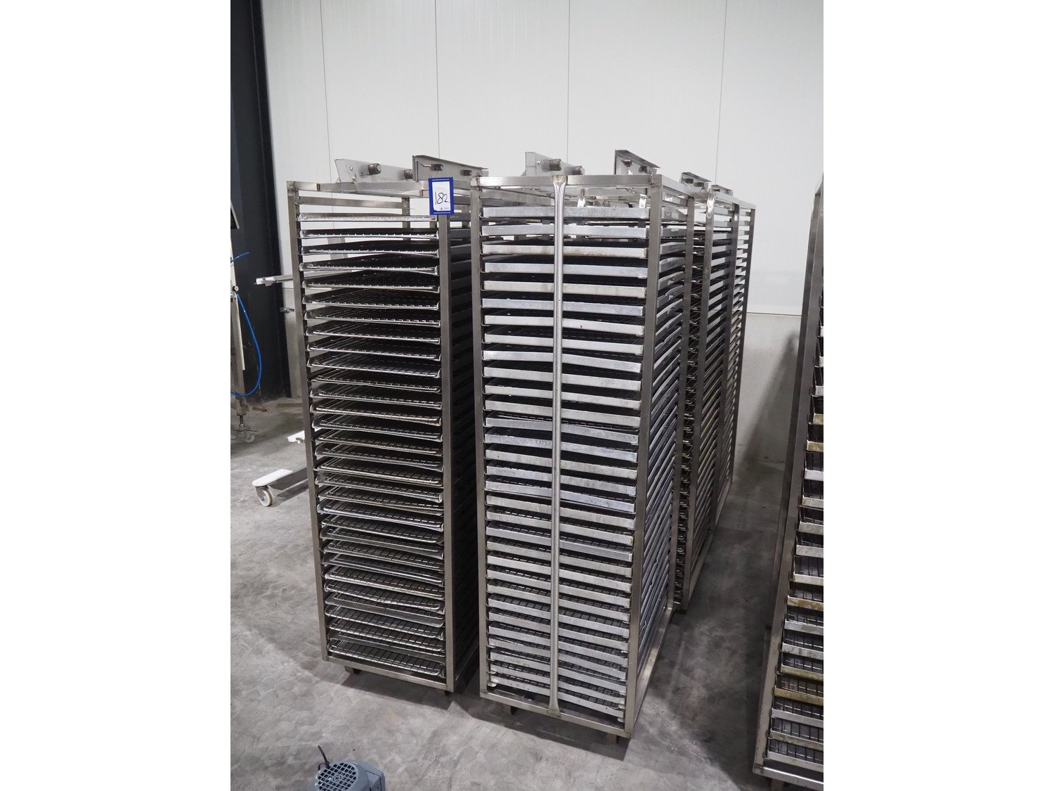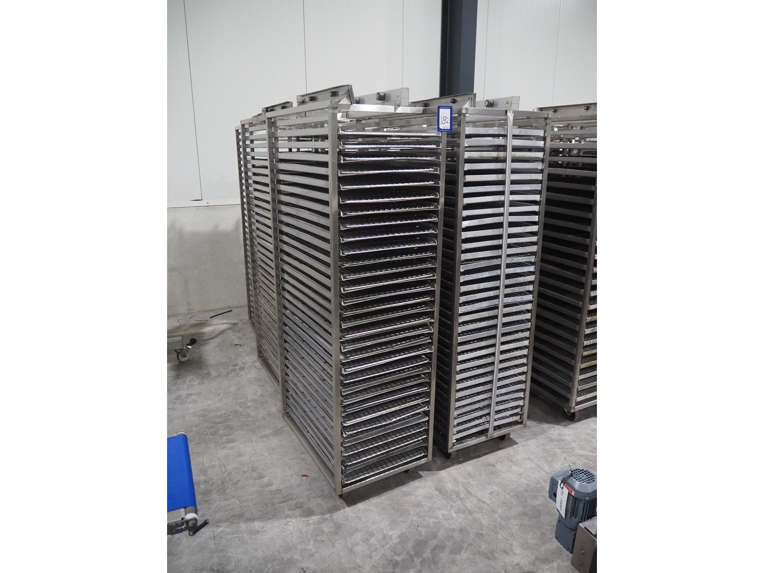 6 s/s trolleys for rotary oven, 32 floors, floor dimensions: 760 mm x 460 mm, total dimensions: (6x) 770 mm x 530 mm x 1830 mm.