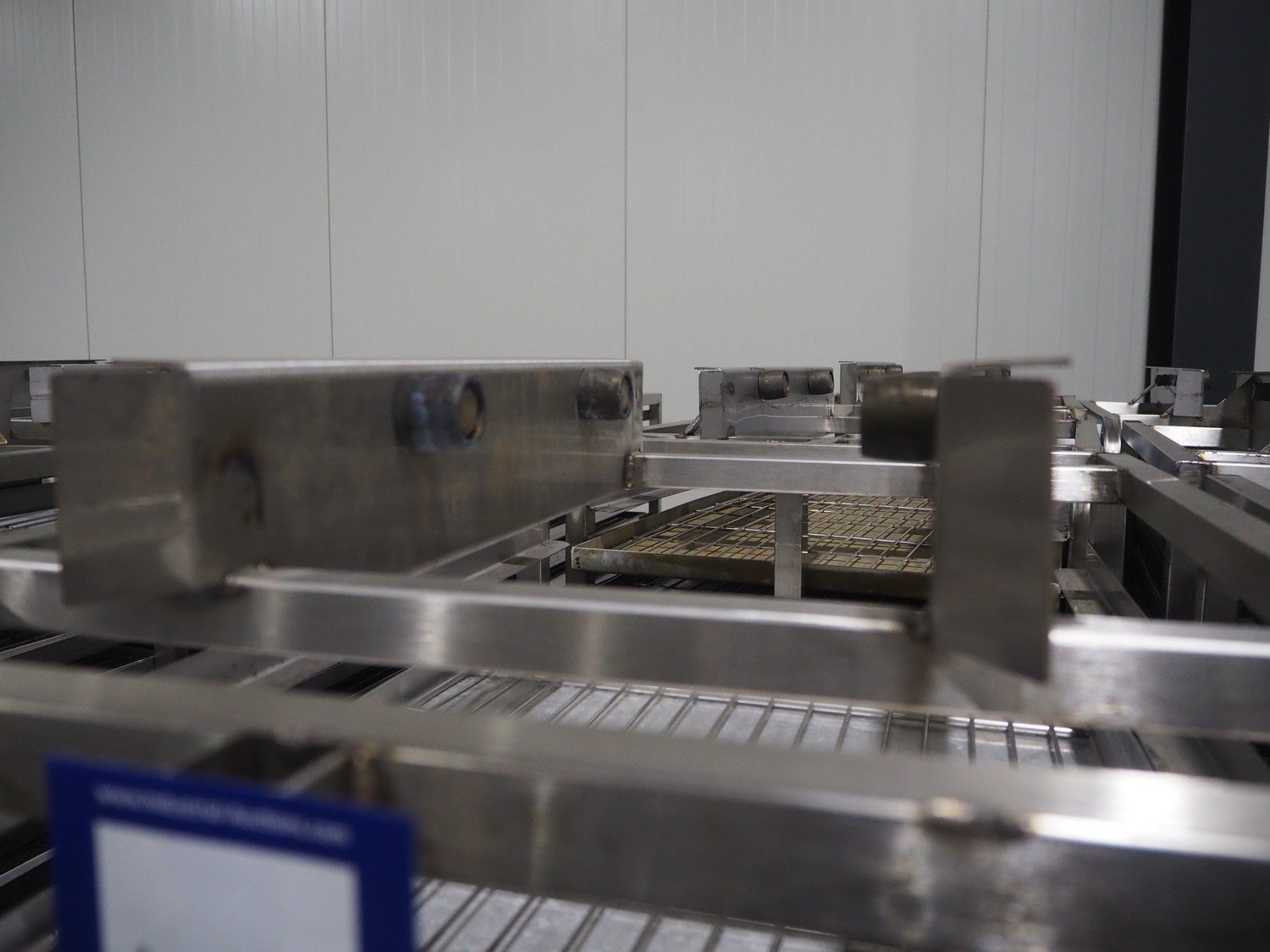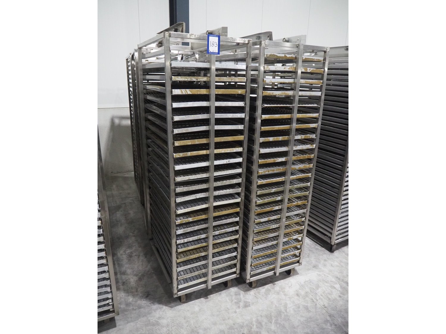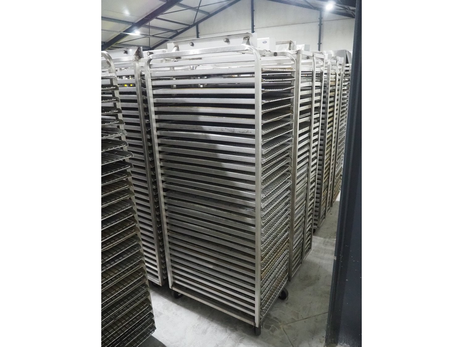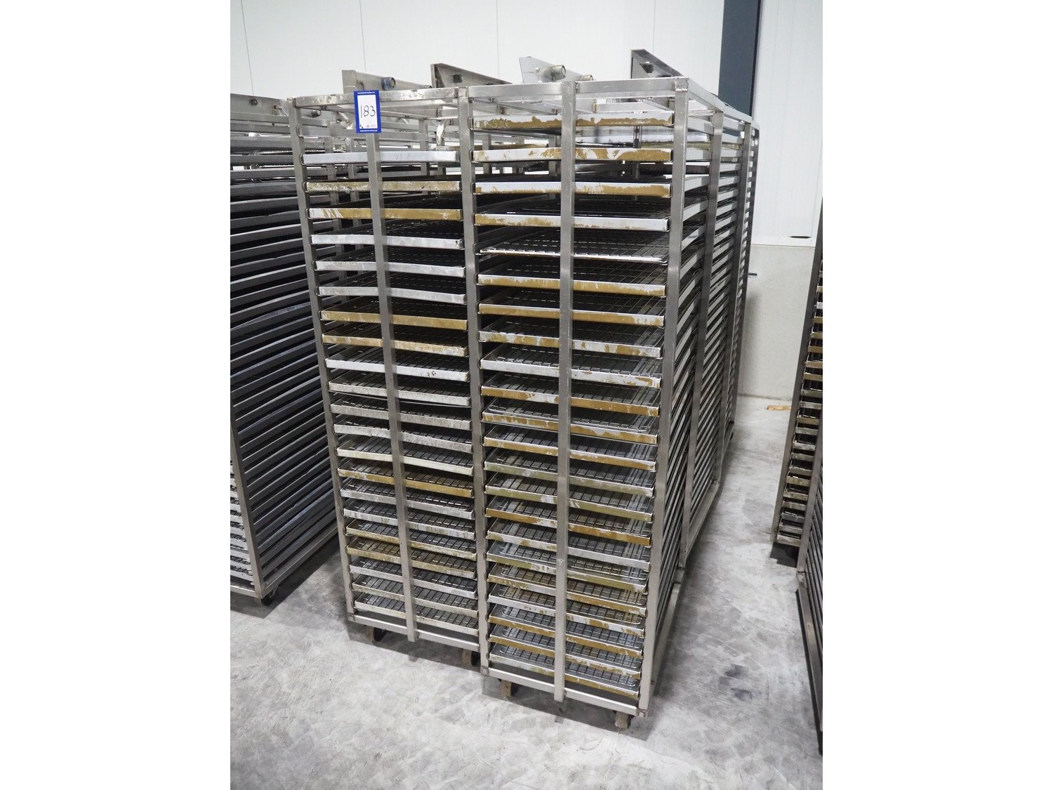 6 s/s trolleys for rotary oven, 32 floors, floor dimensions: 760 mm x 460 mm, total dimensions: (6x) 770 mm x 530 mm x 1830 mm.