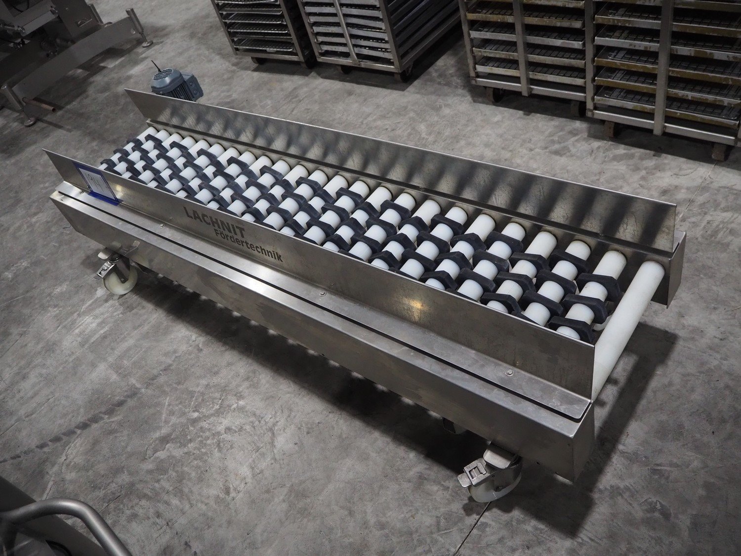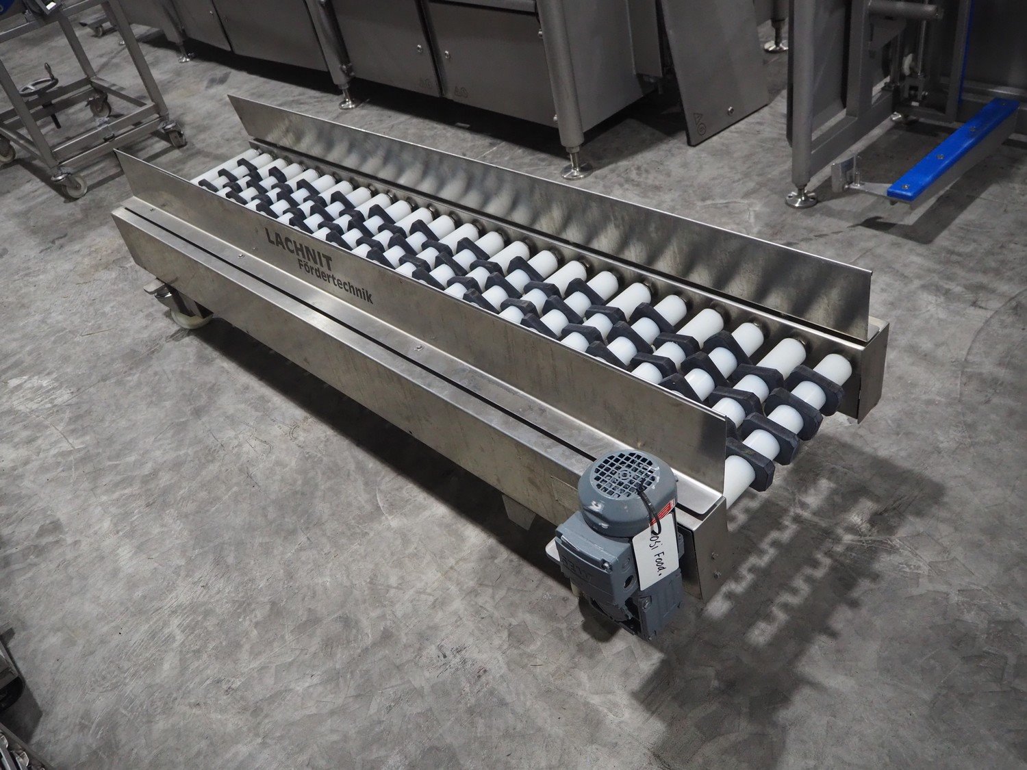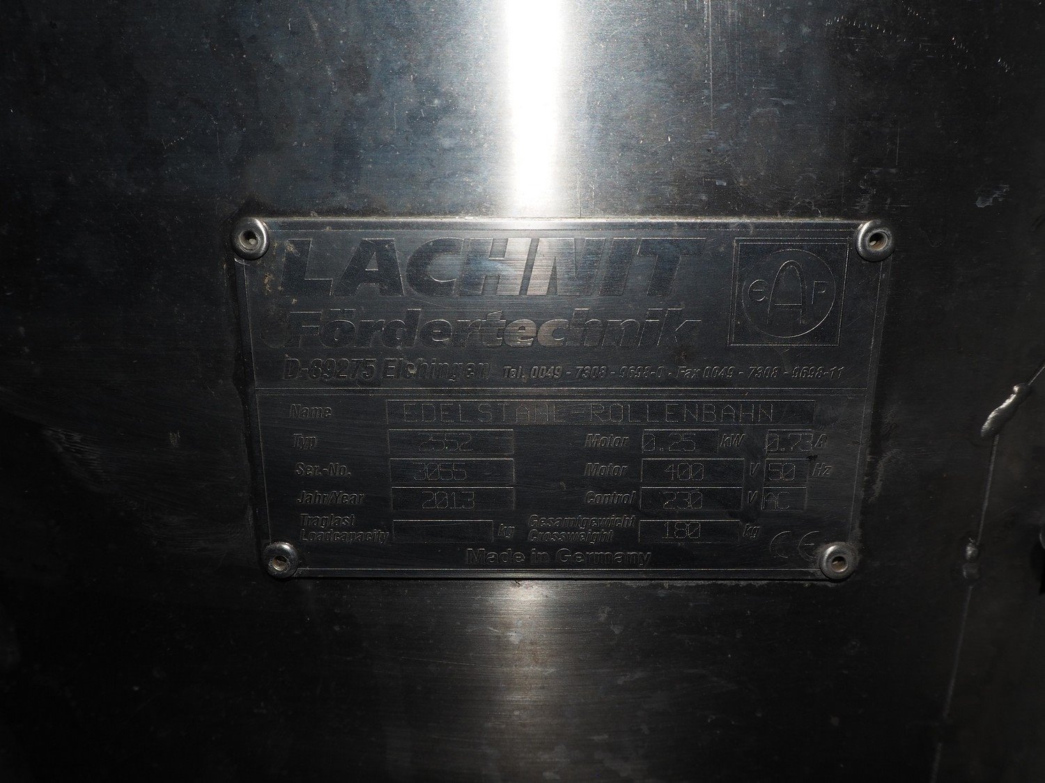 Lachnit driven roller conveyor, type: 2552, serial number: 3055, year of construction: 2013, 400/230 V, 50 Hz, 0.25 kW, weight: 180 kg, plastic rollers, roller width: 380 mm, total dimensions: 2030 mm x 800 mm x 530 mm.