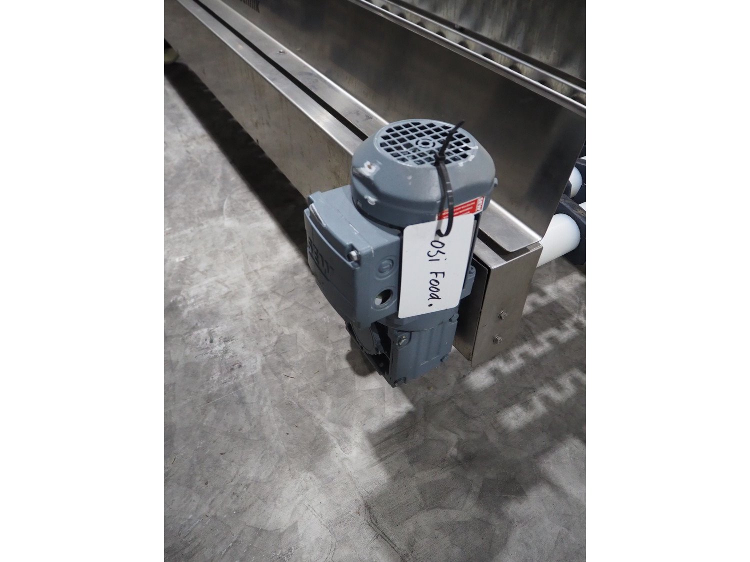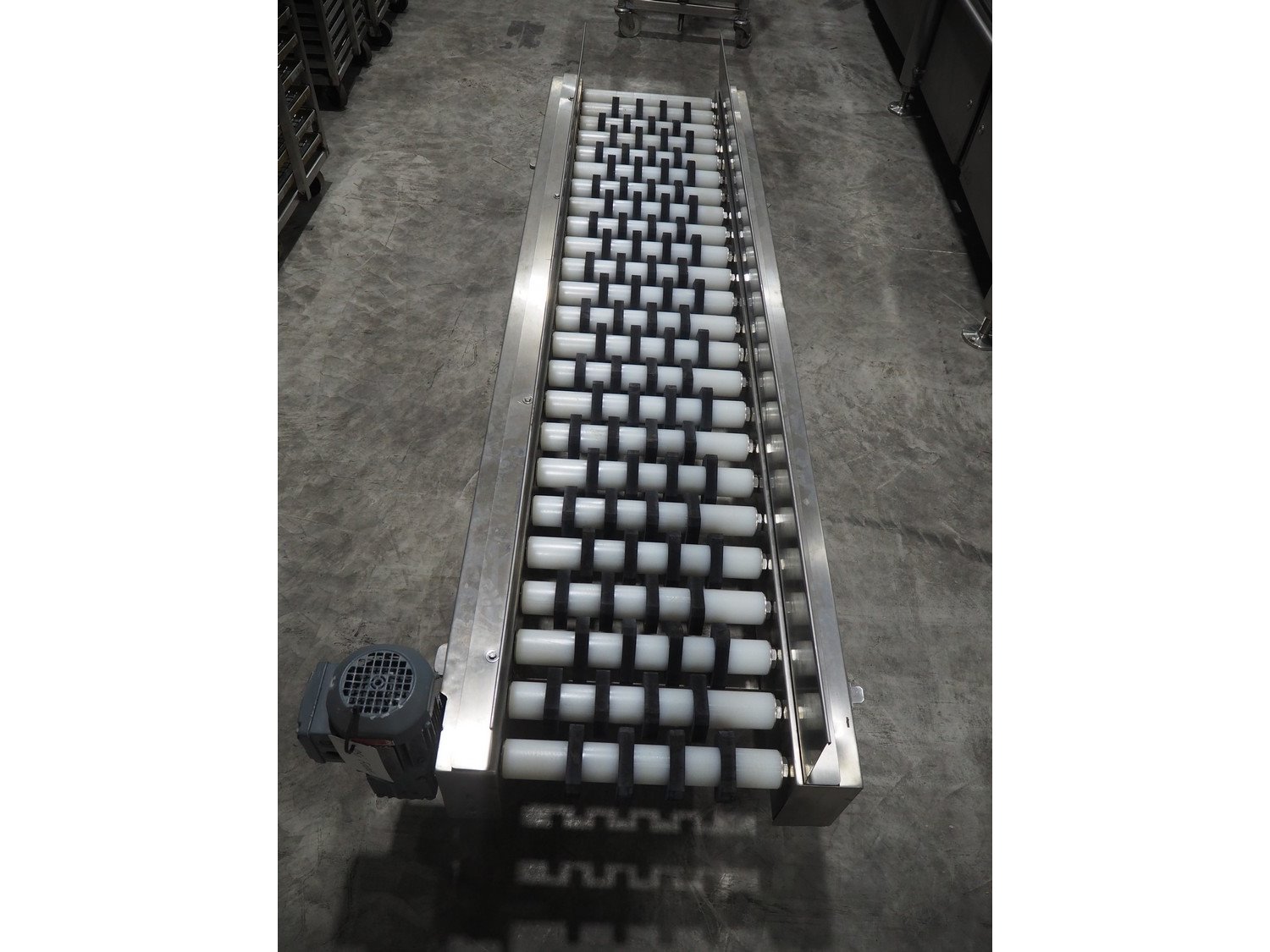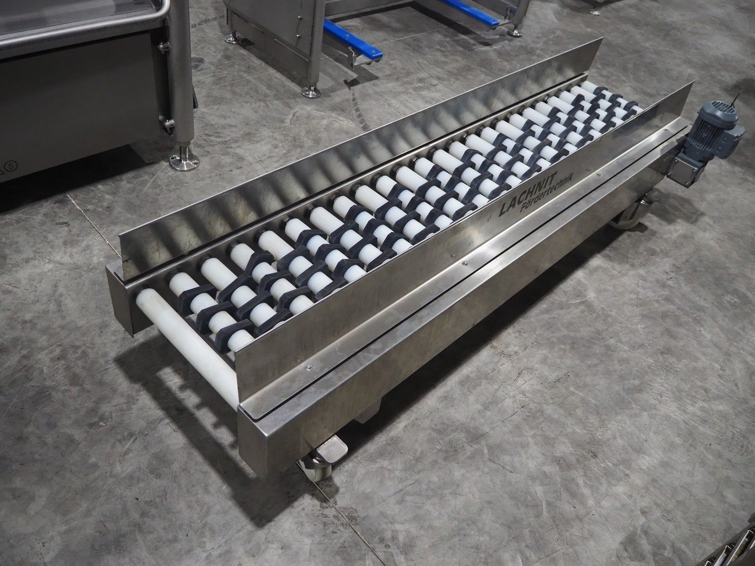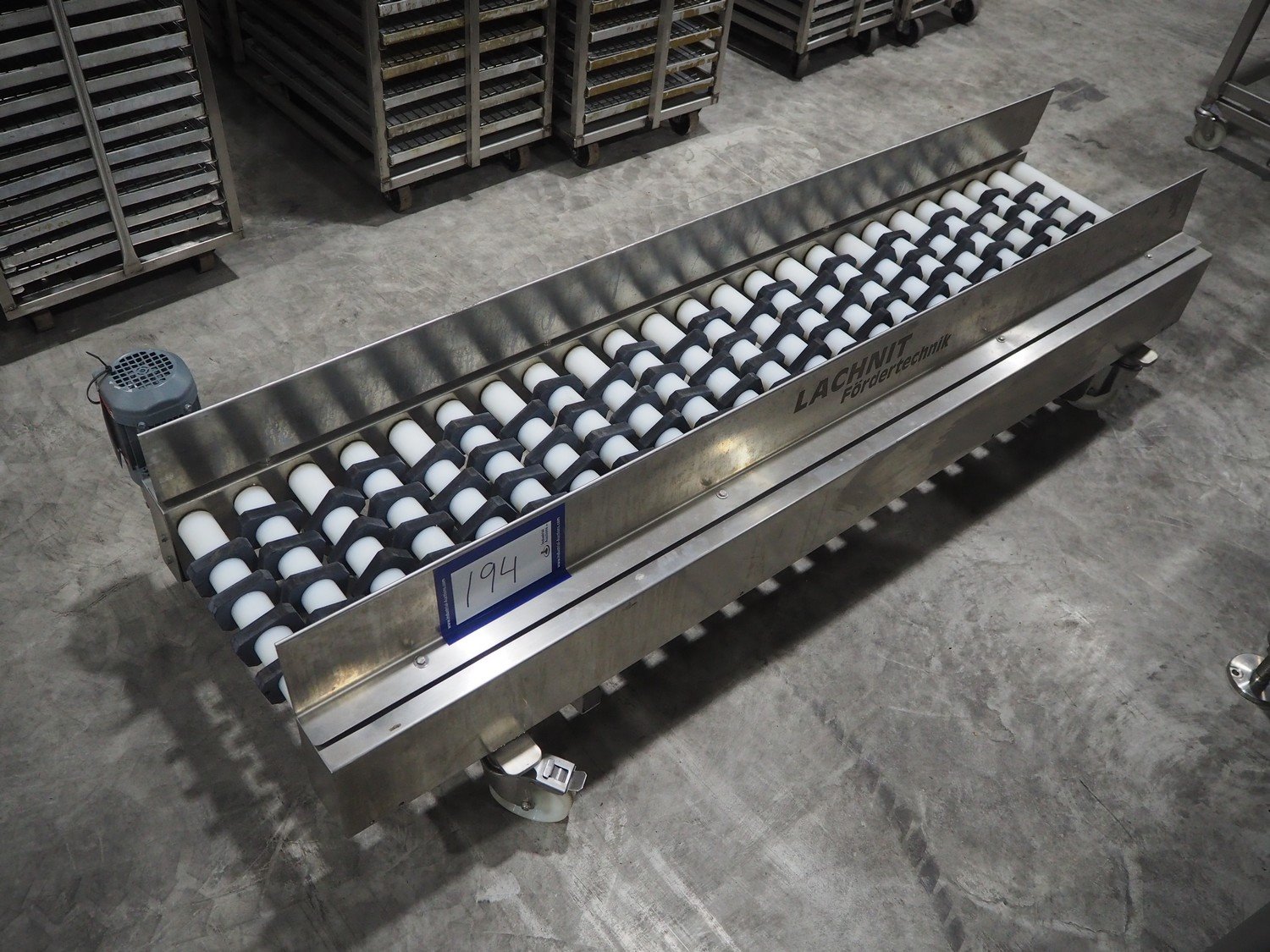Lachnit driven roller conveyor, type: 2552, serial number: 3055, year of construction: 2013, 400/230 V, 50 Hz, 0.25 kW, weight: 180 kg, plastic rollers, roller width: 380 mm, total dimensions: 2030 mm x 800 mm x 530 mm.
