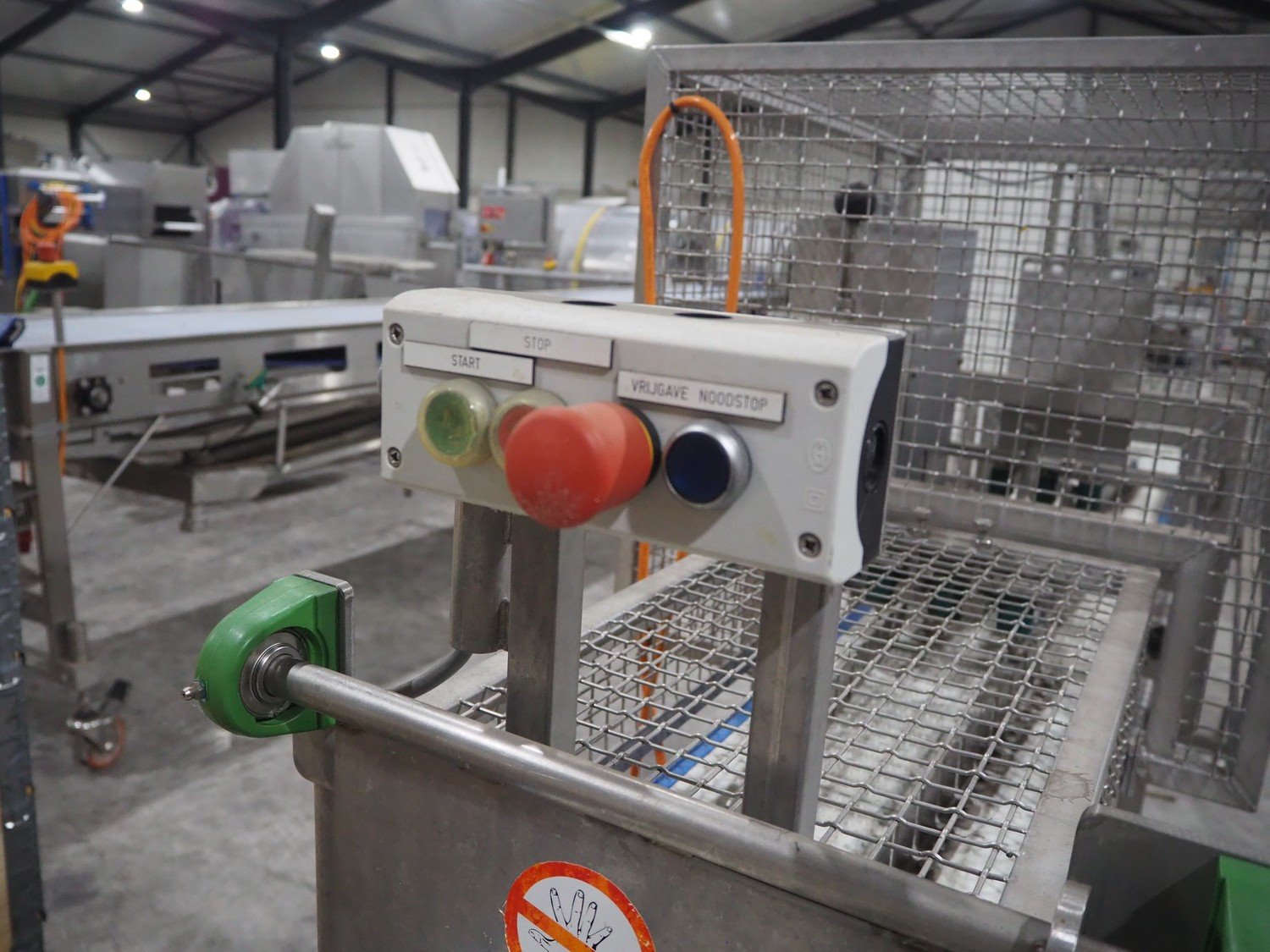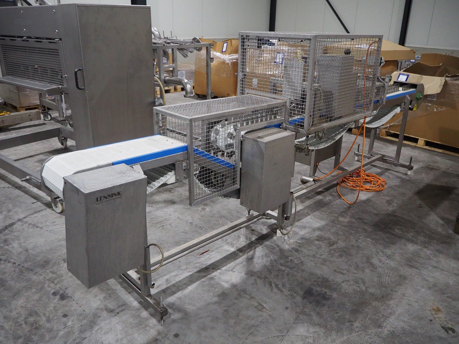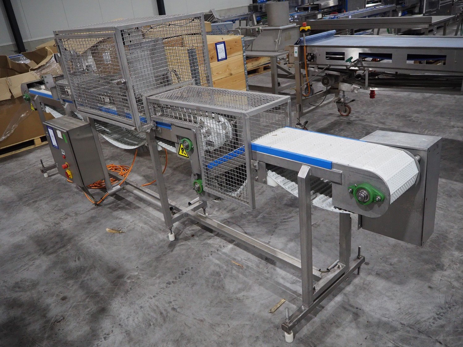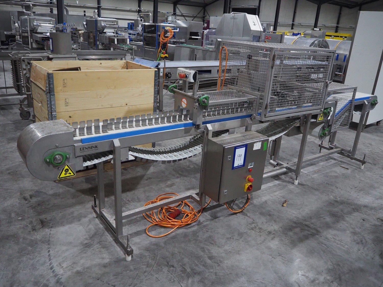 Lensink fish slicing line, plastic belt, belt width: 250 mm, dimensions: 4300 mm x 1000 mm x 1600 mm.