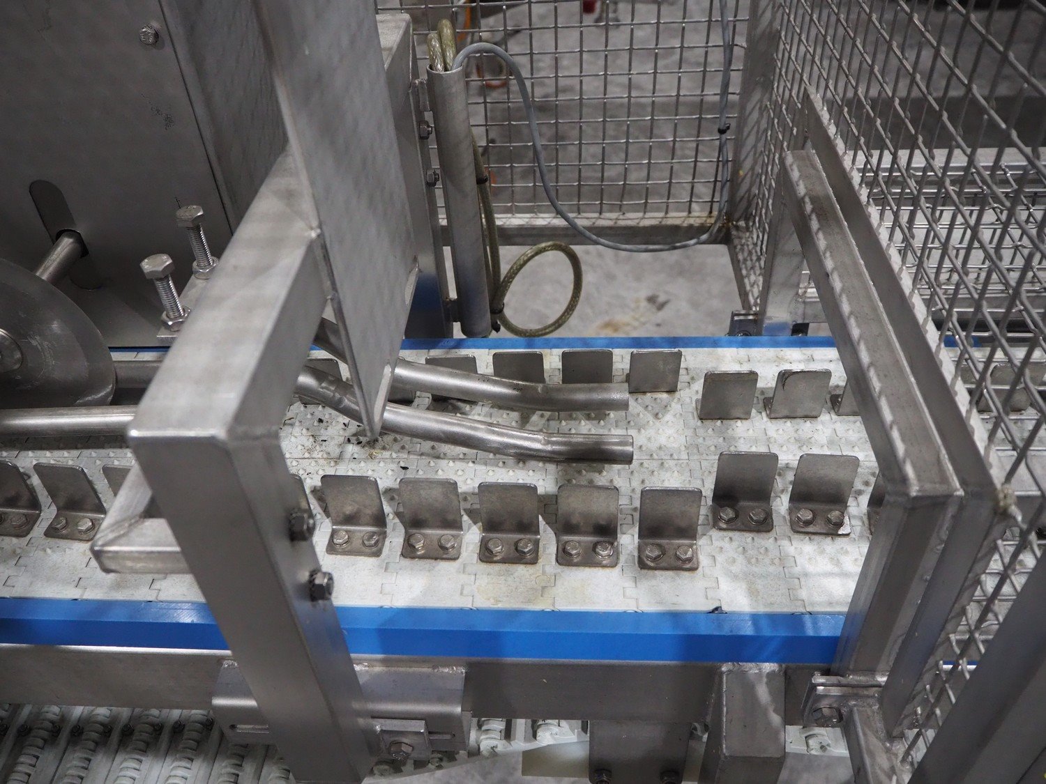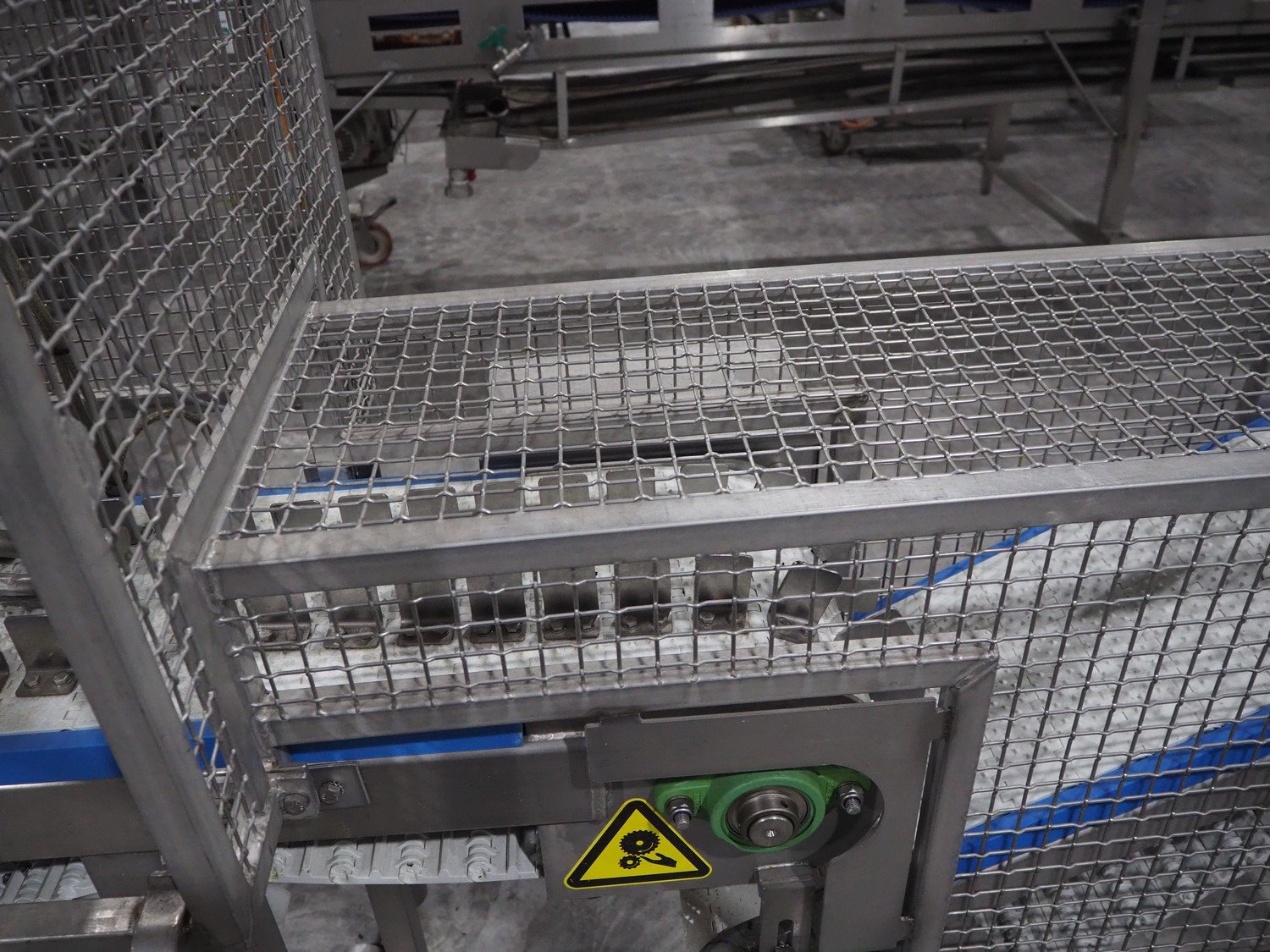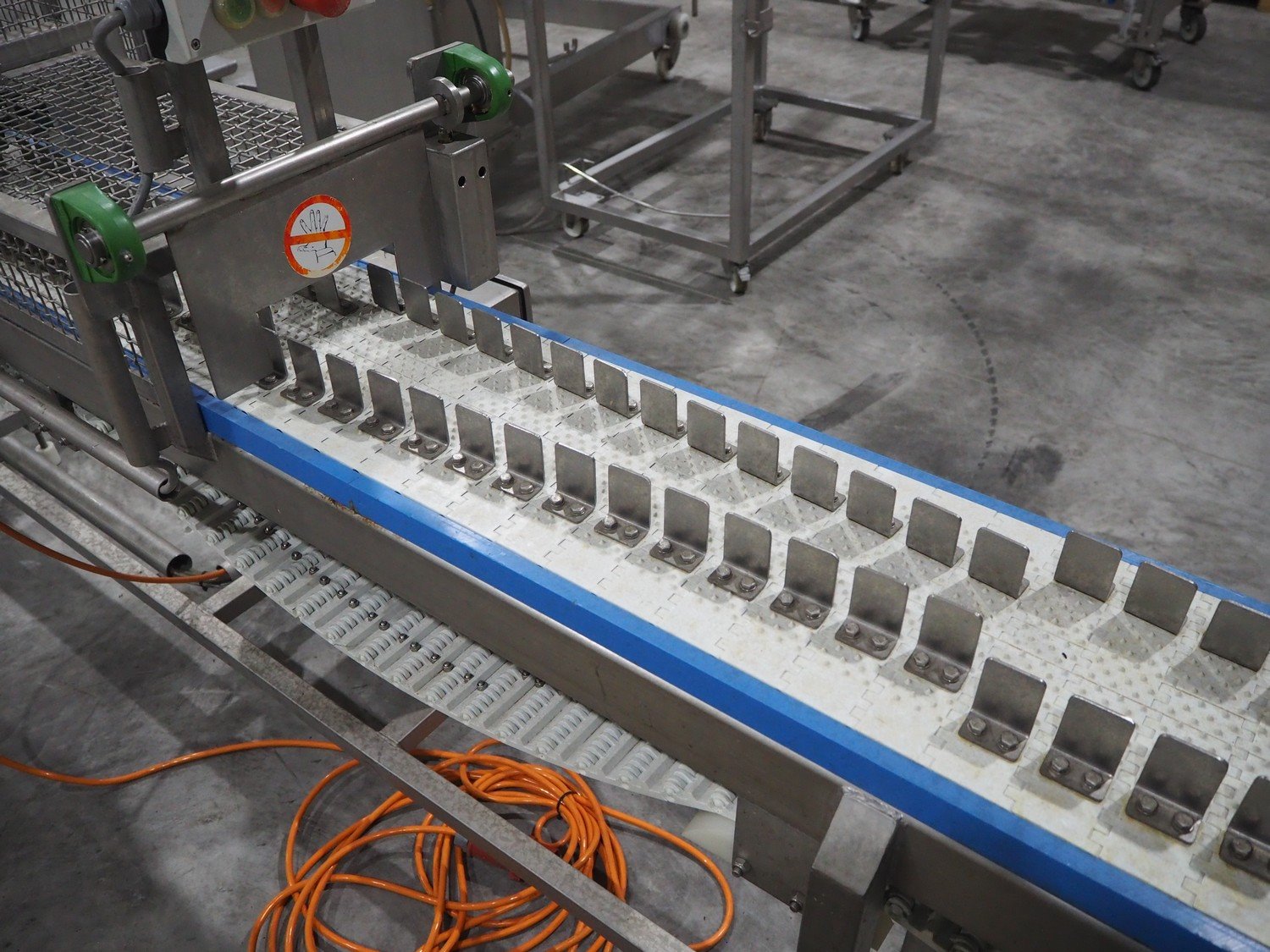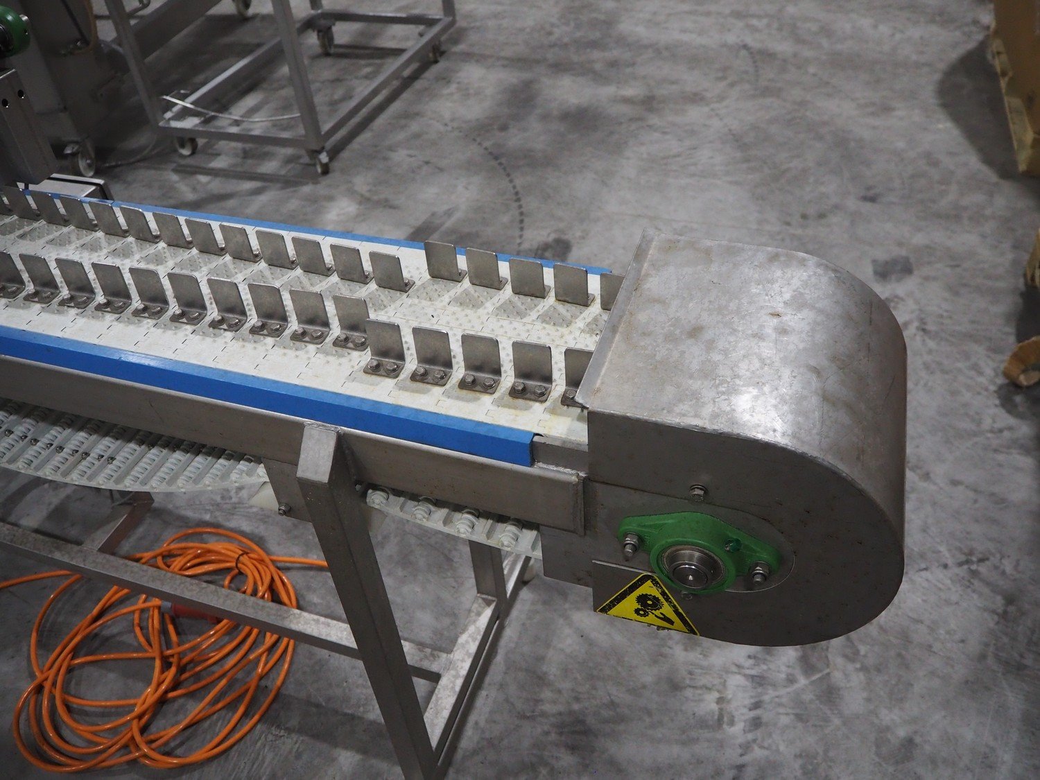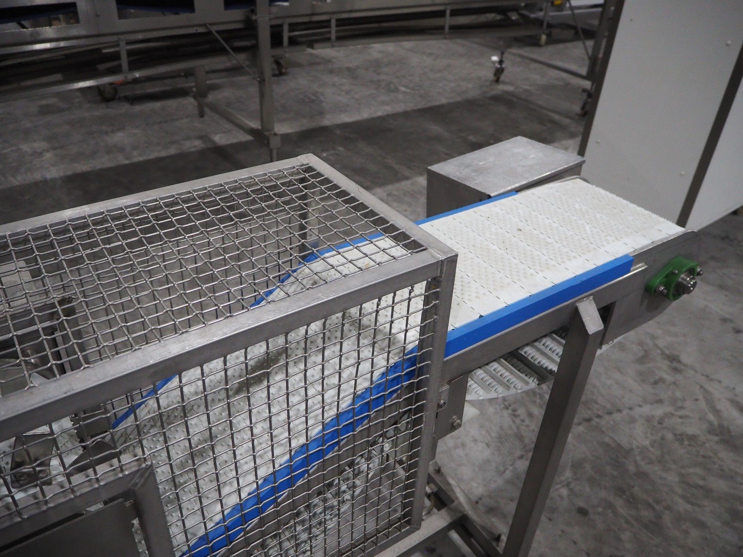 Lensink fish slicing line, plastic belt, belt width: 250 mm, dimensions: 4300 mm x 1000 mm x 1600 mm.