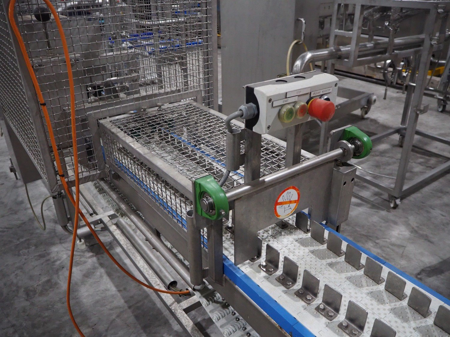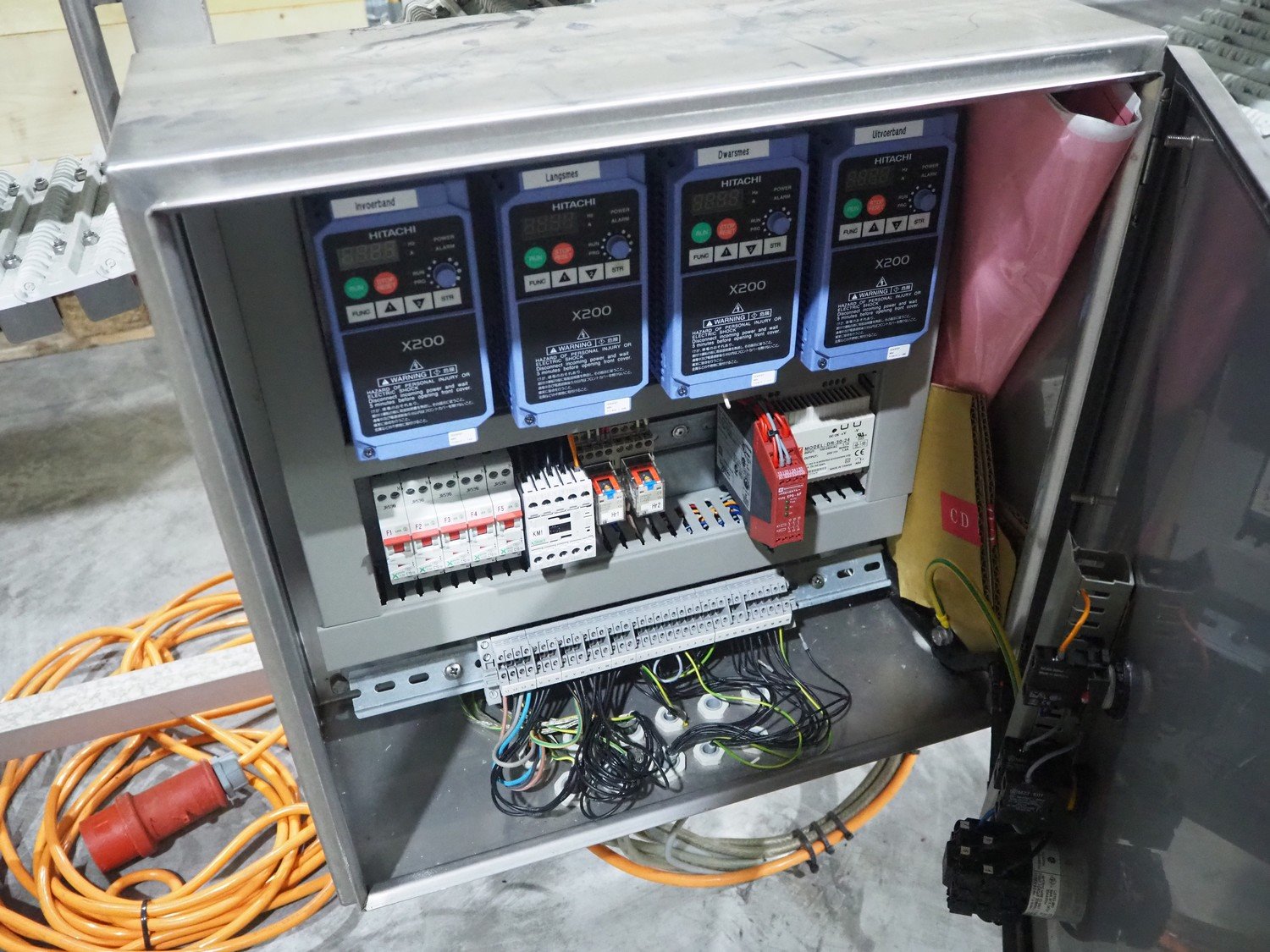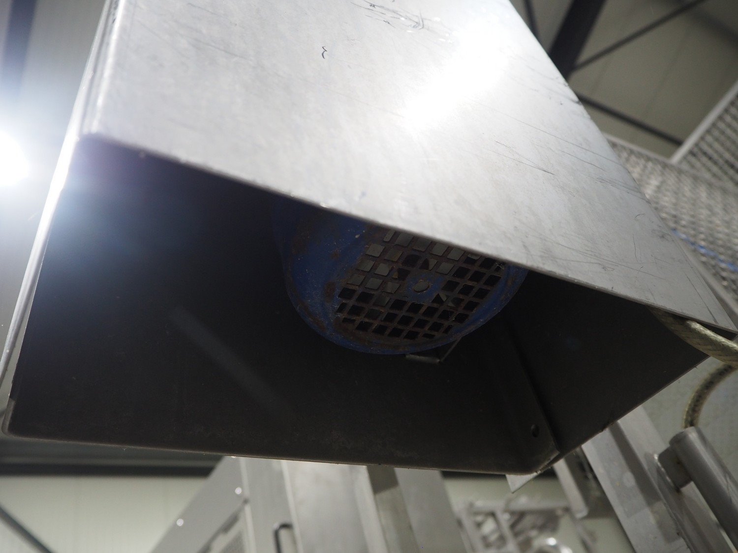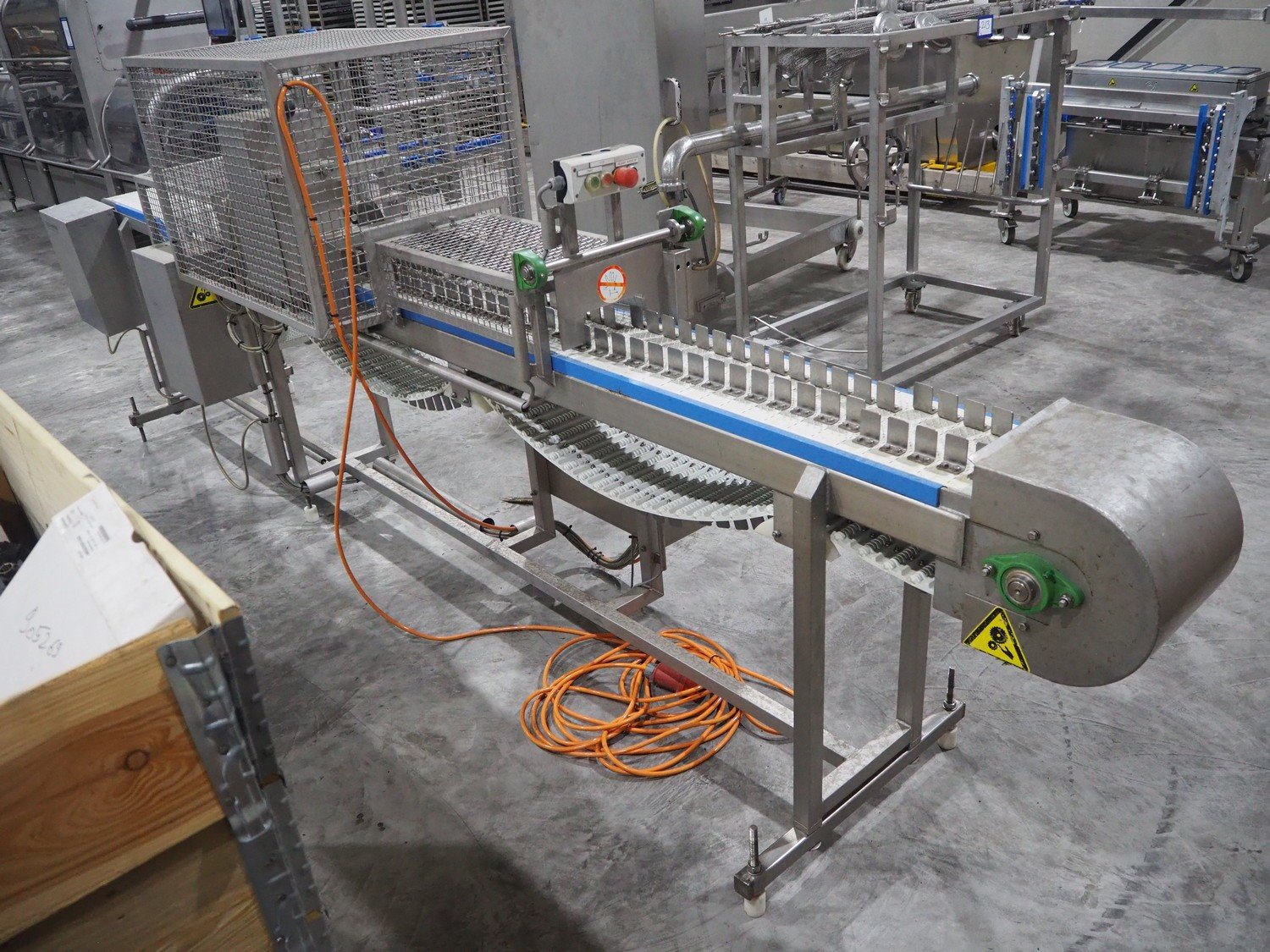 Lensink fish slicing line, plastic belt, belt width: 250 mm, dimensions: 4300 mm x 1000 mm x 1600 mm.