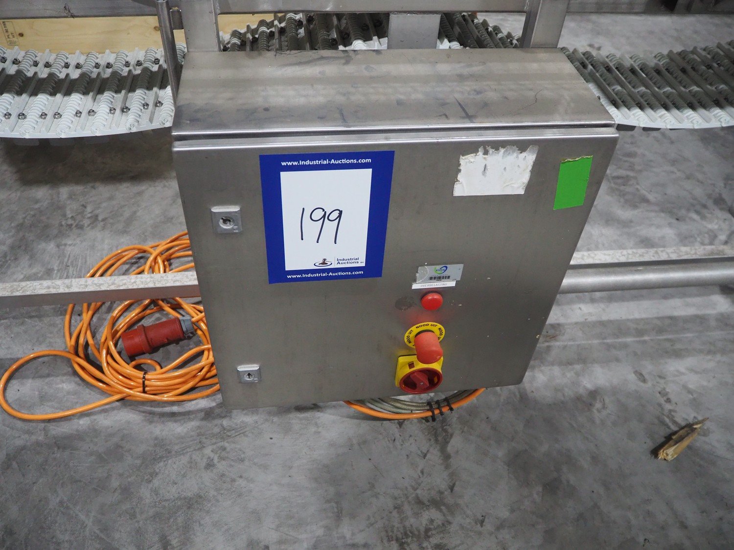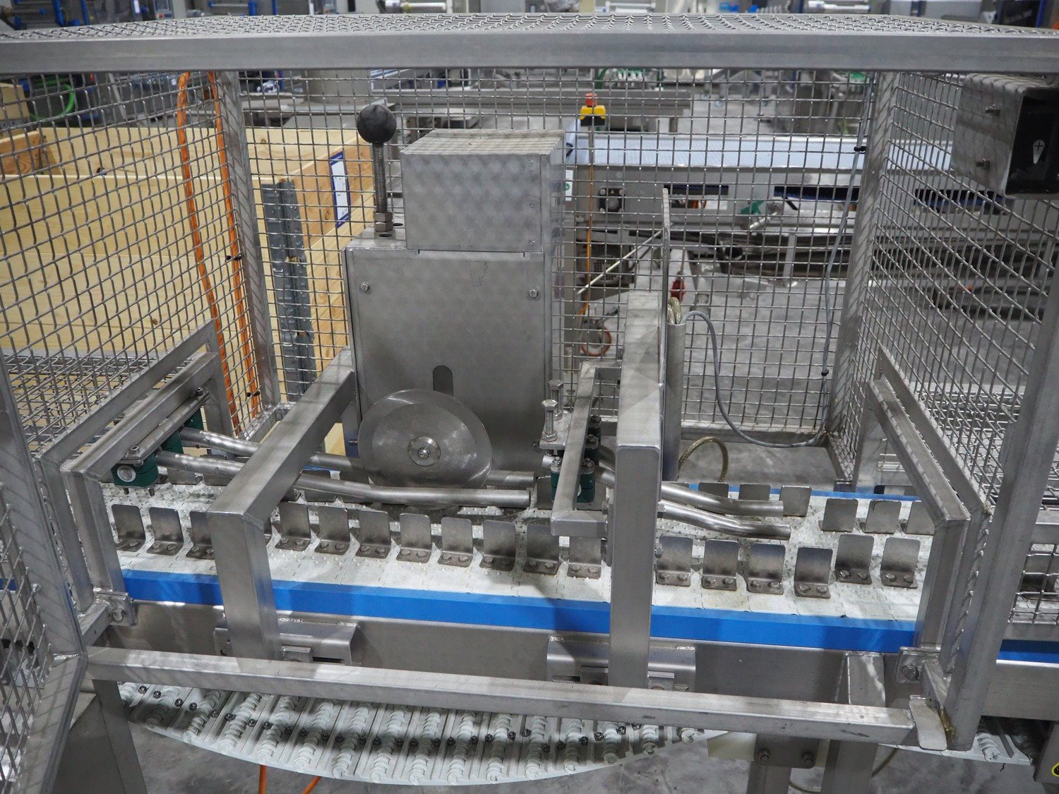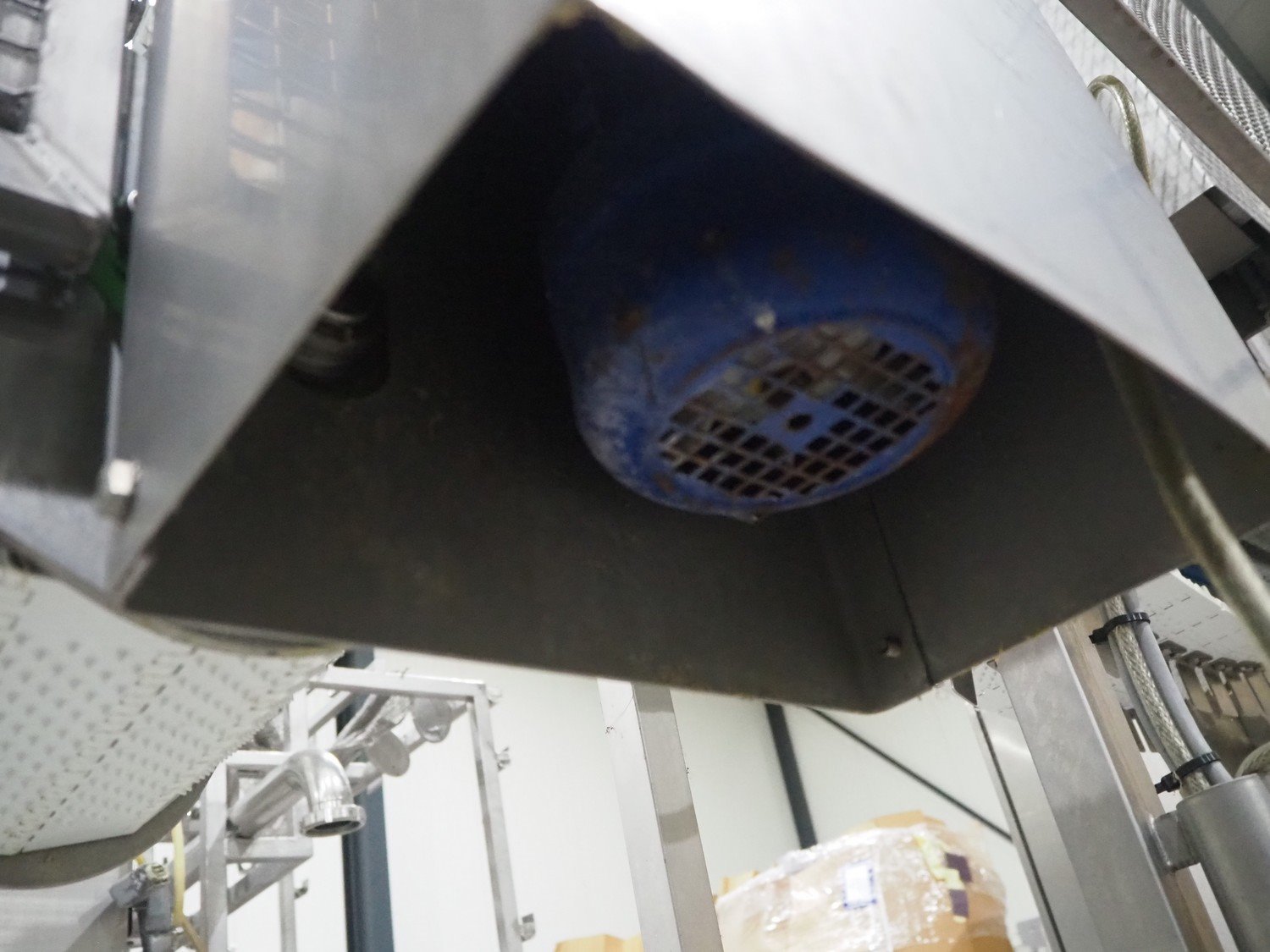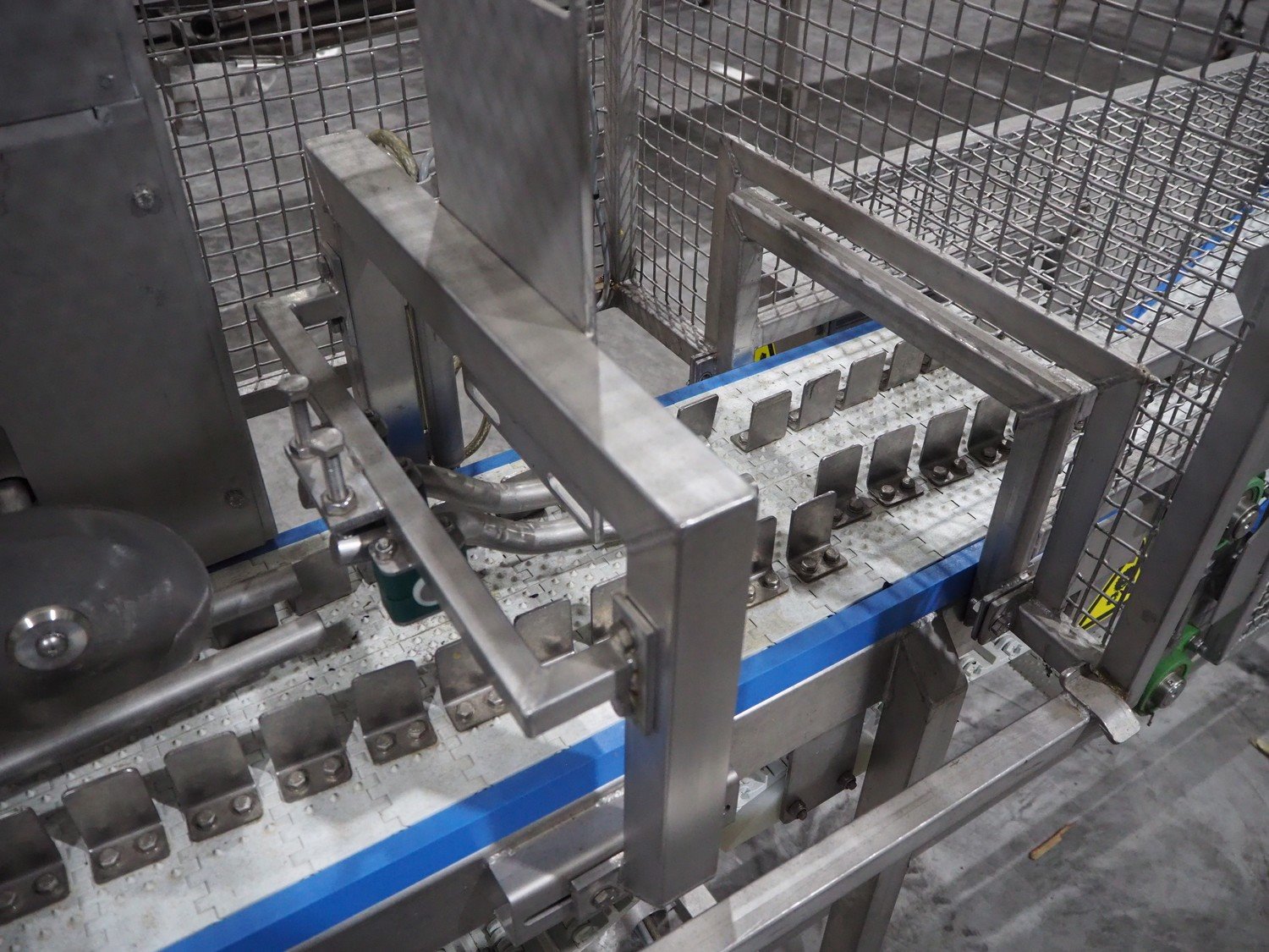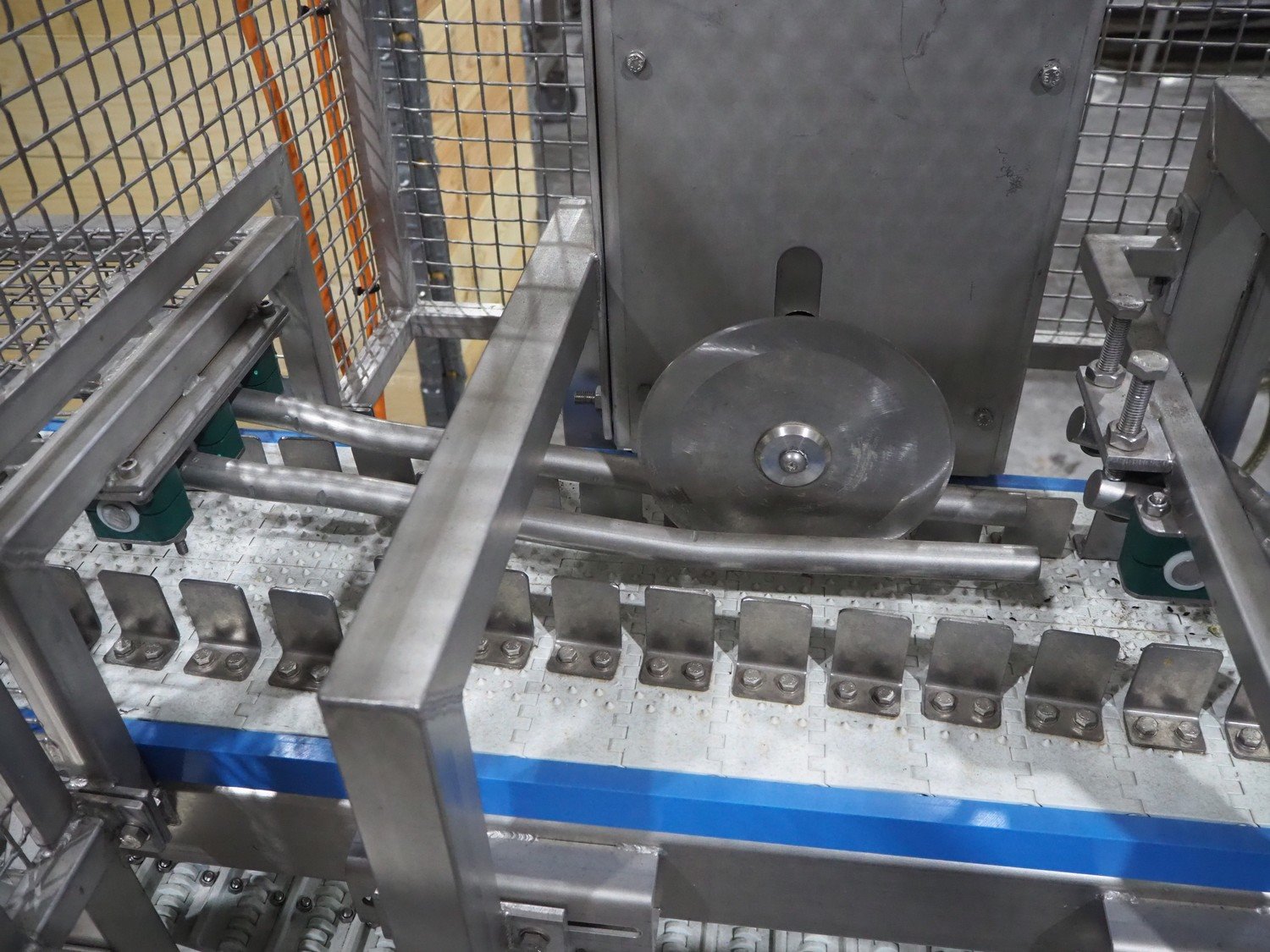Lensink fish slicing line, plastic belt, belt width: 250 mm, dimensions: 4300 mm x 1000 mm x 1600 mm.